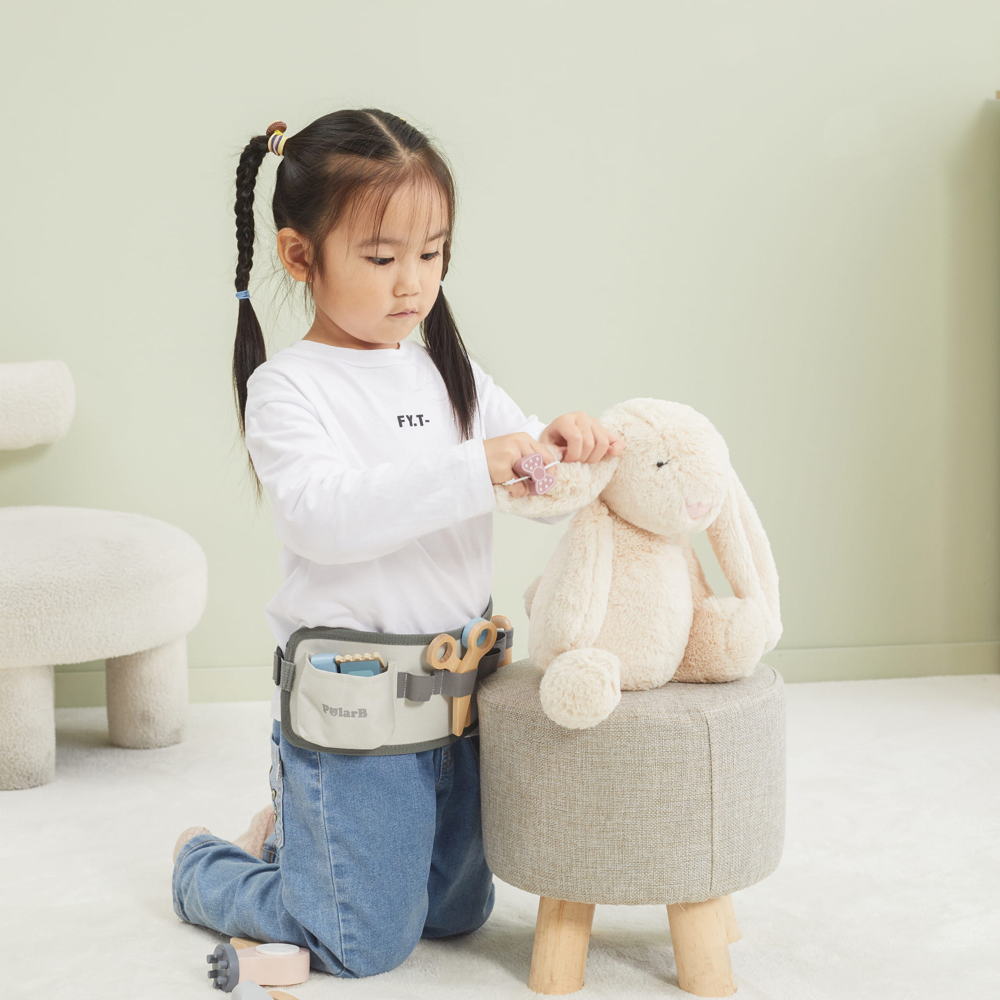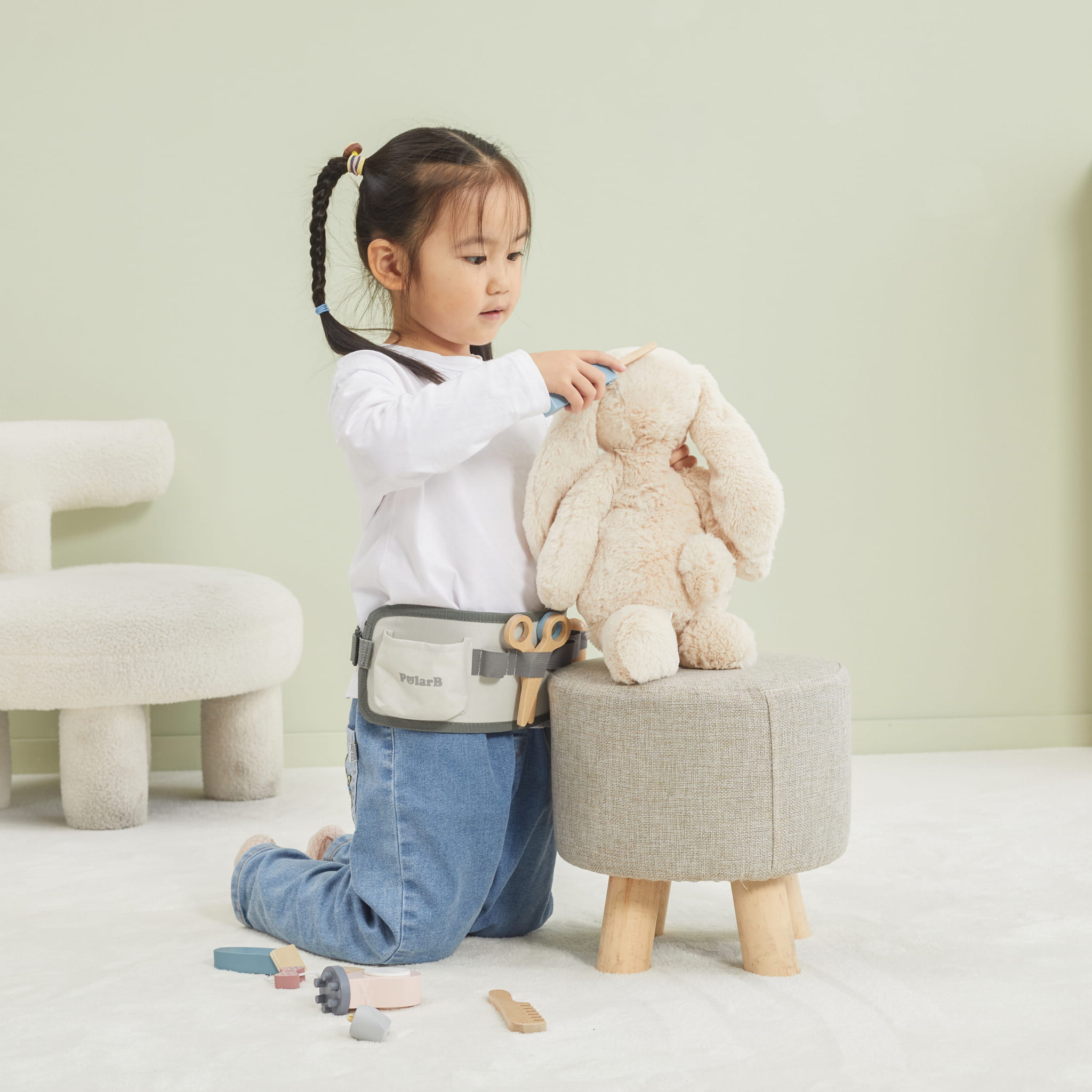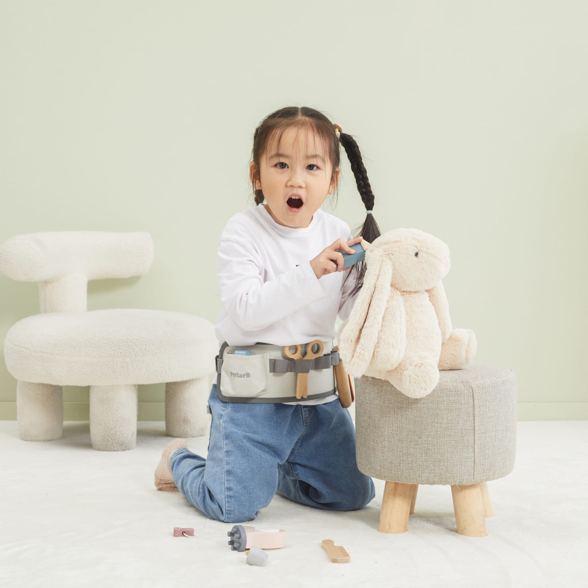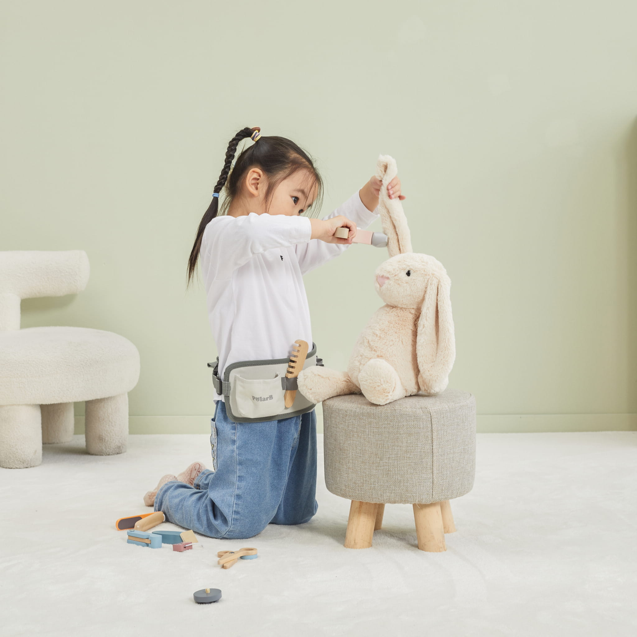 Zestaw zawiera regulowany pas, który ułatwia przenoszenie wszystkich narzędzi i utrzymanie porządku podczas zabawy. Wszystkie elementy wykonano z drewna i pomalowano nietoksycznymi farbami, zapewniając bezpieczeństwo i trwałość.