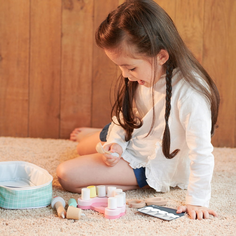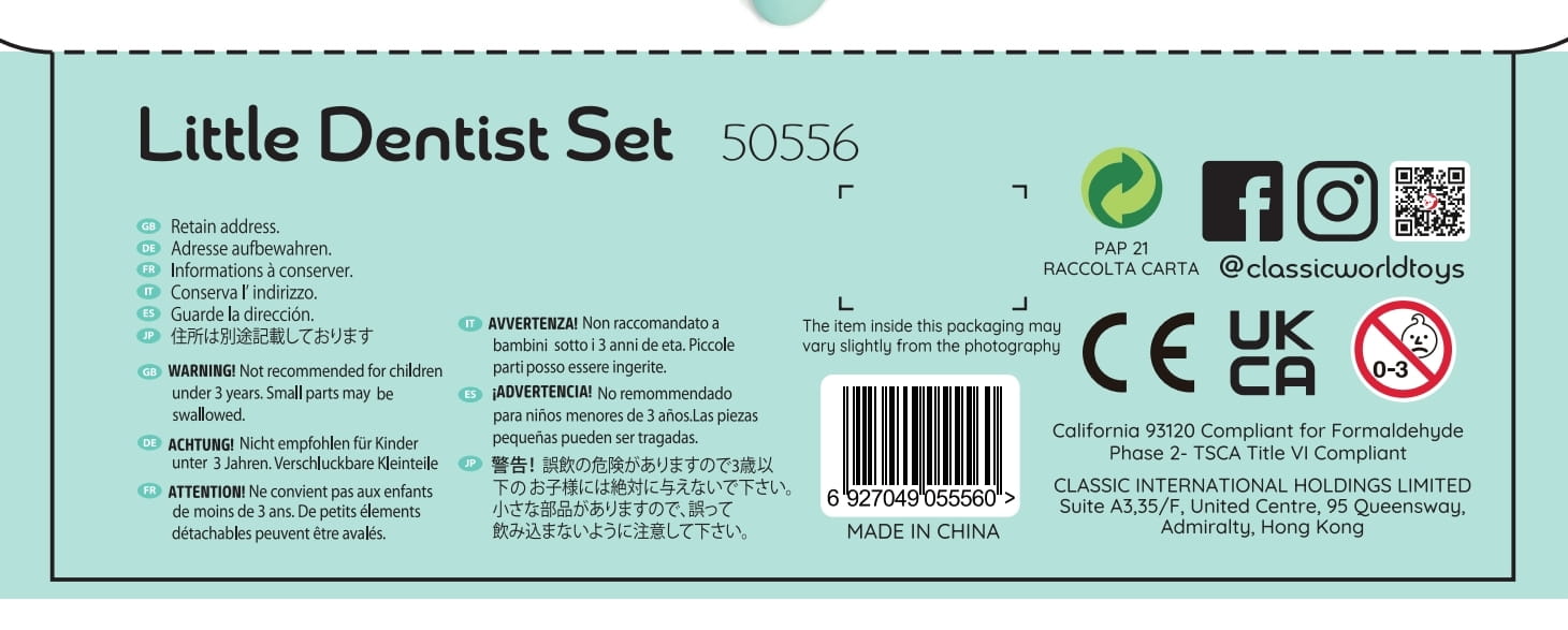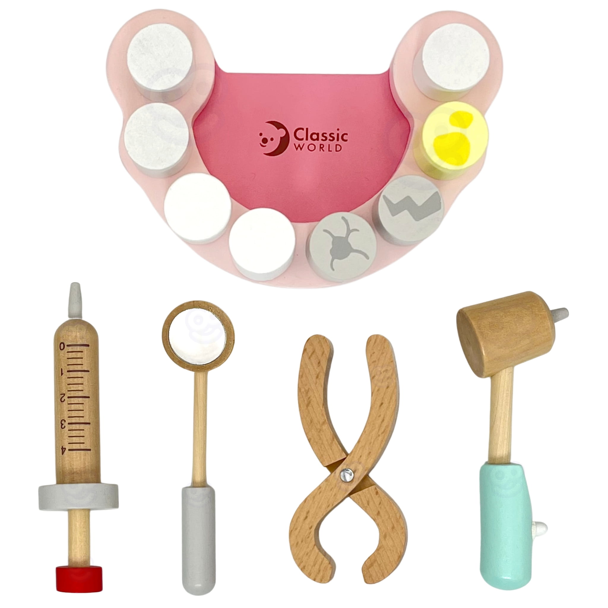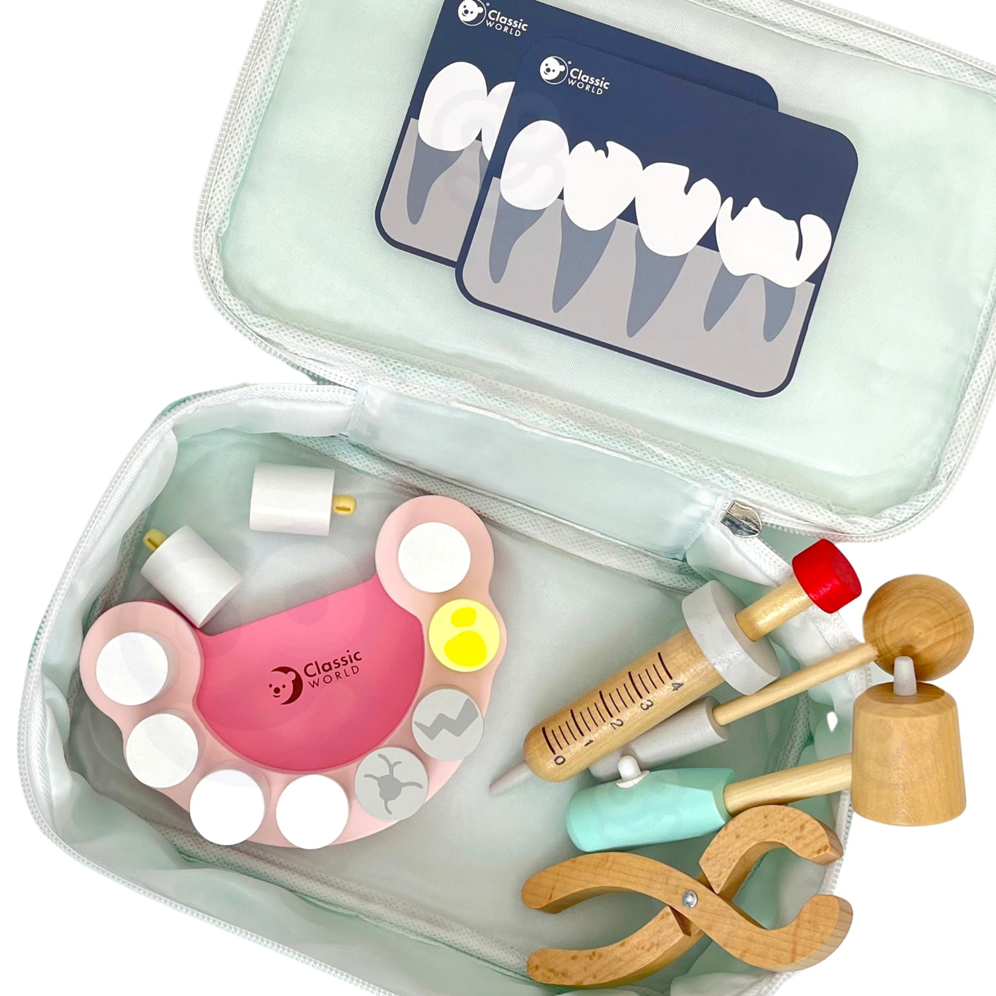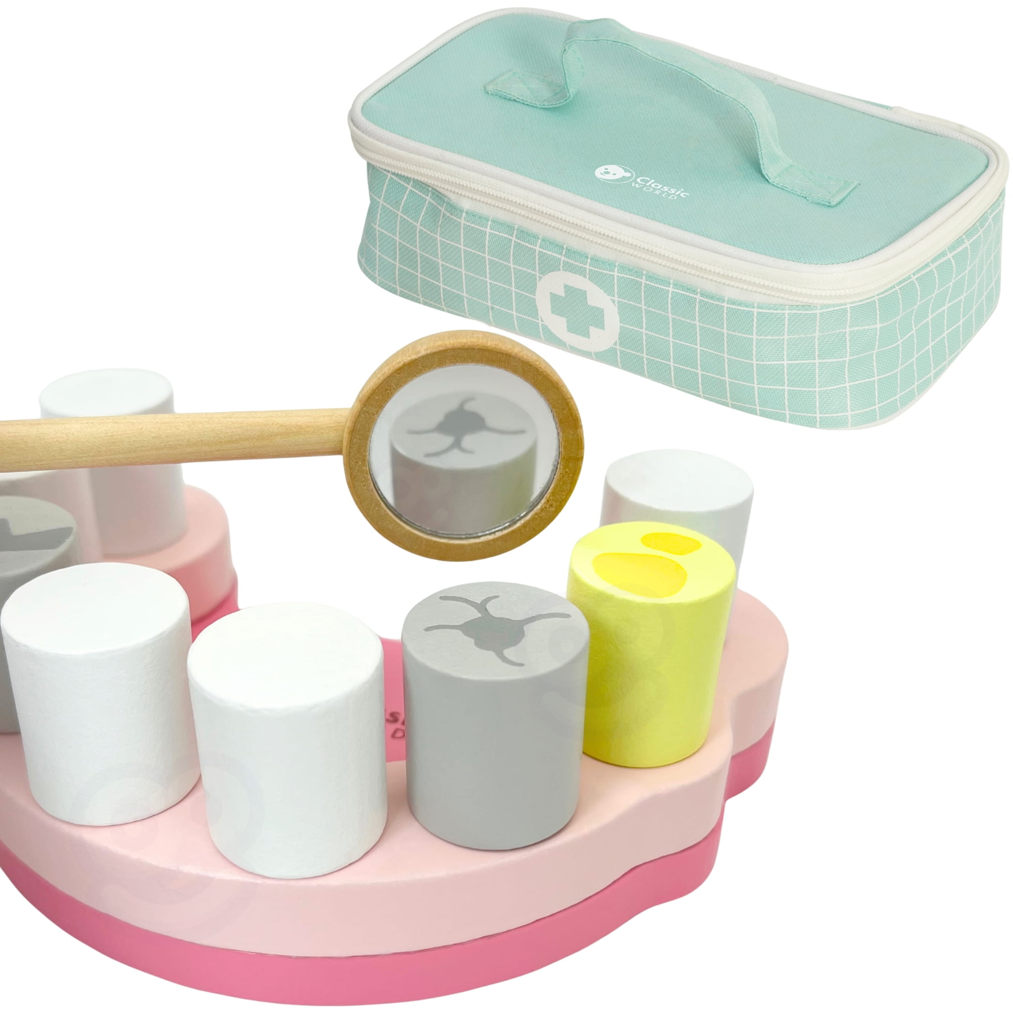 Drewniany zestaw dentysty dla dzieci 3+. 18 elementów w walizce do zabawy w gabinet stomatologiczny – rozwija empatię i pomaga oswoić wizytę u dentysty.