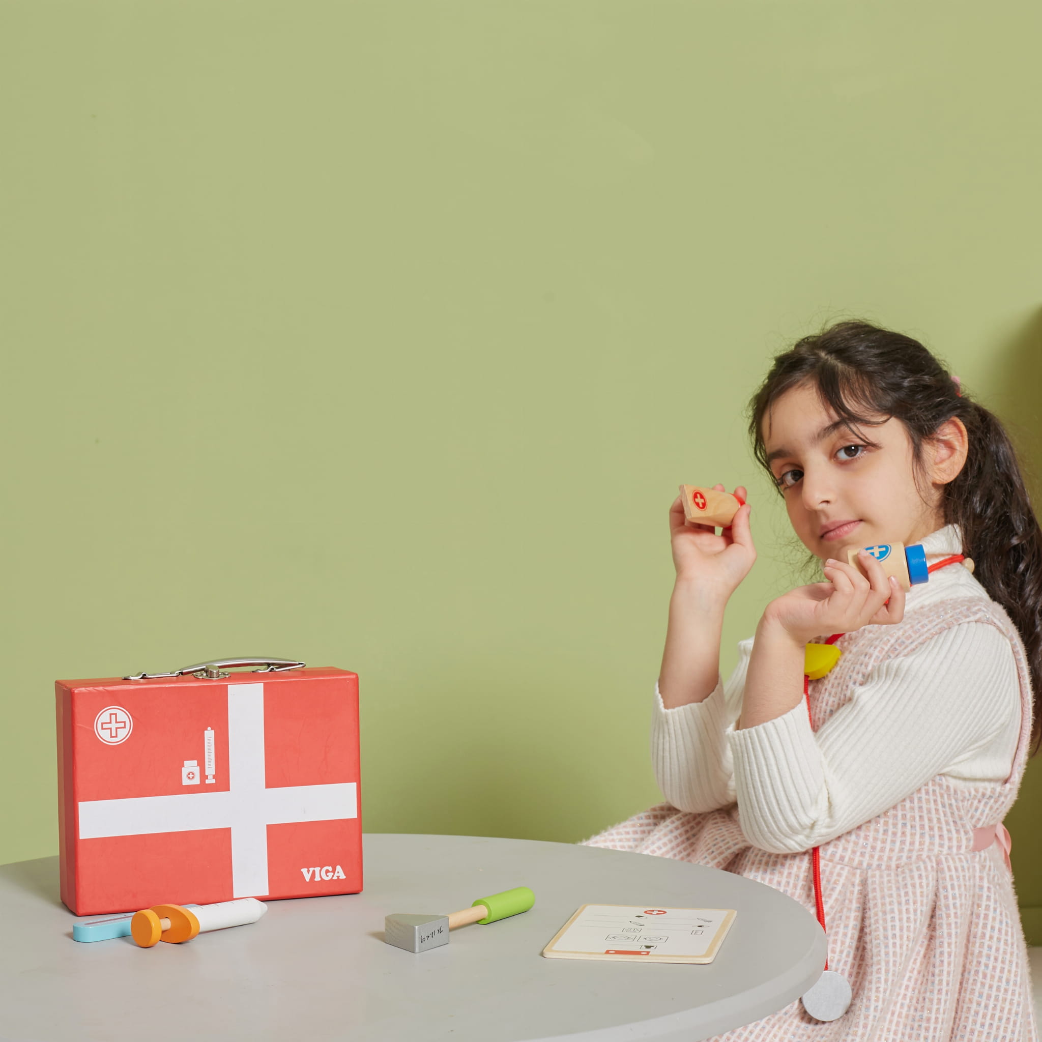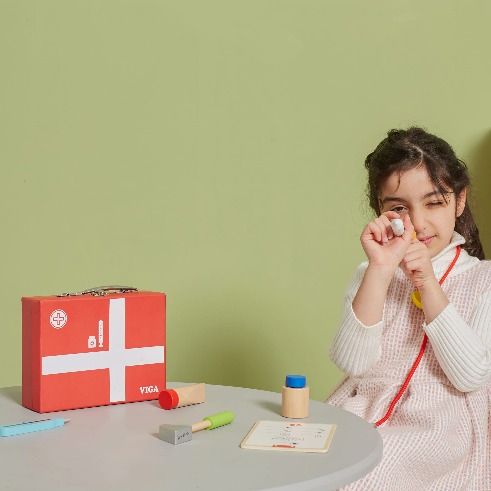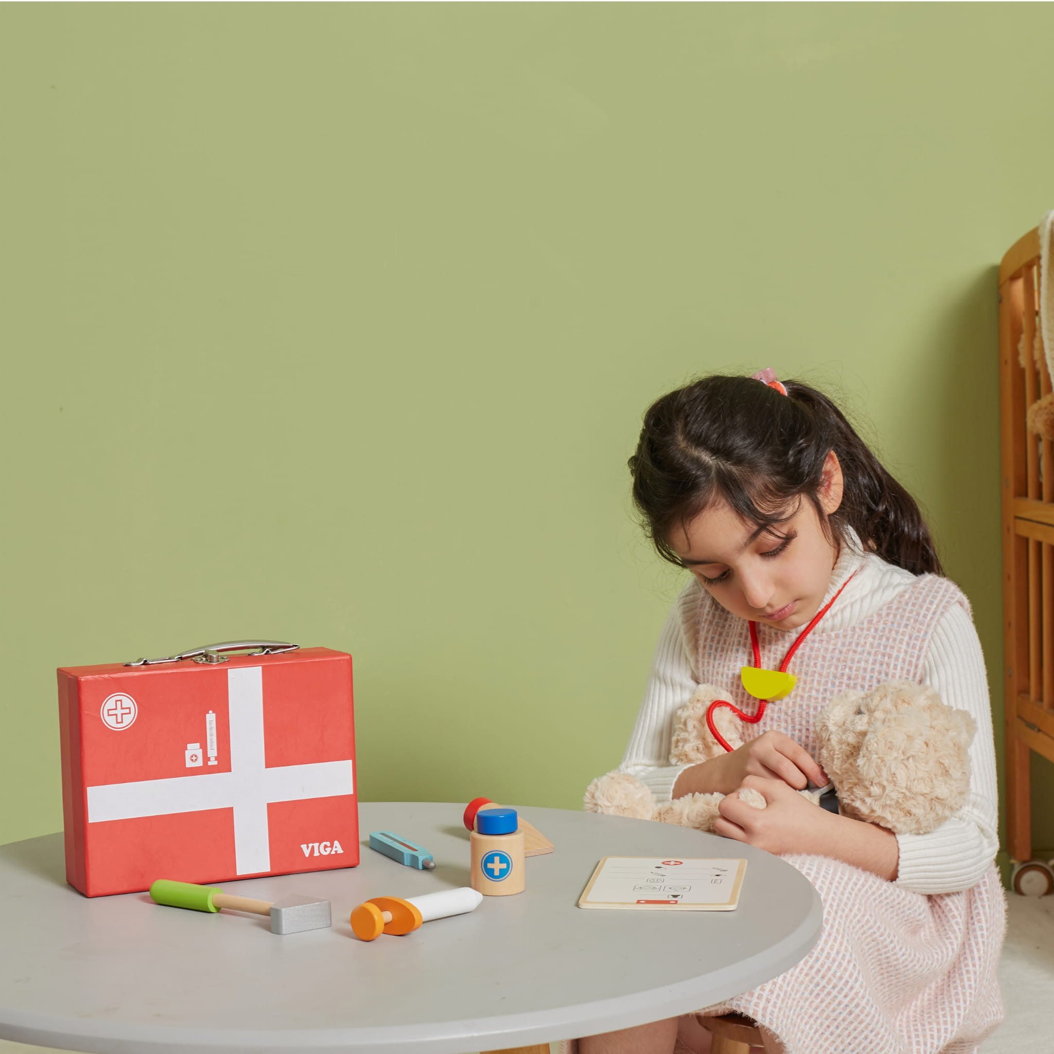 Drewniany zestaw lekarza dla dzieci 3+. Edukacyjna zabawka do odgrywania ról, która rozwija empatię, wyobraźnię i pomaga oswoić wizytę u lekarza.