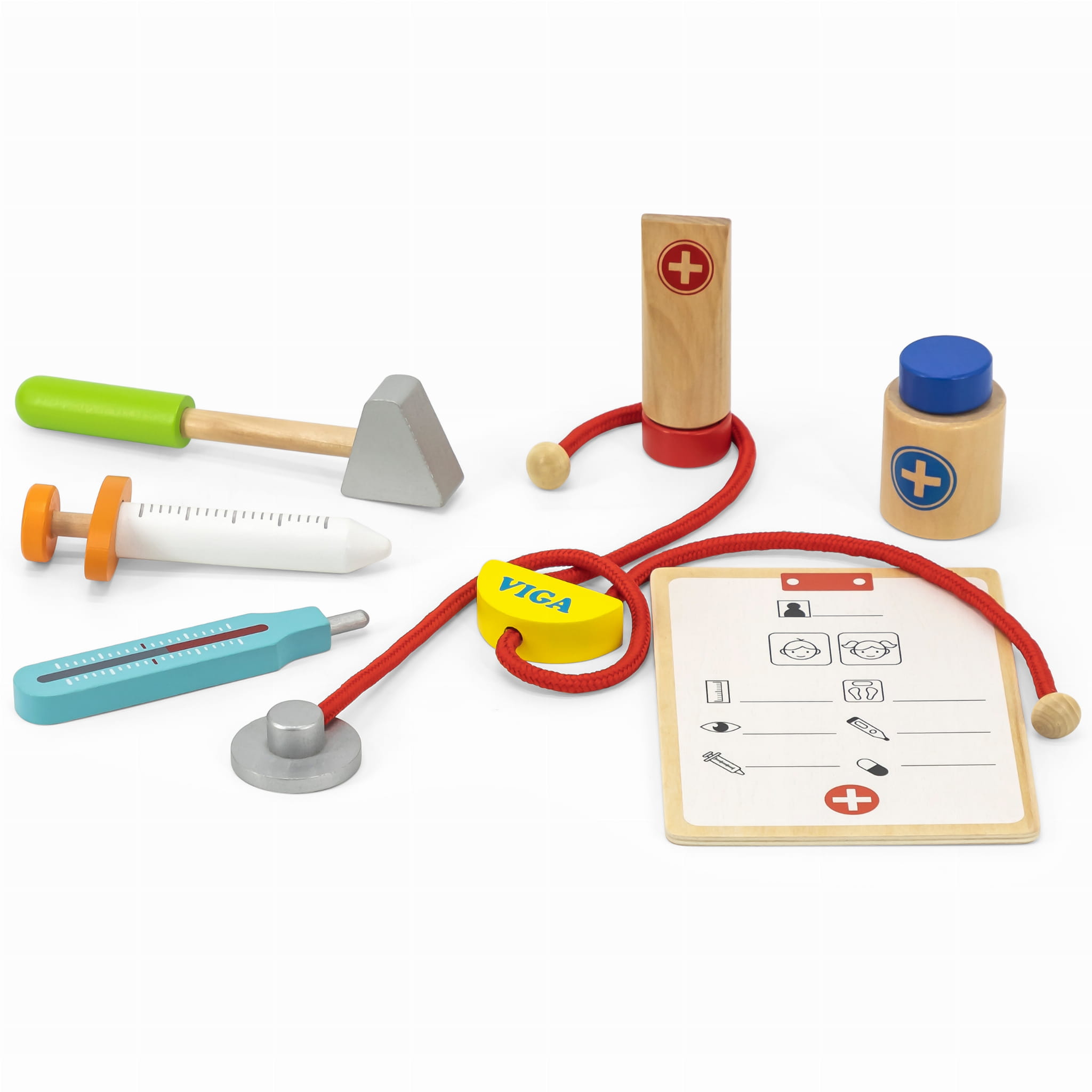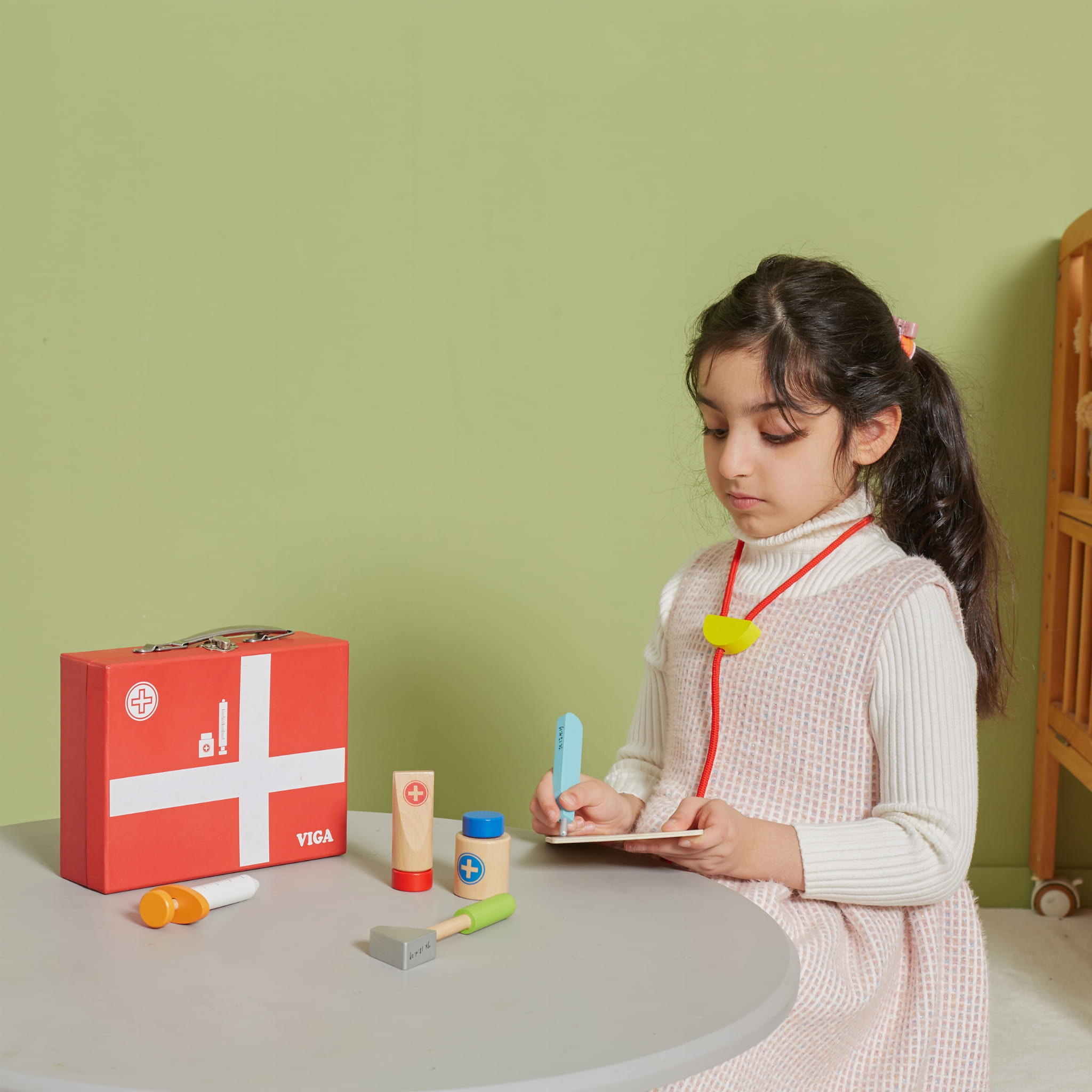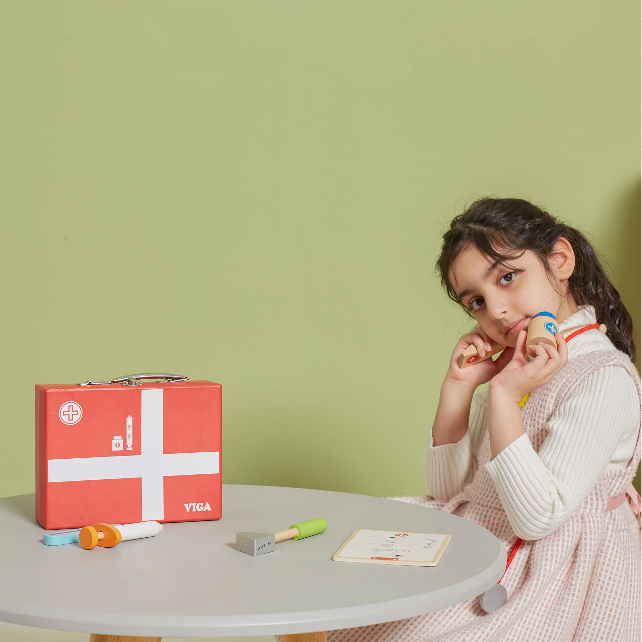 Drewniany zestaw lekarza dla dzieci 3+. Edukacyjna zabawka do odgrywania ról, która rozwija empatię, wyobraźnię i pomaga oswoić wizytę u lekarza.