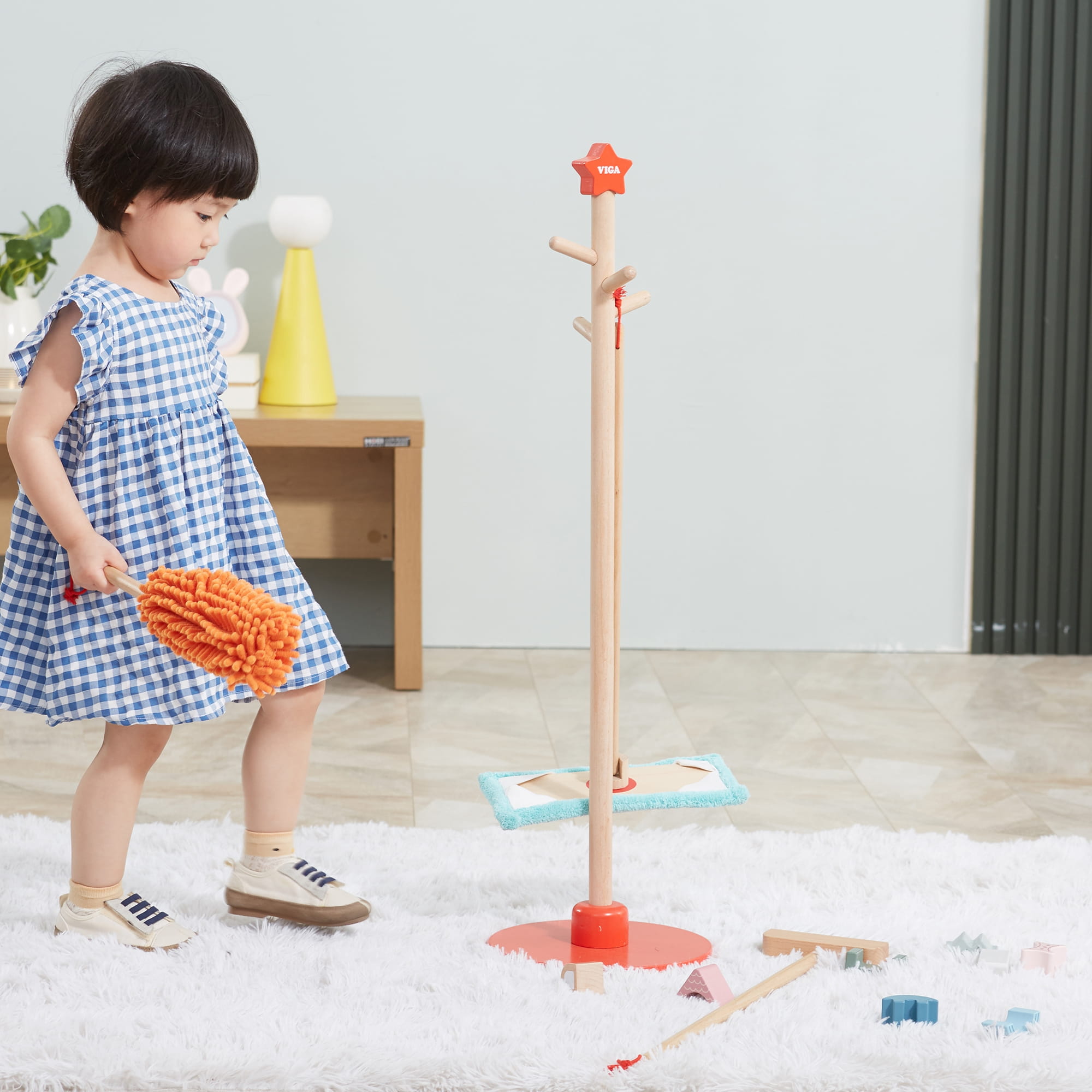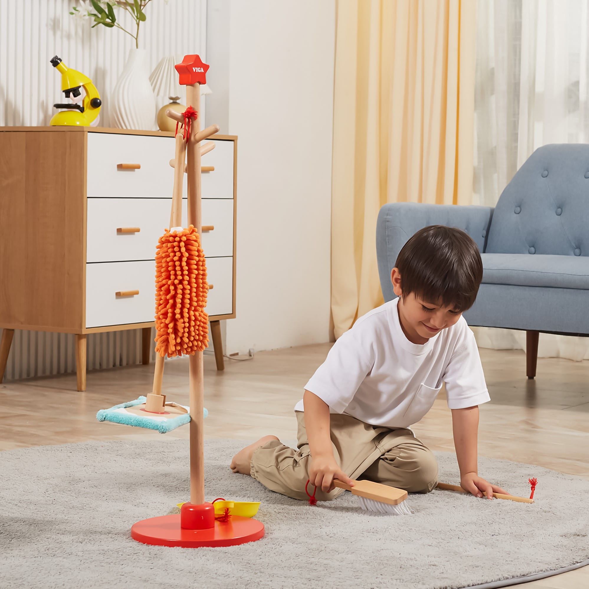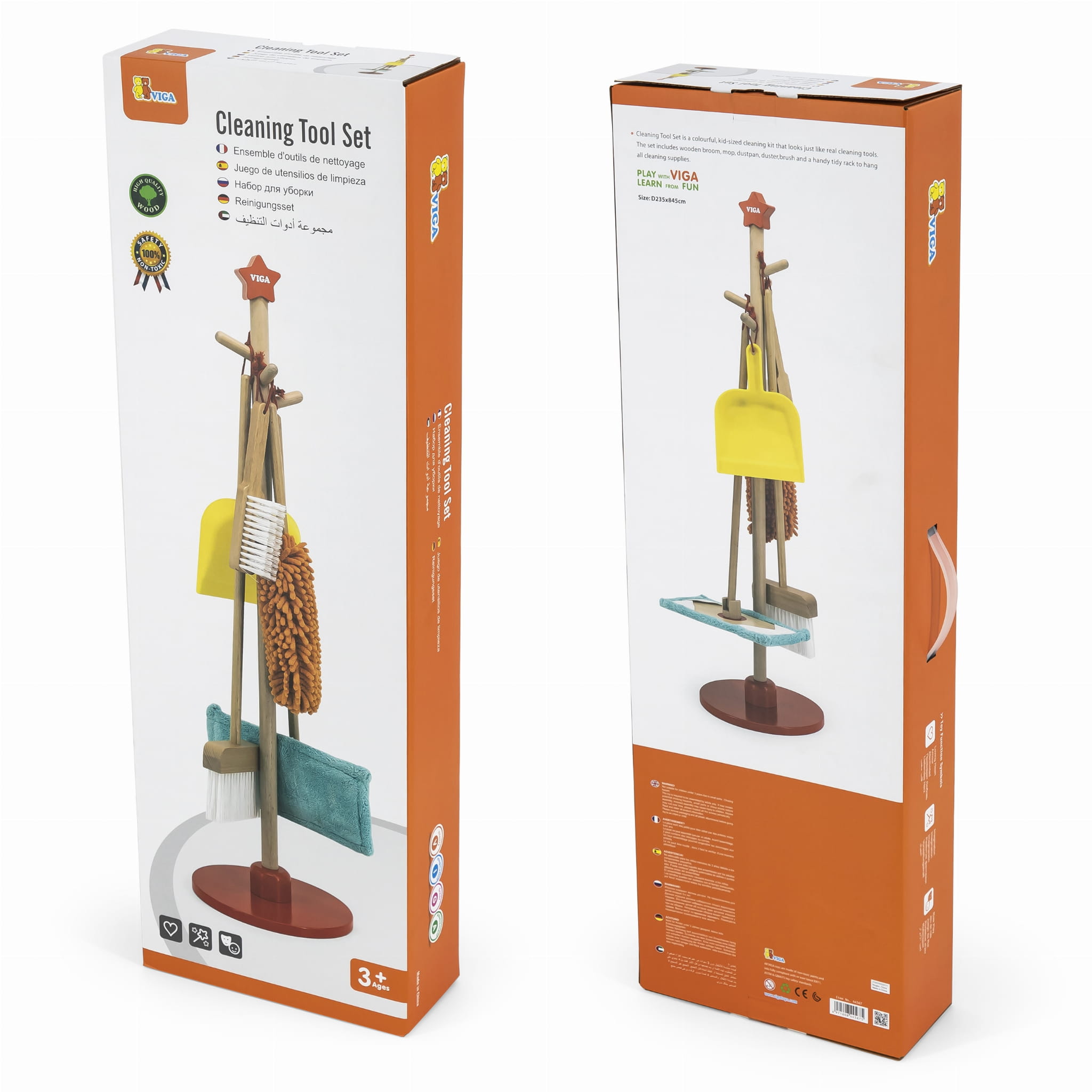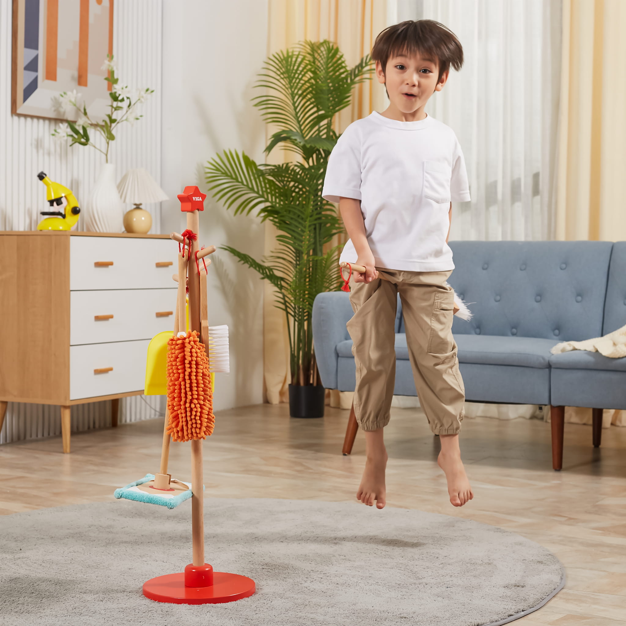 Zabawa w sprzątanie może być przyjemna! Drewniany zestaw narzędzi do sprzątania VIGA to idealna propozycja dla małych pomocników od 3 lat. Dzięki lekkości i odpowiednim rozmiarom, dziecko łatwo nauczy się używać szczotki, szufelki, miotły, mopa i zmiotki do kurzu. Wszystkie akcesoria można wygodnie przechowywać na stojaku z czerwoną podstawą.