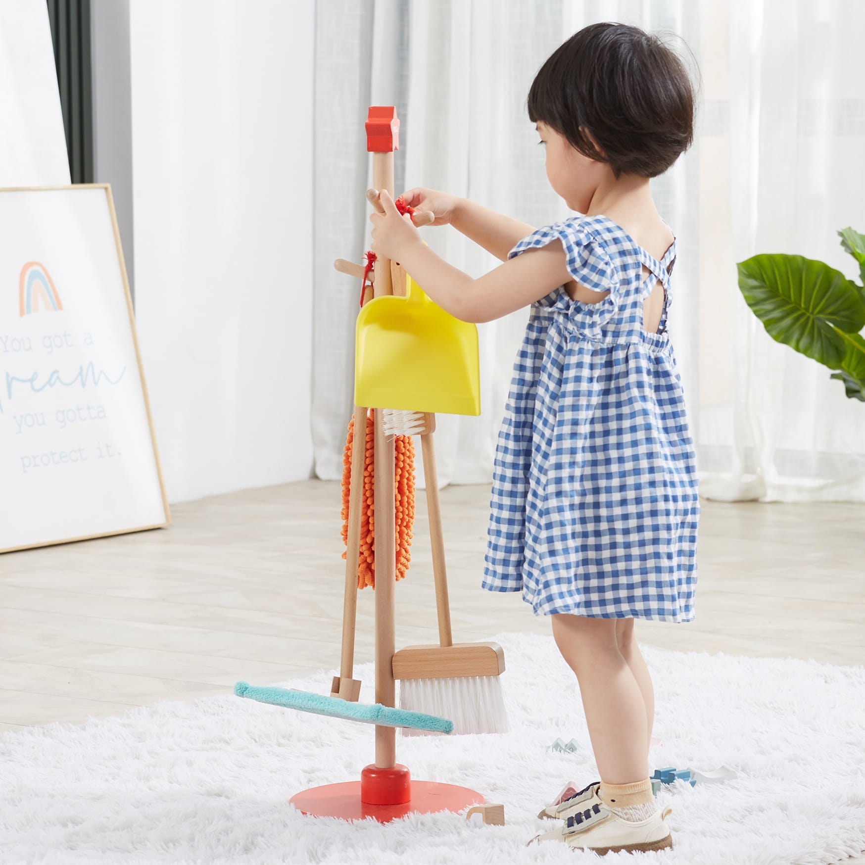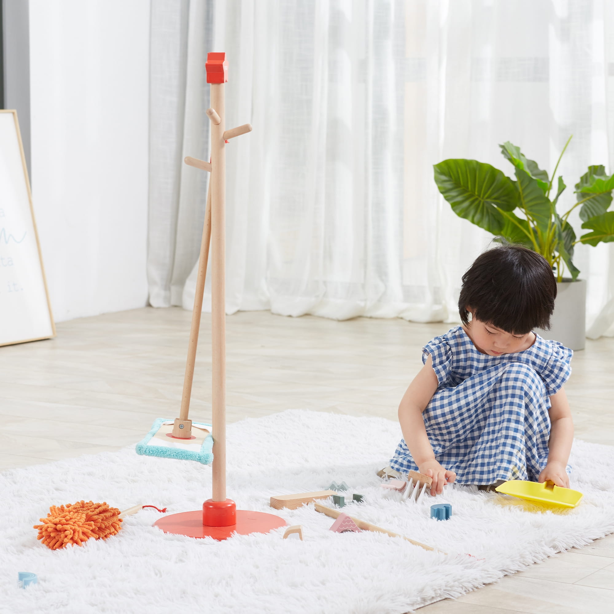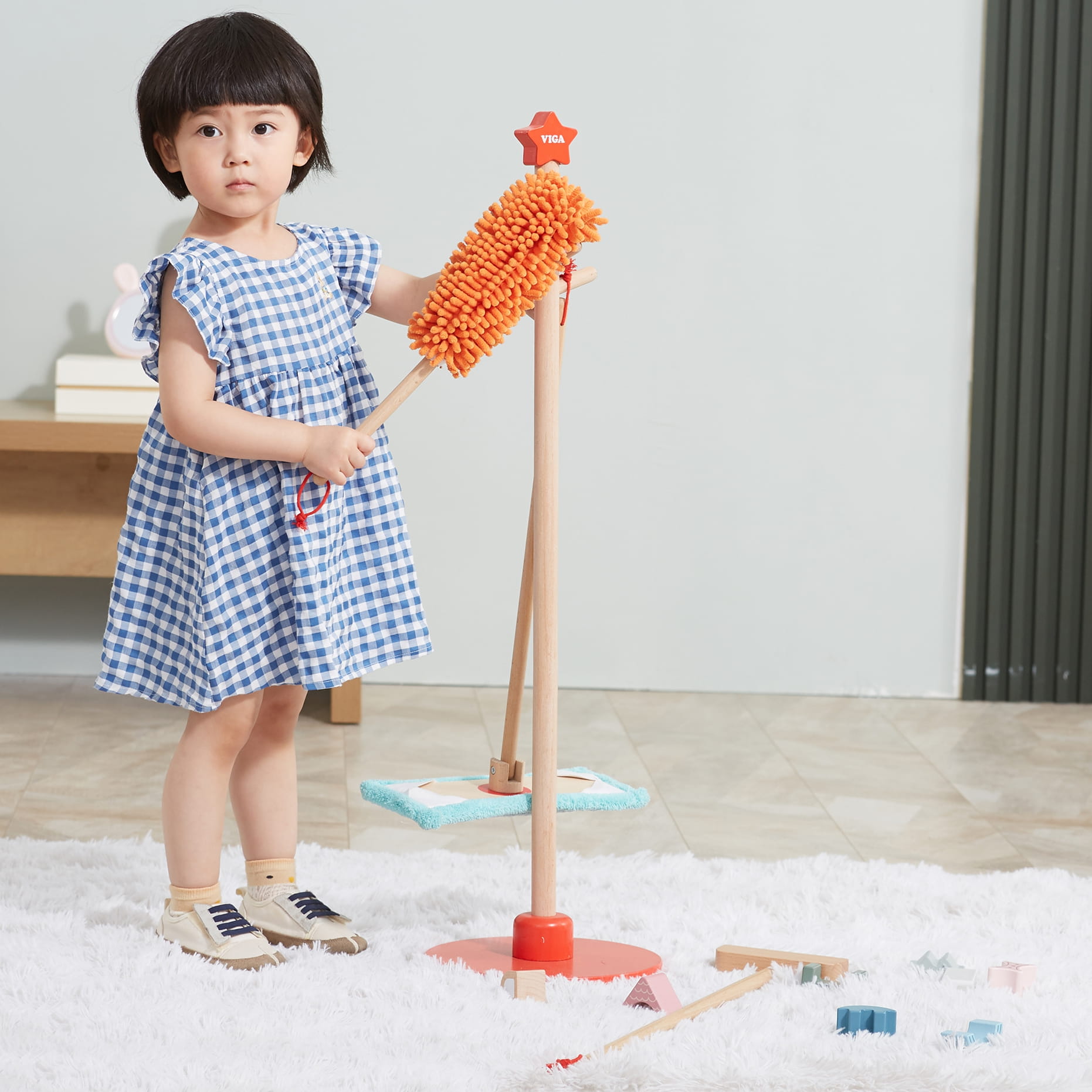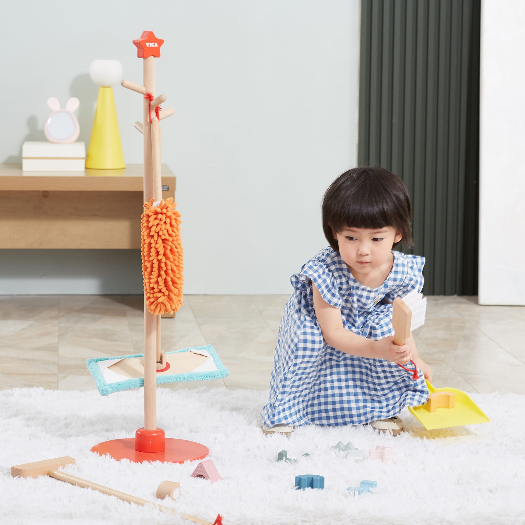 Zabawa w sprzątanie może być przyjemna! Drewniany zestaw narzędzi do sprzątania VIGA to idealna propozycja dla małych pomocników od 3 lat. Dzięki lekkości i odpowiednim rozmiarom, dziecko łatwo nauczy się używać szczotki, szufelki, miotły, mopa i zmiotki do kurzu. Wszystkie akcesoria można wygodnie przechowywać na stojaku z czerwoną podstawą.