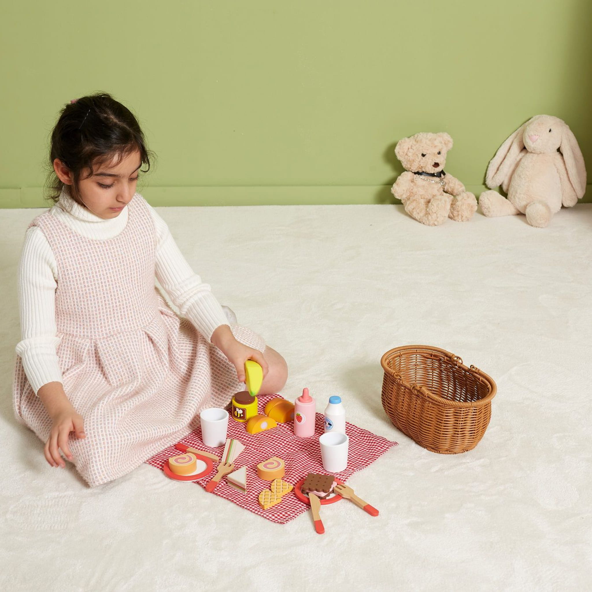 Drewniany Zestaw Piknikowy 30 el. w koszyku – idealny do zabawy w dom i na świeżym powietrzu. Rzepy, drewniane jedzenie i akcesoria pobudzają kreatywność i rozwój manualny.