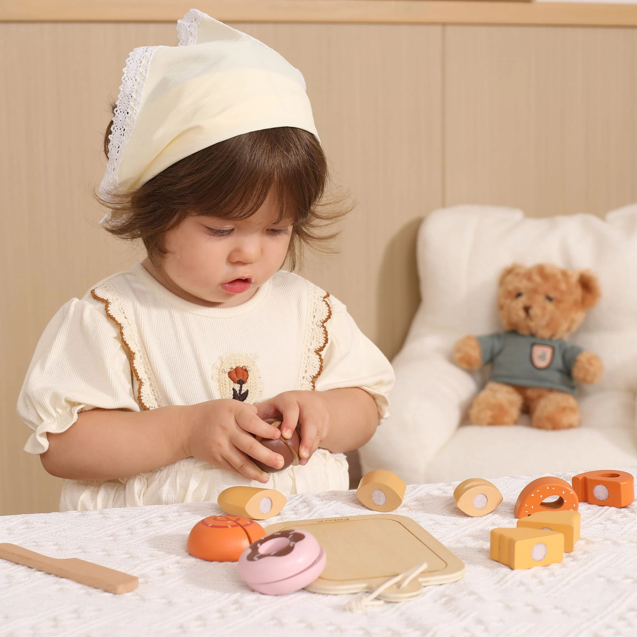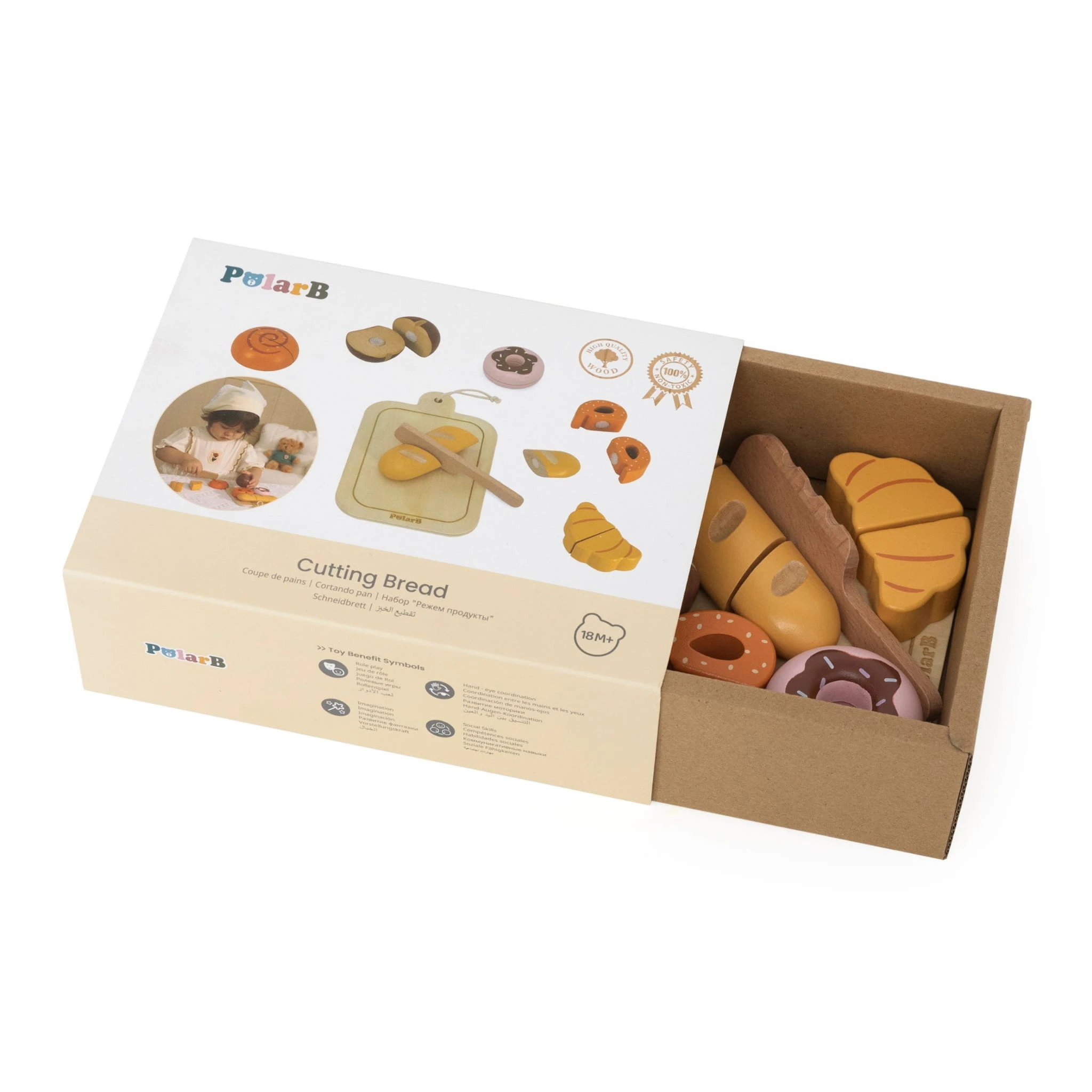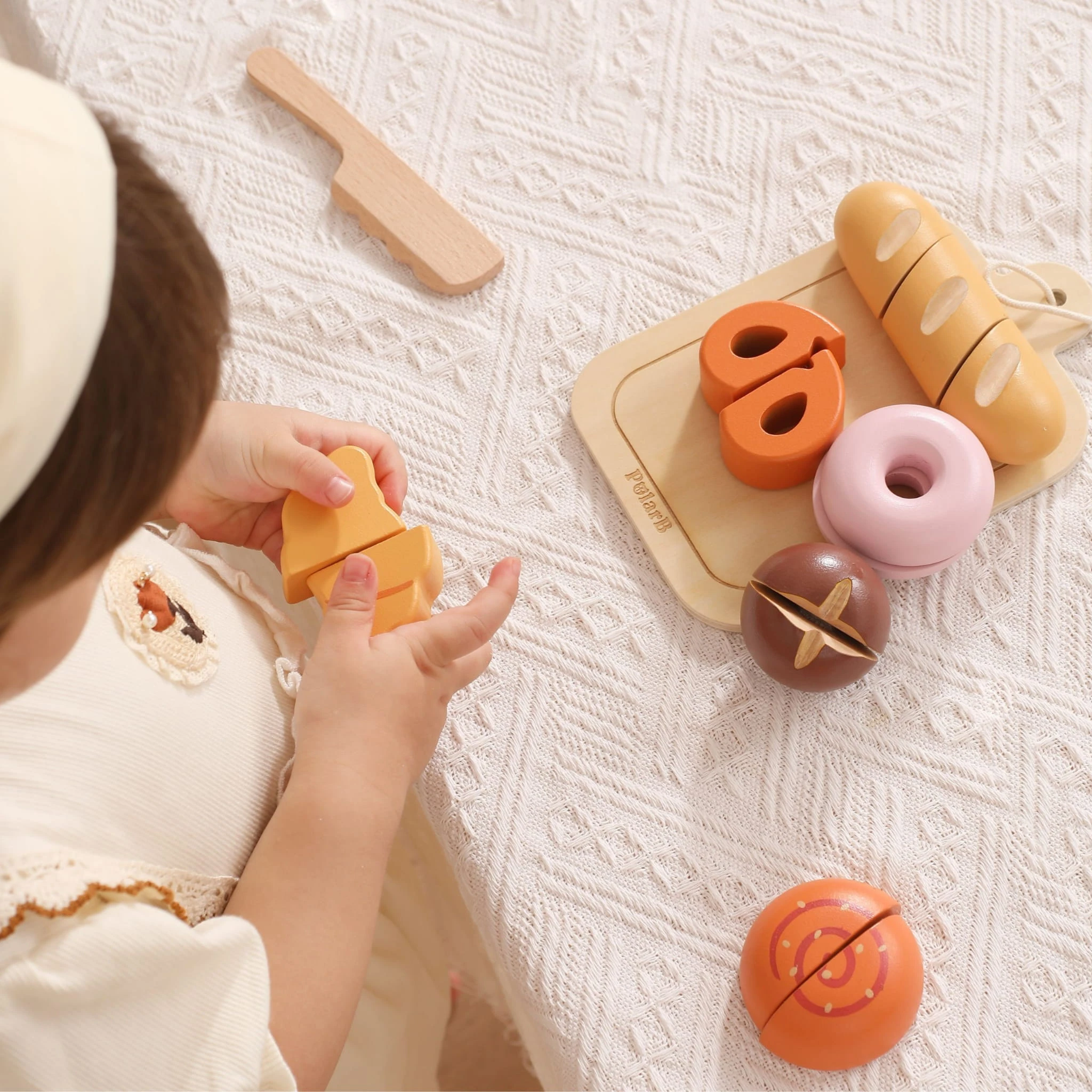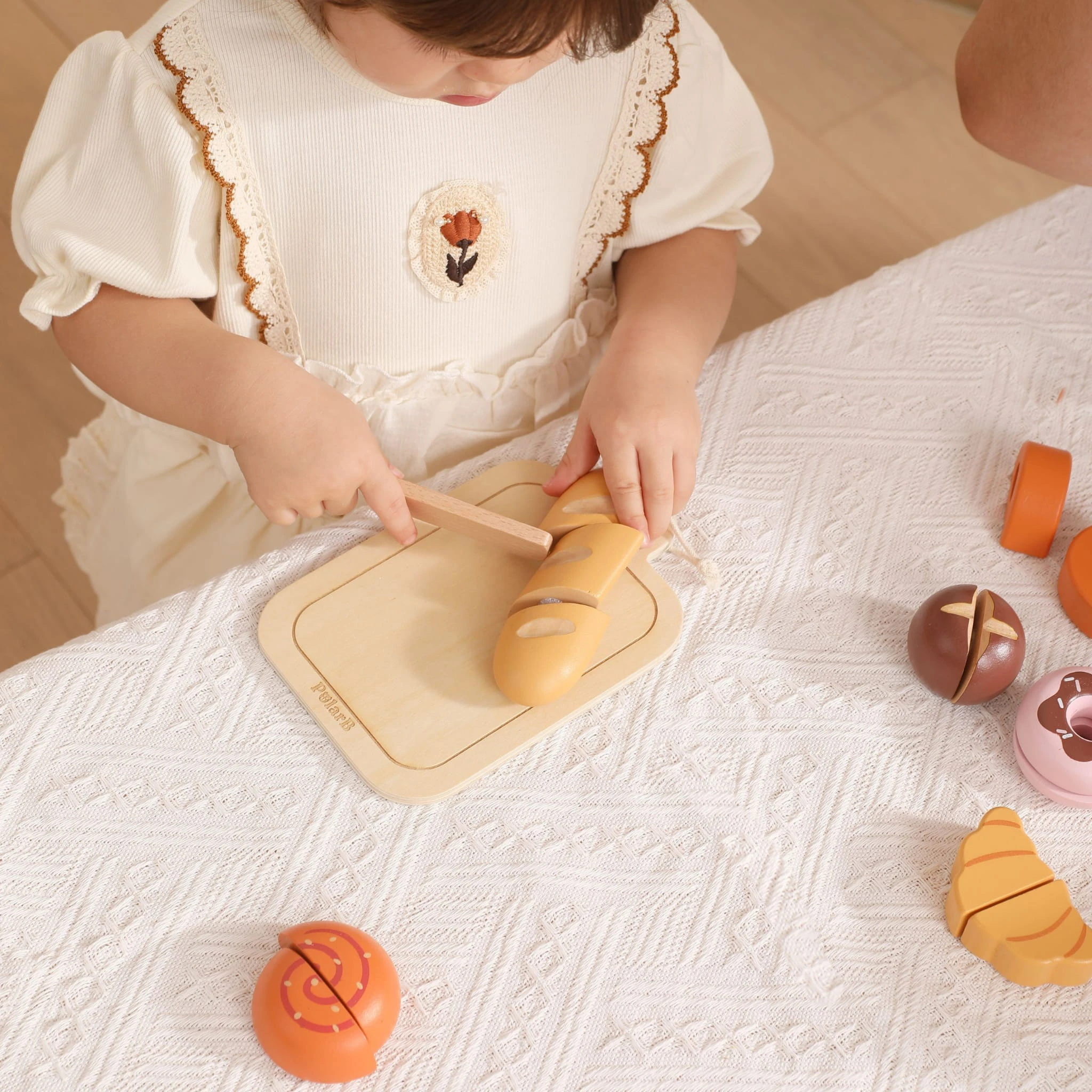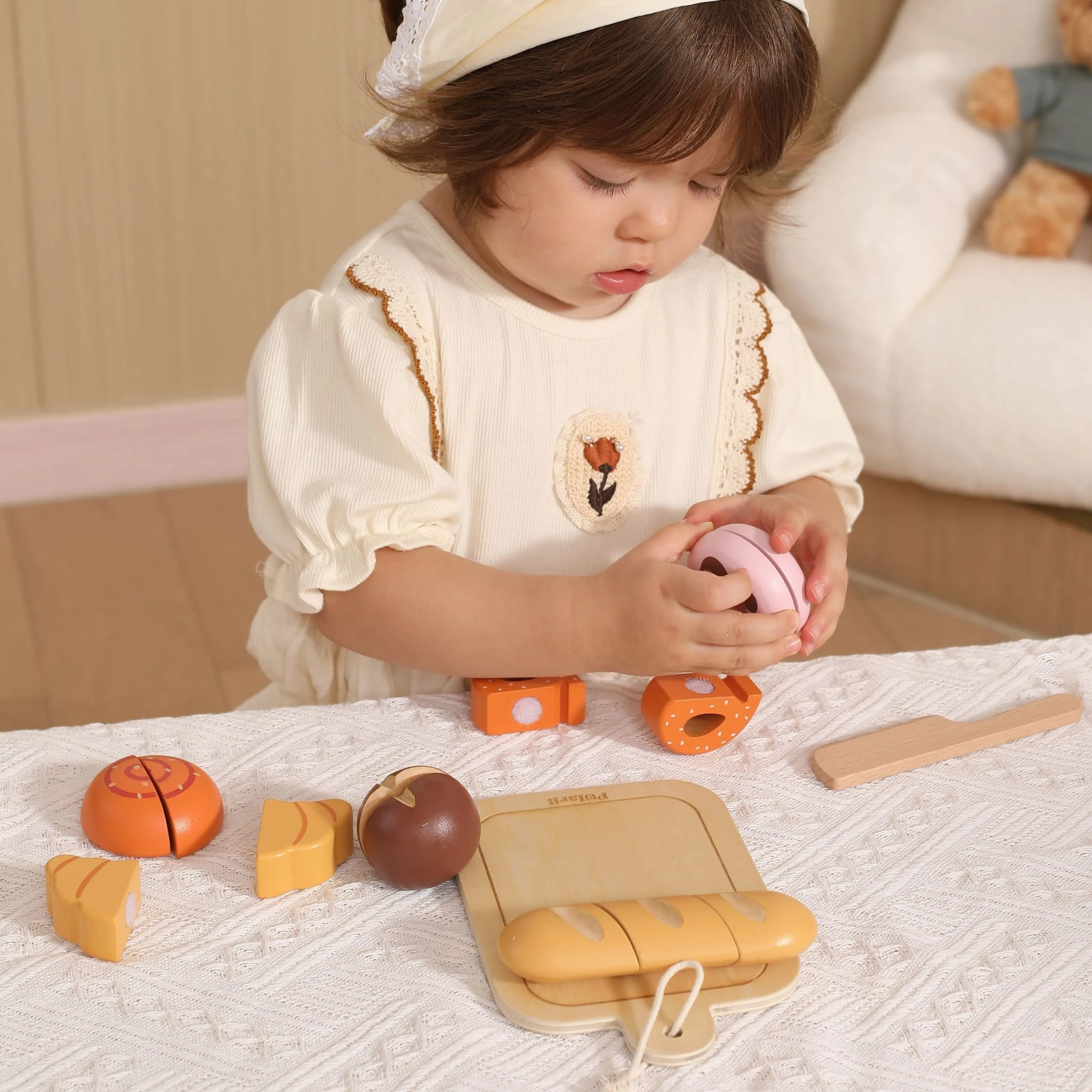 Dzięki realistycznym elementom łączonym na rzepy, dziecko może wielokrotnie „kroić” pieczywo, ćwicząc przy tym precyzję ruchów i koordynację ręka–oko. Każdy element został zaprojektowany tak, aby był wygodny w małych dłoniach i jednocześnie bezpieczny podczas zabawy.