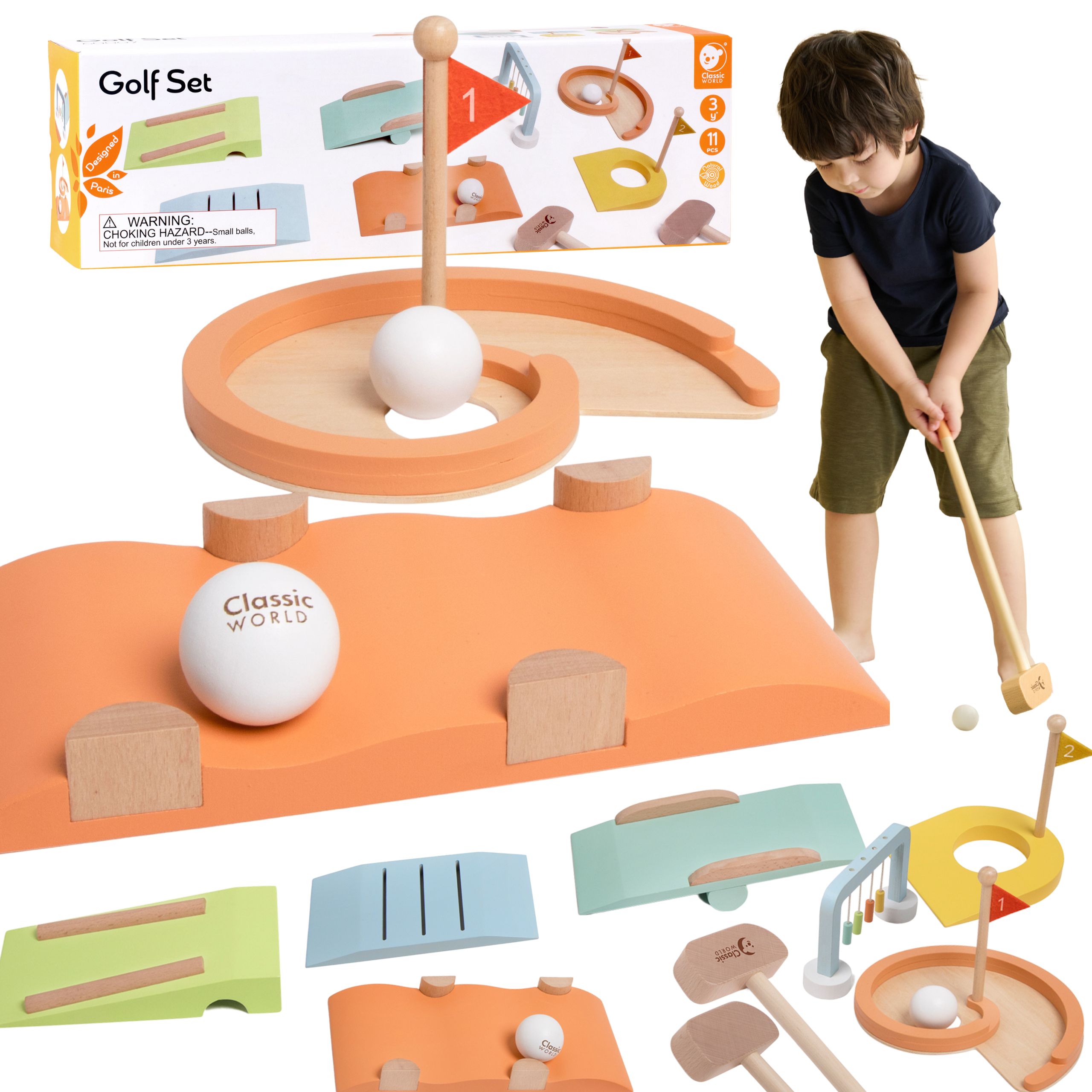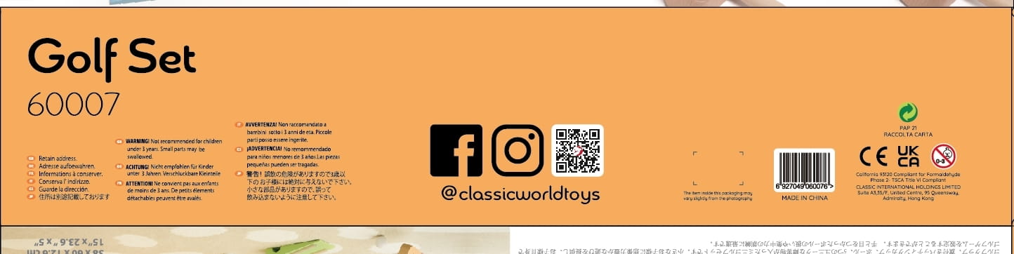 Drewniany Zestaw do Golfa od marki CLASSIC WORLD to klasyczna gra. Idealny sposób na spędzanie aktywnie wolnego czasu, który ćwiczy koncentrację, refleks, zręczność i precyzję. Gra w 100% wykonana z drewna nietoksycznego i odpornego na warunki atmosferyczne. Świetna zabawa dla całej rodziny. Łatwy do rozstawienia dołek pozwala na grę zarówno w ogrodzie jak i w domu. Ten zestaw do minigolfa zawiera kije golfowe, kubki z flagami, piłki i 5 unikalnych przeszkód. Zapewni małym dzieciom godziny pomysłowej zabawy, a one będą mogły tworzyć własne gry w golfa. Świetne do koordynacji ręka-oko i ćwiczeń koncentracji.