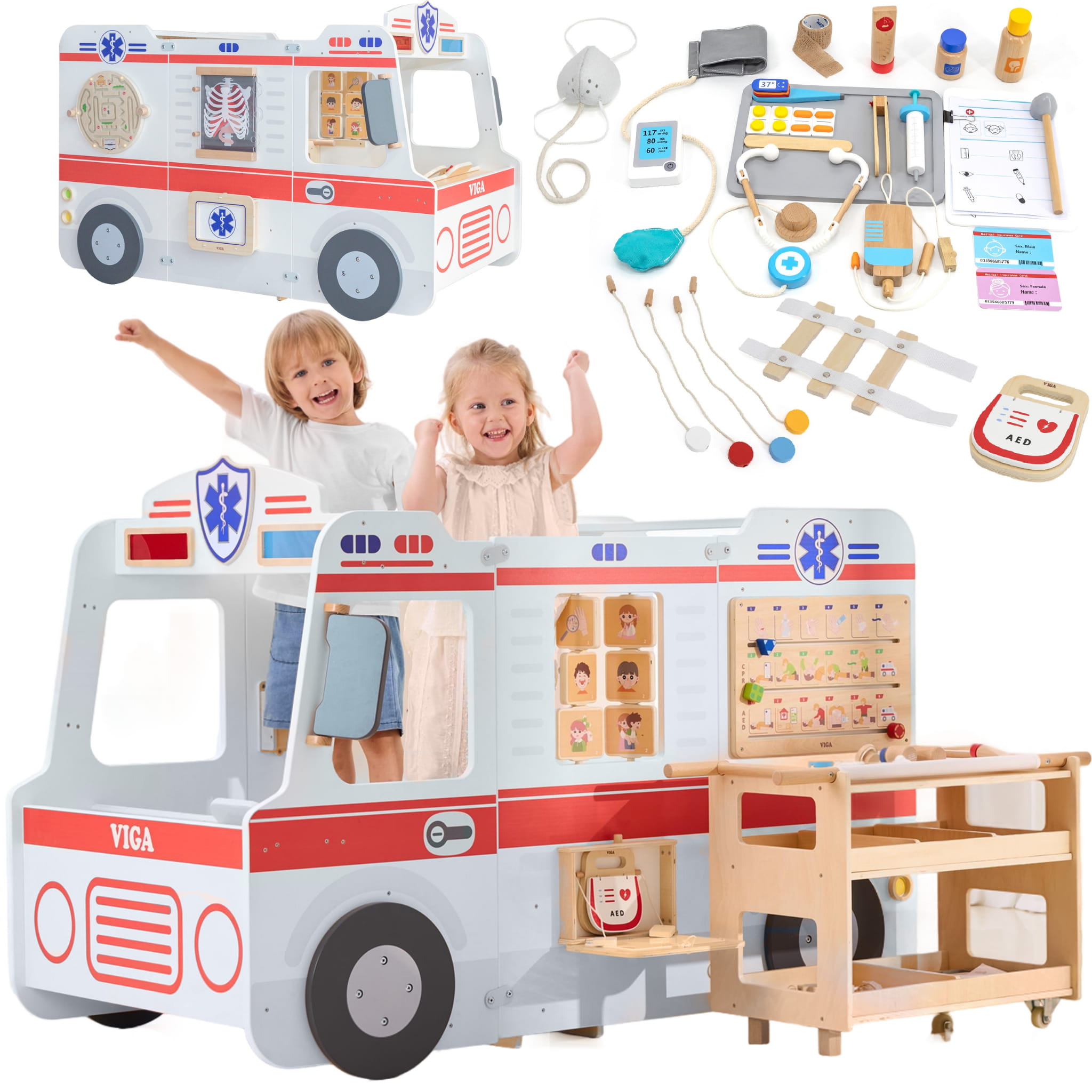 Drewniany ambulans Viga Toys to rozbudowany zestaw edukacyjny, który przenosi dzieci w świat ratownictwa medycznego. Dzięki realistycznej konstrukcji karetki oraz bogatemu zestawowi akcesoriów dzieci mogą wcielać się w role ratownika, kierowcy ambulansu oraz dyspozytora.