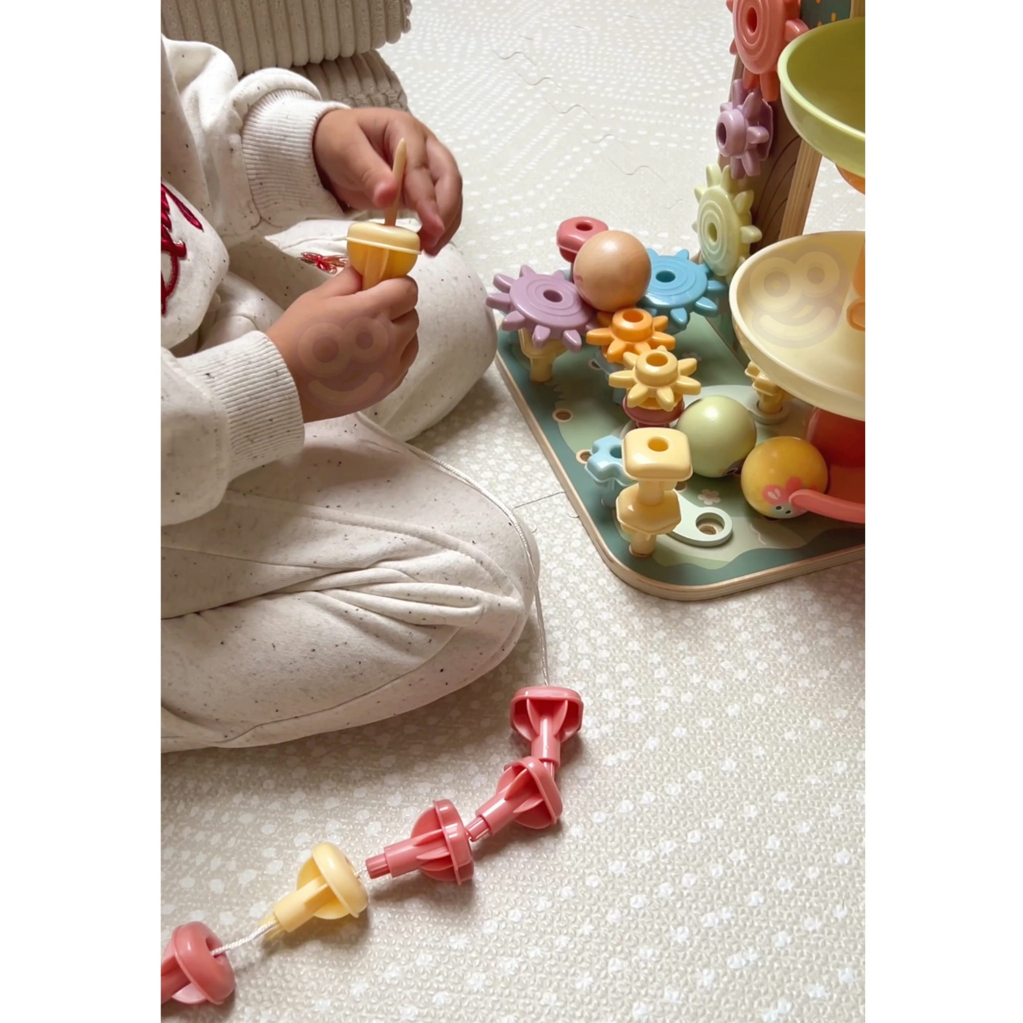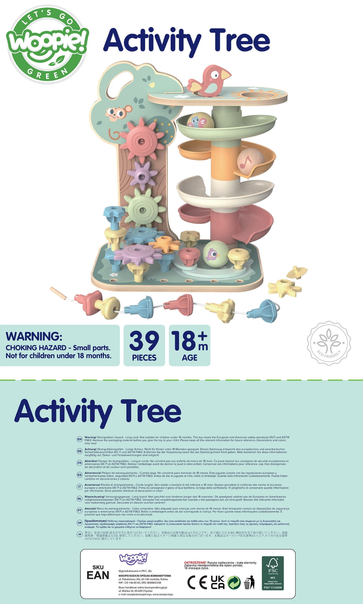 Drzewko Aktywności od marki WOOPIE GREEN to kolorowy zestaw sensoryczny stworzony z myślą o rozwoju różnych umiejętności dziecka podczas zabawy. Centralnym elementem zestawu jest urocza wieża z piłeczkami, na której szczycie dzieci mogą umieścić piłkę i obserwować jak spada kaskadą przez różnorodne przeszkody. U podstawy wieży znajdują się kolorowe kołki, czekające na ułożenie i zabawę. Do drzewka przyczepione są różnokolorowe zębatki, zapewniające stymulację dotykową. Dodatkową dawkę emocji dostarcza nić z igłą, umożliwiającą nawlekanie kołeczków, rozwijając przy tym motorykę małą i koordynację wzrokowo-ruchową.