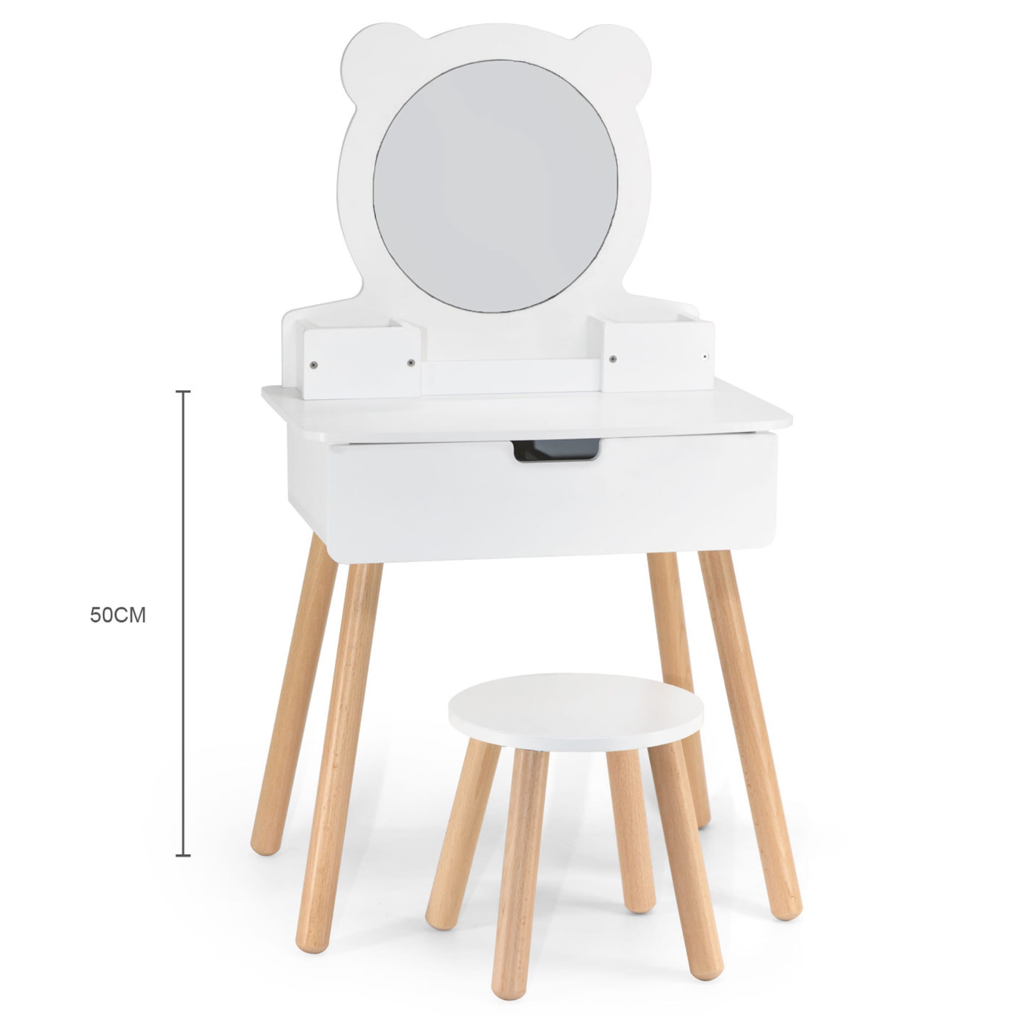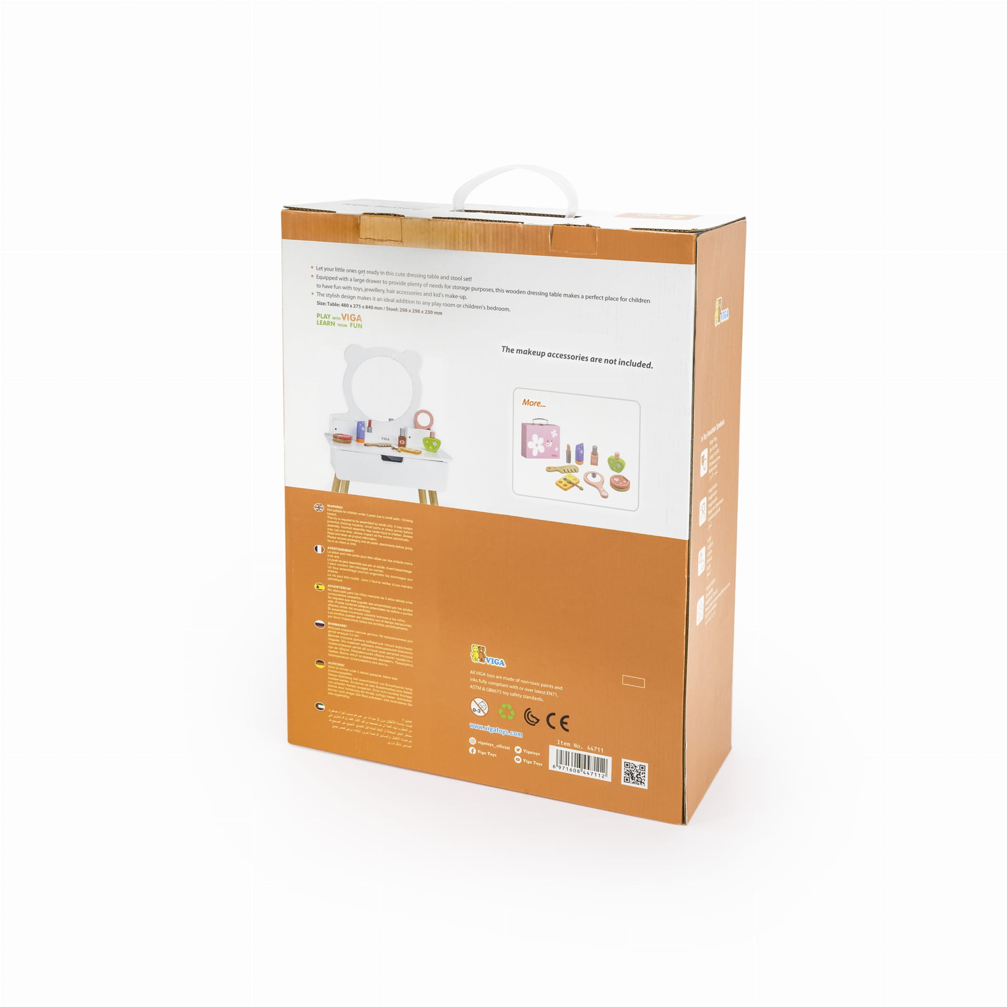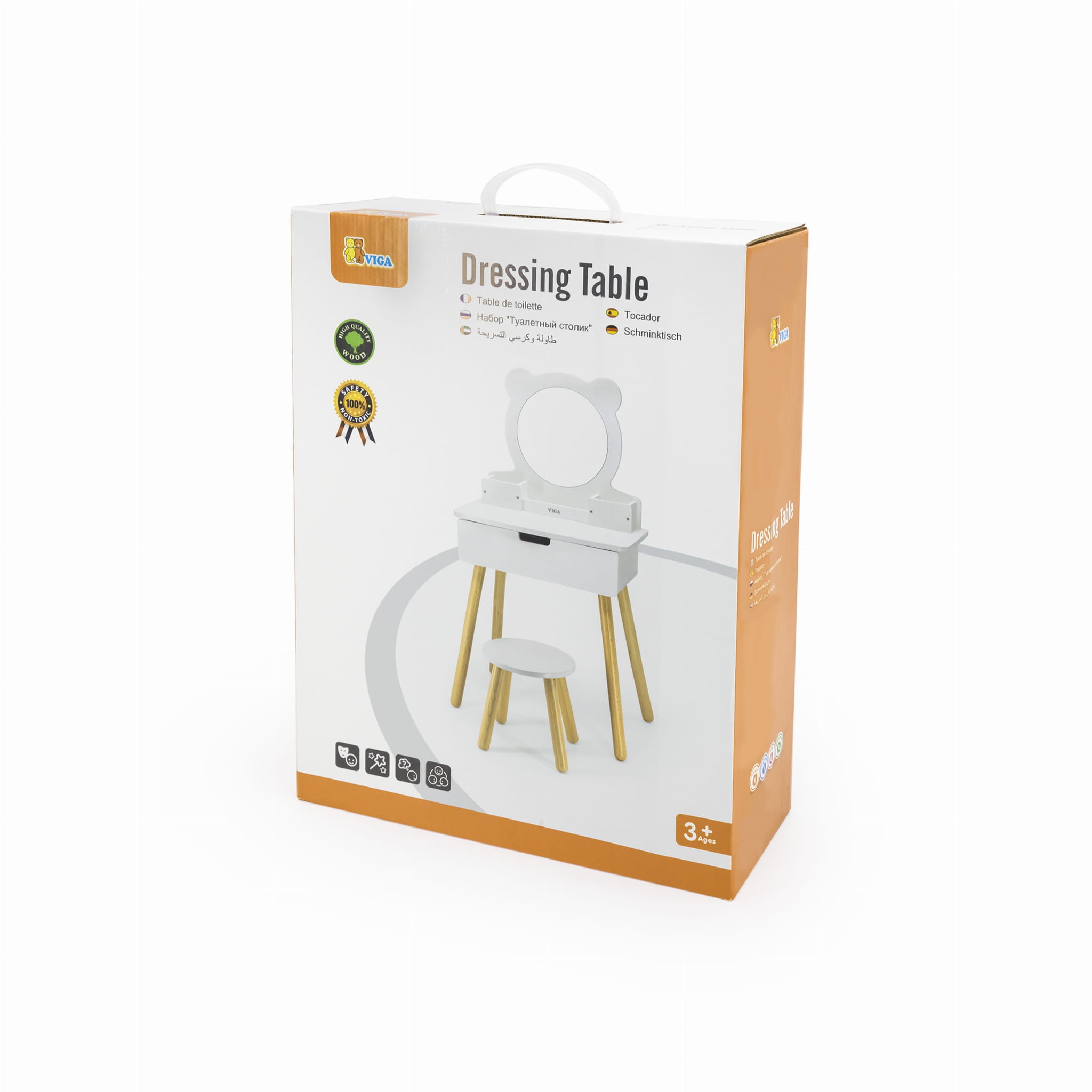 Wolnostojąca drewniana toaletka z lustrem i wysuwaną szufladą rozwija kreatywność, zręczność i wyobraźnię dziecka podczas zabawy.