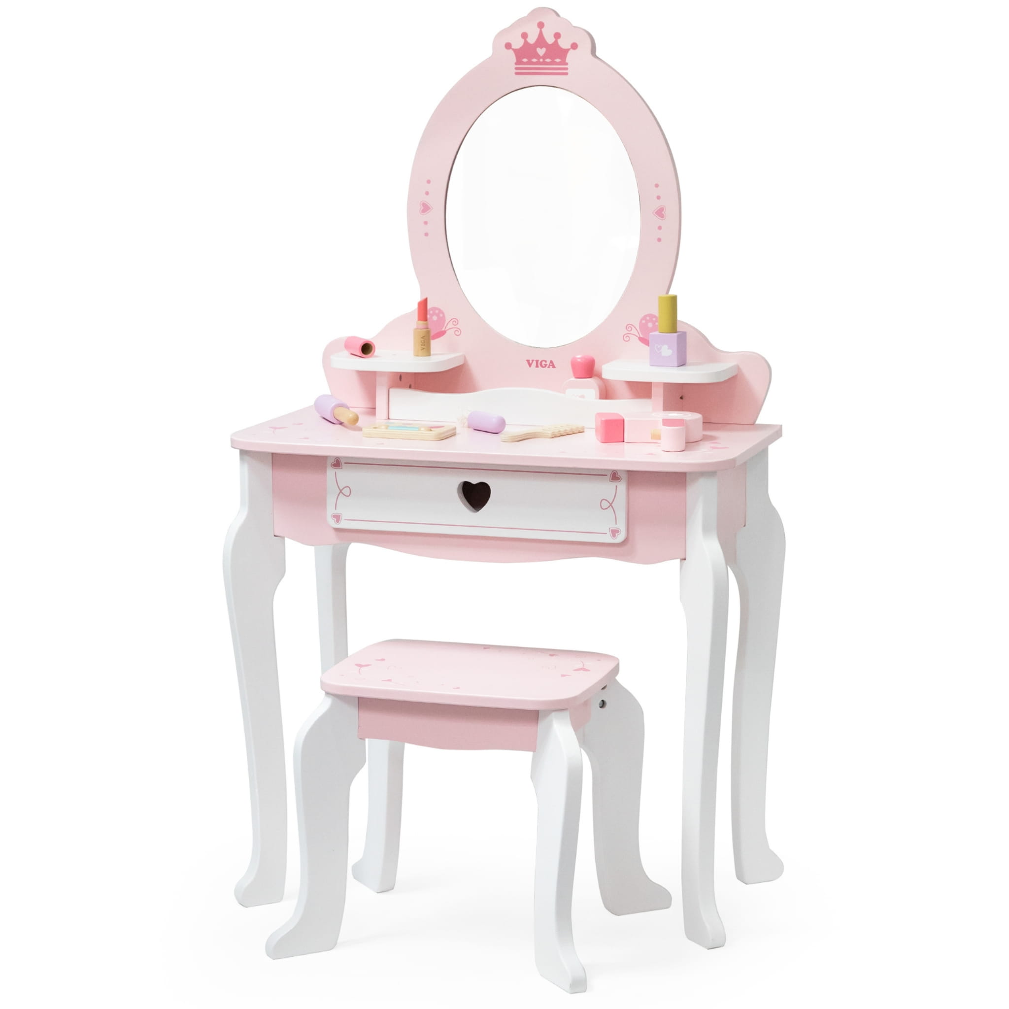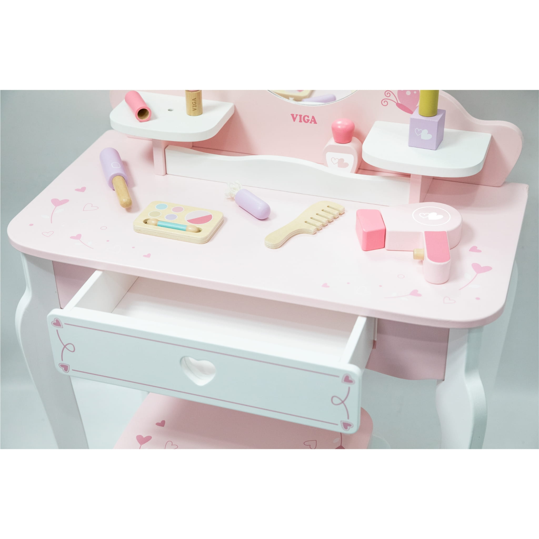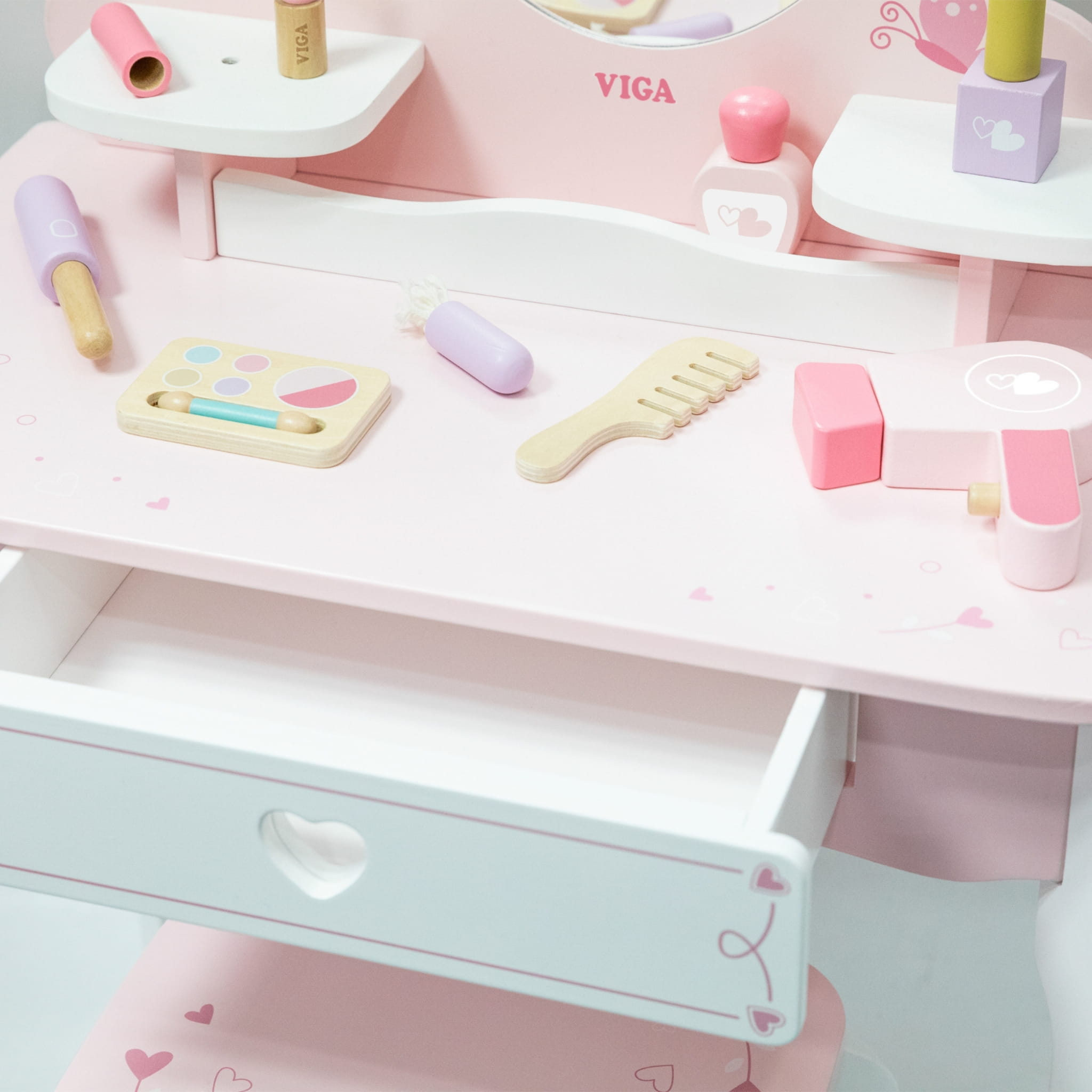 Duża Drewniana toaletka z marki Viga to wyjątkowa drewniana toaletka dla małej księżniczki, która spełni marzenia każdej dziewczynki! Wykonana z najwyższej jakości drewna, w delikatnych odcieniach różu i bieli, ta urocza toaletka zachwyca swoim bajkowym designem. Stylowe, zaokrąglone kształty, subtelne zdobienia i eleganckie nóżki sprawiają, że doskonale komponuje się w pokoju dziecięcym, dodając mu uroku i magii.Toaletka rozwija kreatywność, wyobraźnię i zachęca do odgrywania ról. Jest również doskonałym pomysłem na prezent – solidne wykonanie i estetyczny wygląd sprawią, że będzie służyć przez lata.