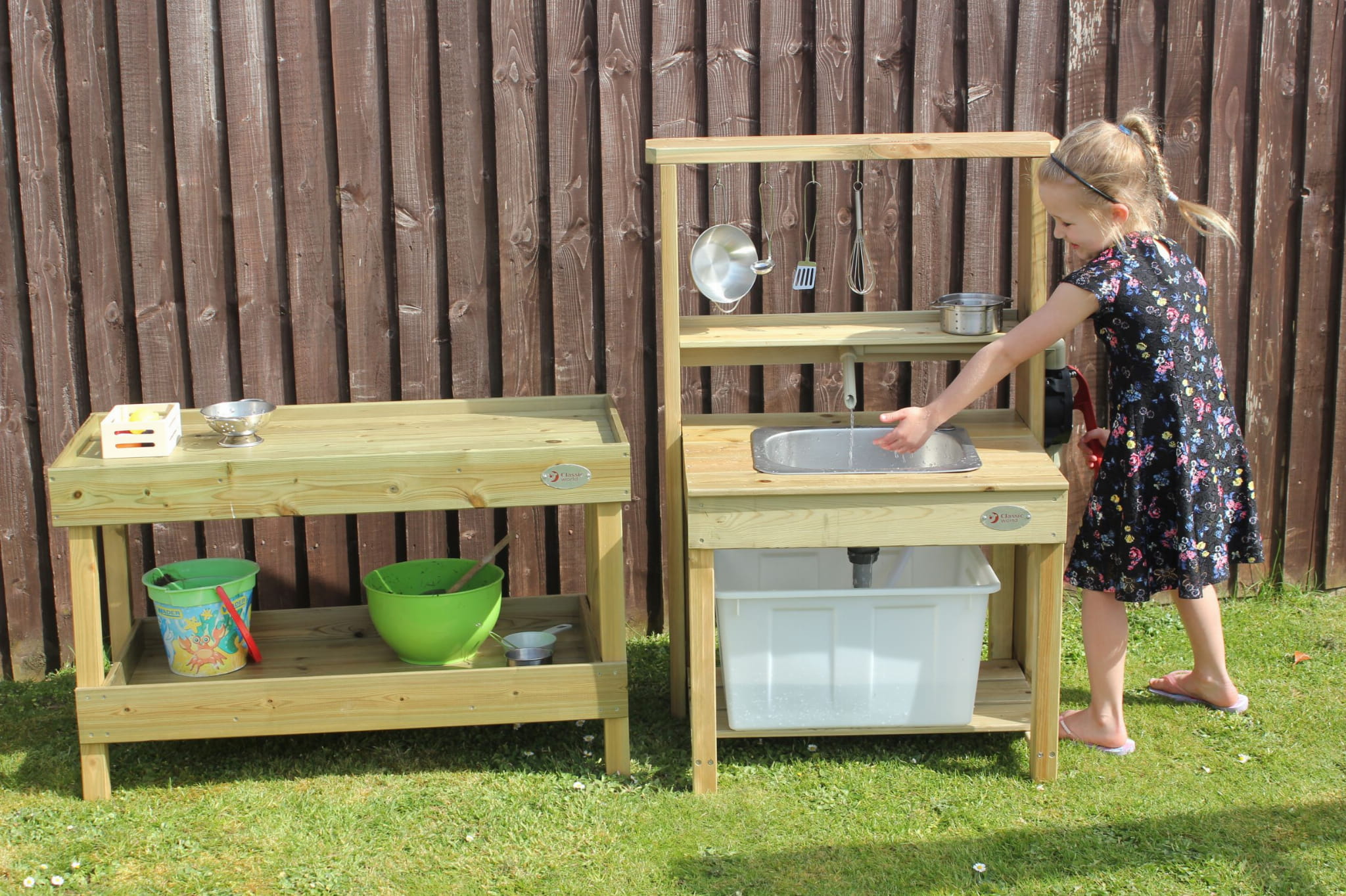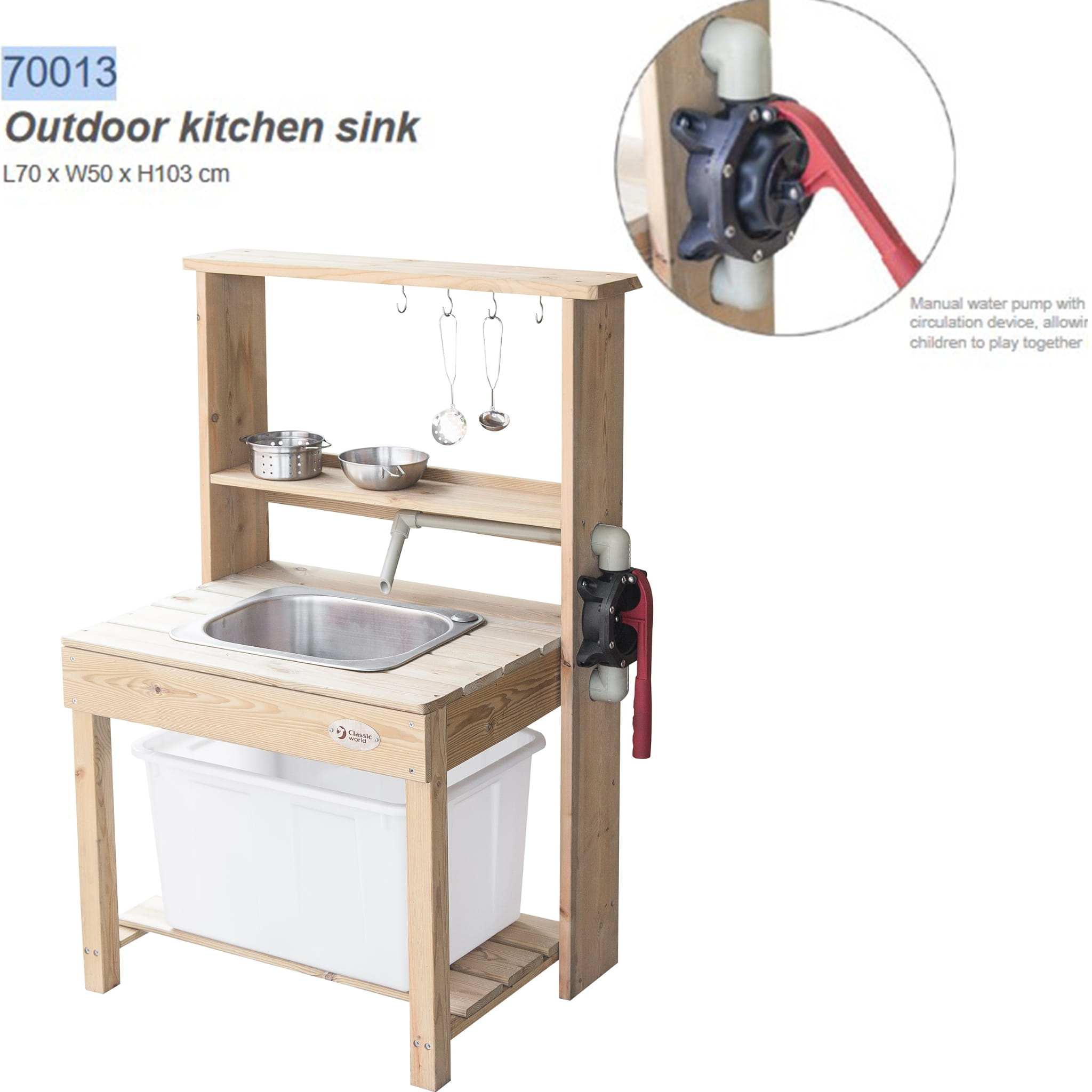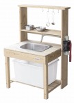 Przepiękna Drewniana Kuchnia Outdoor od renomowanej marki zabawek drewnianych Classic World to świetna propozycja dla dzieci, które lubią wcielać w różne role osób dorosłych podpatrzonych w życiu codziennym. Drewniana zabawka pozwoli na odgrywanie ról, wpłynie także pozytywnie na integrację z innymi dziećmi poprzez wspólną zabawę oraz nauczy odpowiedzialności. Dzieci będą mogły poczuć że są prawdziwymi szefami kuchni, a zabawa w przygotowywanie potraw dla całej rodziny nie będzie miała końca. W kuchni znajduje się miejsce, aby podłączyć dopływ wody, wystarczy podstawić plastikowy pojemnik, żeby woda miała, gdzie spływać.