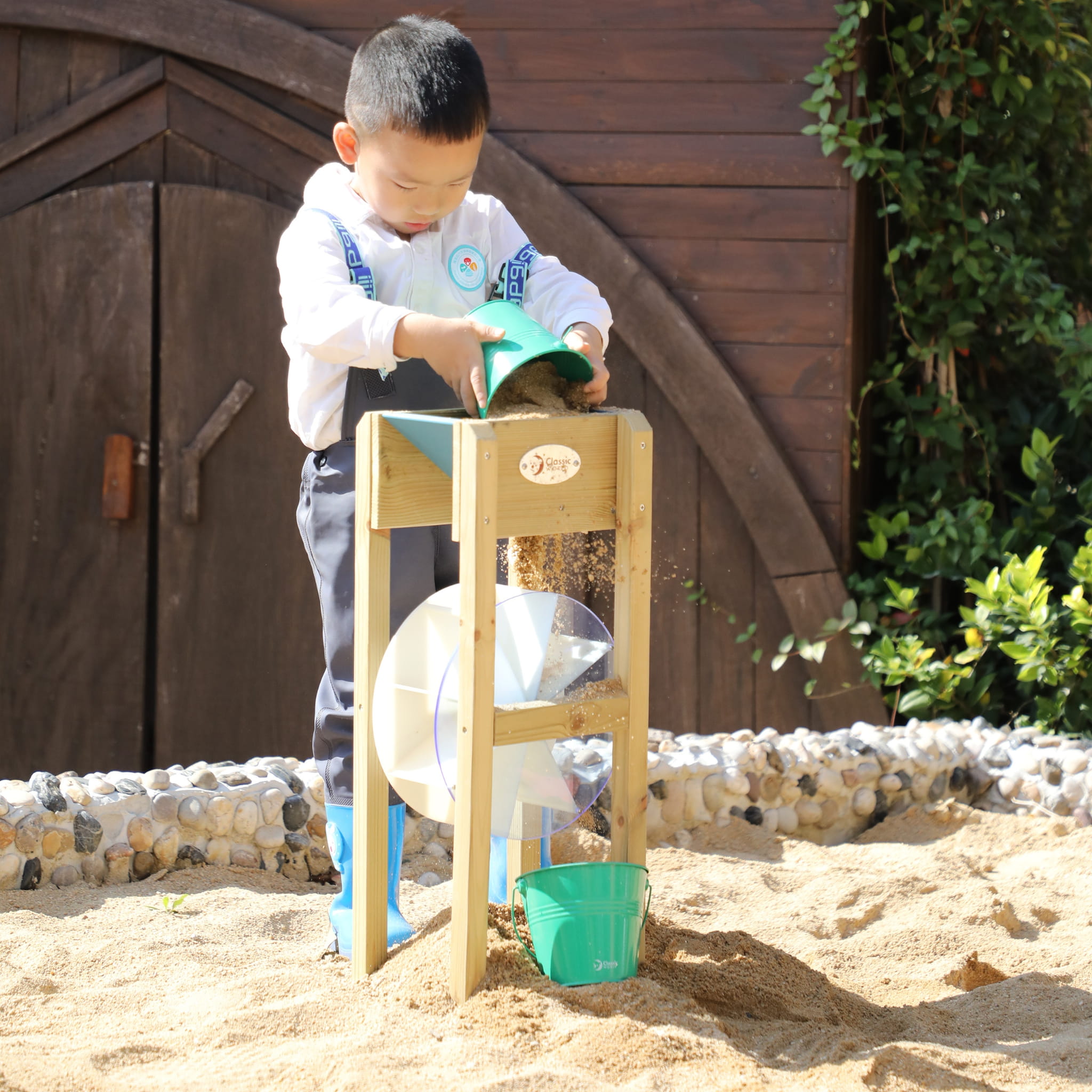 Drewniany młyn na piasek do piaskownicy, który angażuje dzieci w obserwację i eksperymentowanie. Wspiera rozwój motoryki, logicznego myślenia oraz rozumienia zależności przyczynowo-skutkowych poprzez zabawę.