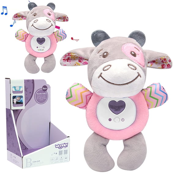 Interaktywny Pluszowy Byczek uspokoi oraz uśpi Twoje dziecko. Zabawka posiada opcję włączenia kołysanki dla Twojej małej pociechy oraz posiada opcję wyświetlania kolorowych światełek, dzięki którym Twój maluch nie znudzi się zabawką. Ten miękki w dotyku miś stanie się przyjacielem Twojego dziecka już od najmłodszych lat. Zabawka jest przystosowana dla niemowląt, dlatego jest miękka i wypełniona watą, przez co nie musimy martwić się o to, że Twoja pociecha może coś sobie zrobić. Dodatkowo pluszaka można bezpiecznie oraz łatwo czyścić (wyjmując mechanizm) bez obaw o jakiekolwiek uszkodzenia.