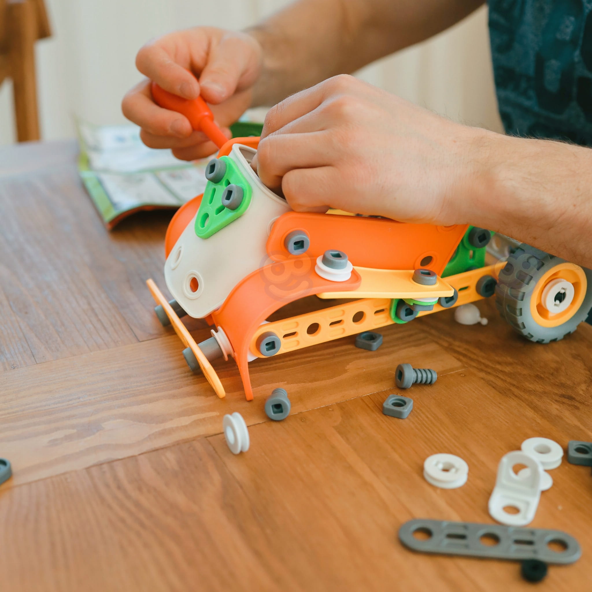 Zestaw Klocki Konstrukcyjne 164 El. 5w1 od marki WOOPIE to doskonały wybór dla każdego dziecka, które lubi wyzwania konstrukcyjne i chce rozwijać swoje zdolności manualne. Wspólna zabawa z tym zestawem może także być świetnym sposobem na spędzanie czasu z rodzeństwem lub przyjaciółmi, ucząc współpracy i dzielenia się pomysłami. Z 164 elastycznych elementów dzieci mogą stworzyć aż 5 różnych modeli pojazdów i maszyn: auto, quad, helikopter, samolot oraz robot. Dzięki innowacyjnym, elastycznym częściom, zestaw umożliwia nie tylko budowanie, ale także łatwe rozkręcanie i skręcanie konstrukcji, co pozwala na tworzenie wielu różnych kombinacji. Zestaw jest idealnym prezentem dla dzieci, które zaczynają odkrywać świat konstrukcji, inżynierii i mechaniki w formie zabawy!