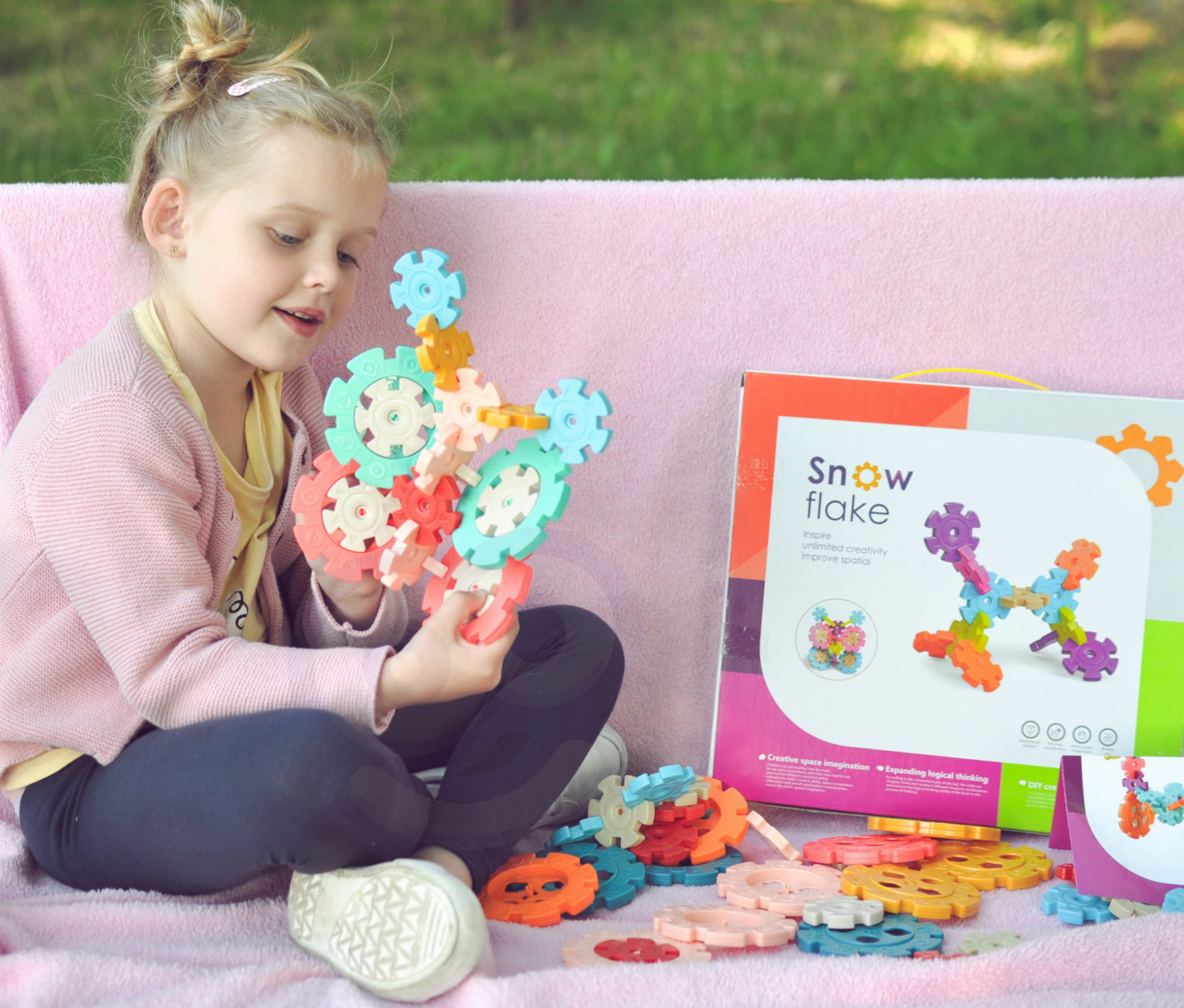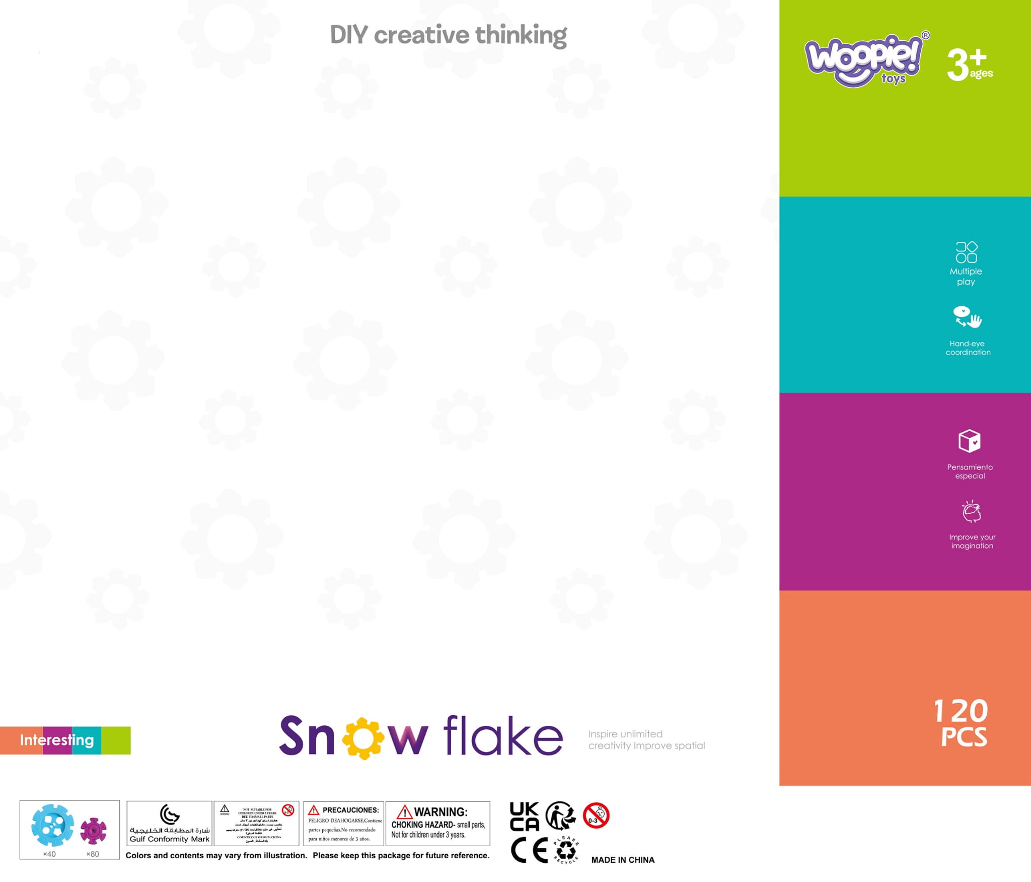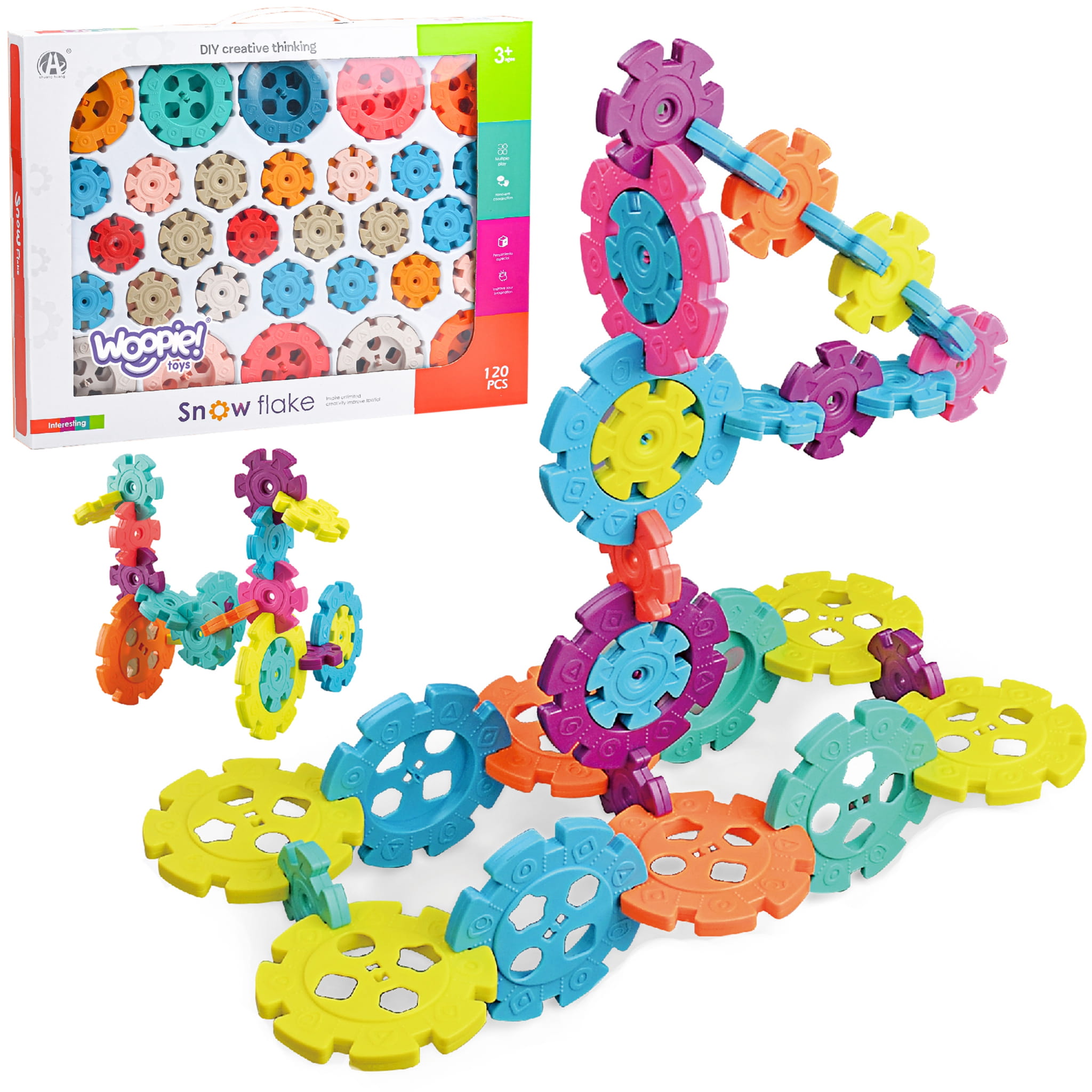 Klocki Konstrukcyjne Wafle od marki WOOPIE zwrócą uwagę i zafascynują Twoje dziecko. Kolorowe elementy przypominają wyglądem płatki śniegu. Klocki w bardzo łatwy sposób łączą się ze sobą, a ze względu na swoją budowę i sposób łączenia można z nich tworzyć ciekawe trójwymiarowe konstrukcje. Zastosowane otwory w śnieżynkach pozwalają na łączenie ich pod skosem, a nie tylko prostopadle. Zestaw zawiera 120 elementów: w tym 40 dużych i 80 małych klocków. Samo budowanie konstrukcji rozwinie u dziecka logiczne myślenie, wyobraźnie, kreatywność oraz pomoże mu się skoncentrować podczas tworzenia. Przez układanie klocków dziecko poznaje kształty i kolory oraz ćwiczy zdolności manualne tzw. motorykę małą.