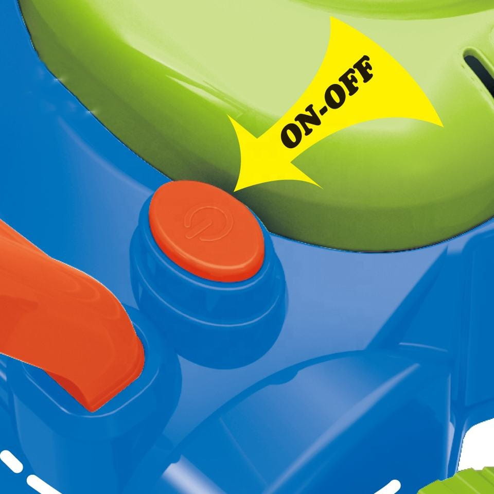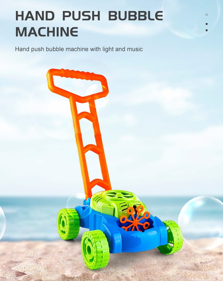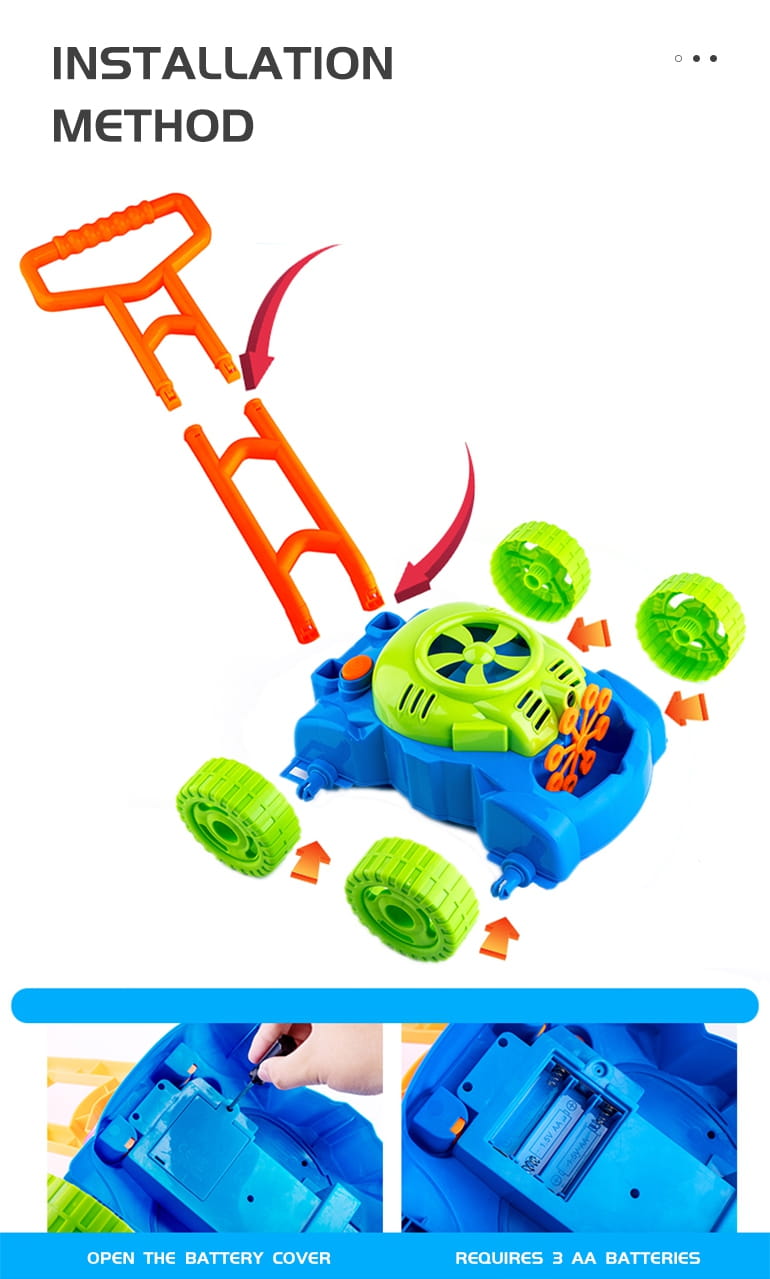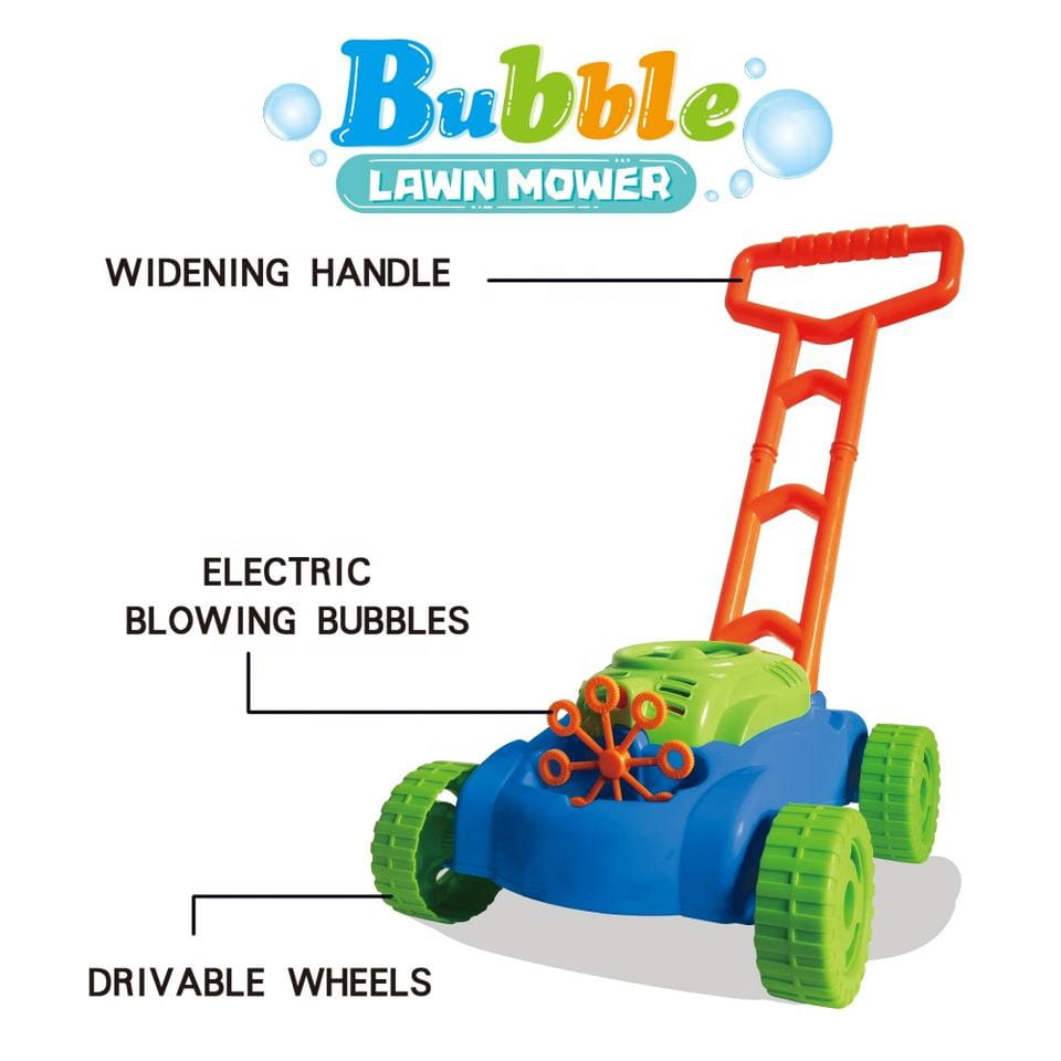 Bańki puszczane są automatycznie. Mały wiatraczek znajdujący się w górnej części obudowy silnika kosiarki, wytwarza strumień powietrza, który kierowany jest na 8 kręcących się pierścieni. Zanurzają się one w pojemniku na płyn do wytwarzania baniek i po kolei podsuwają pod małą dyszę. W ten sposób bańki puszczane są nieustannie. Dzięki 8 pierścieniom, zabawka wytwarza równocześnie dużą liczbę baniek. Dodatkową zaletą kosiarki są wydawane przez nią dźwięki. Dźwięki jakie możemy usłyszeć to dźwięk baniek mydlanych oraz melodia z bajki. Przy tylnych kółkach umieszczone zostały plastikowe zakładki, które podczas jazdy terkoczą imitując tym samym odgłos wydawany przez prawdziwe urządzenie. Bajecznie kolorowa kosiarka to propozycja niekończącej się zabawy, pobudzającej kreatywność i rozwijającej zdolności manualne. Możesz mieć pewność, że maluch nie będzie miał czasu na nudę.