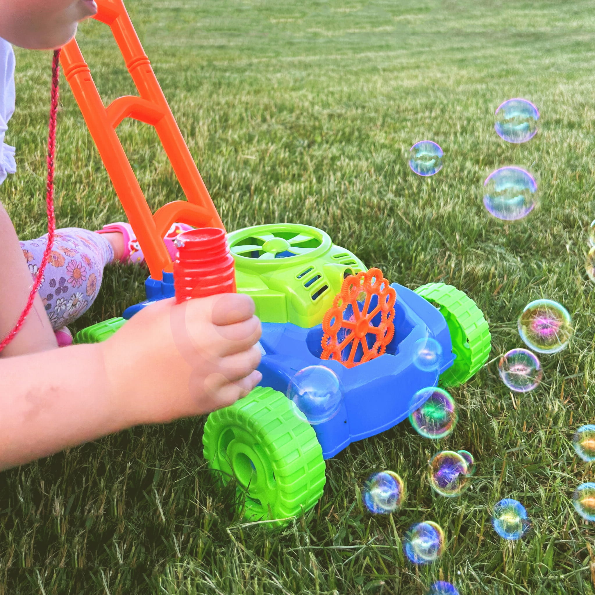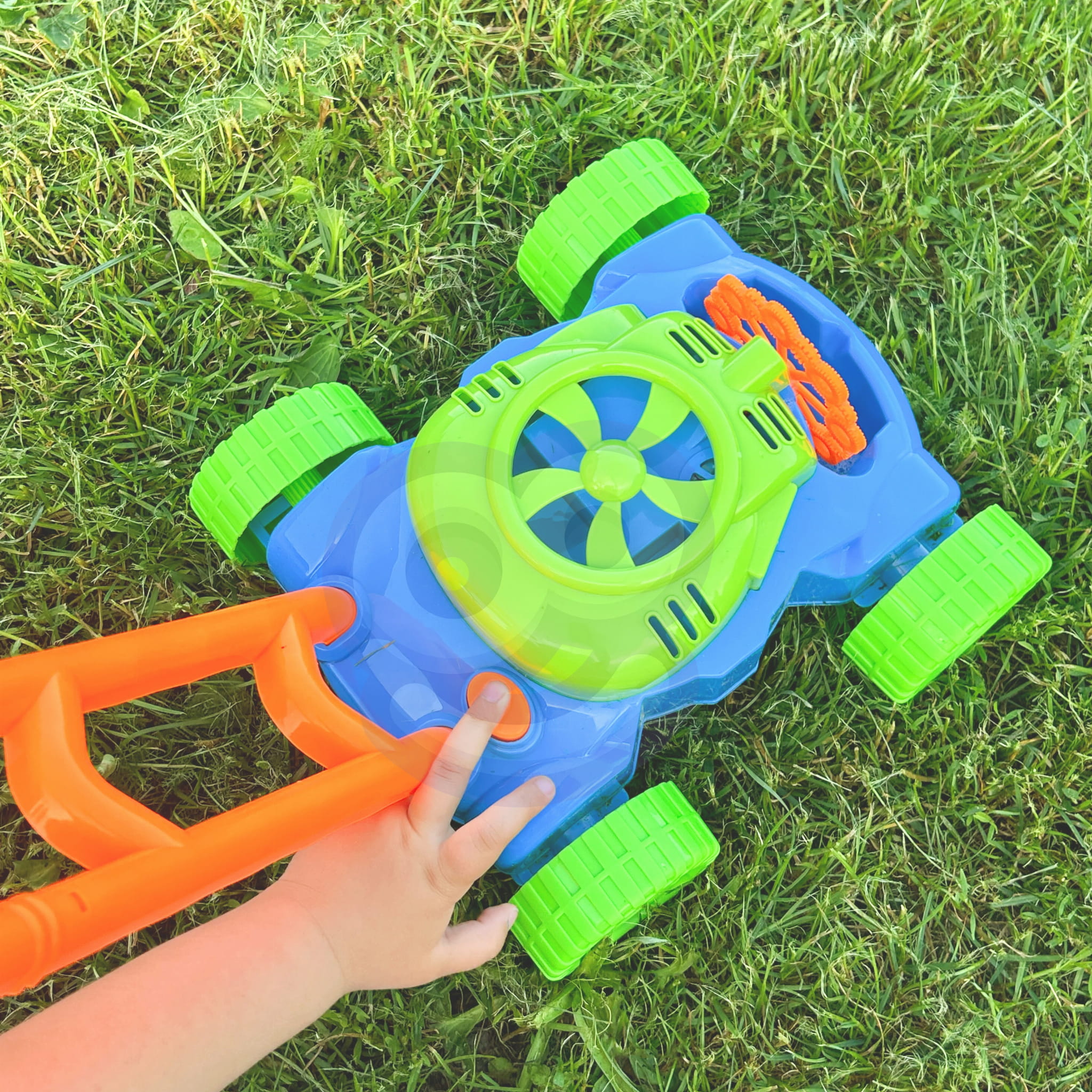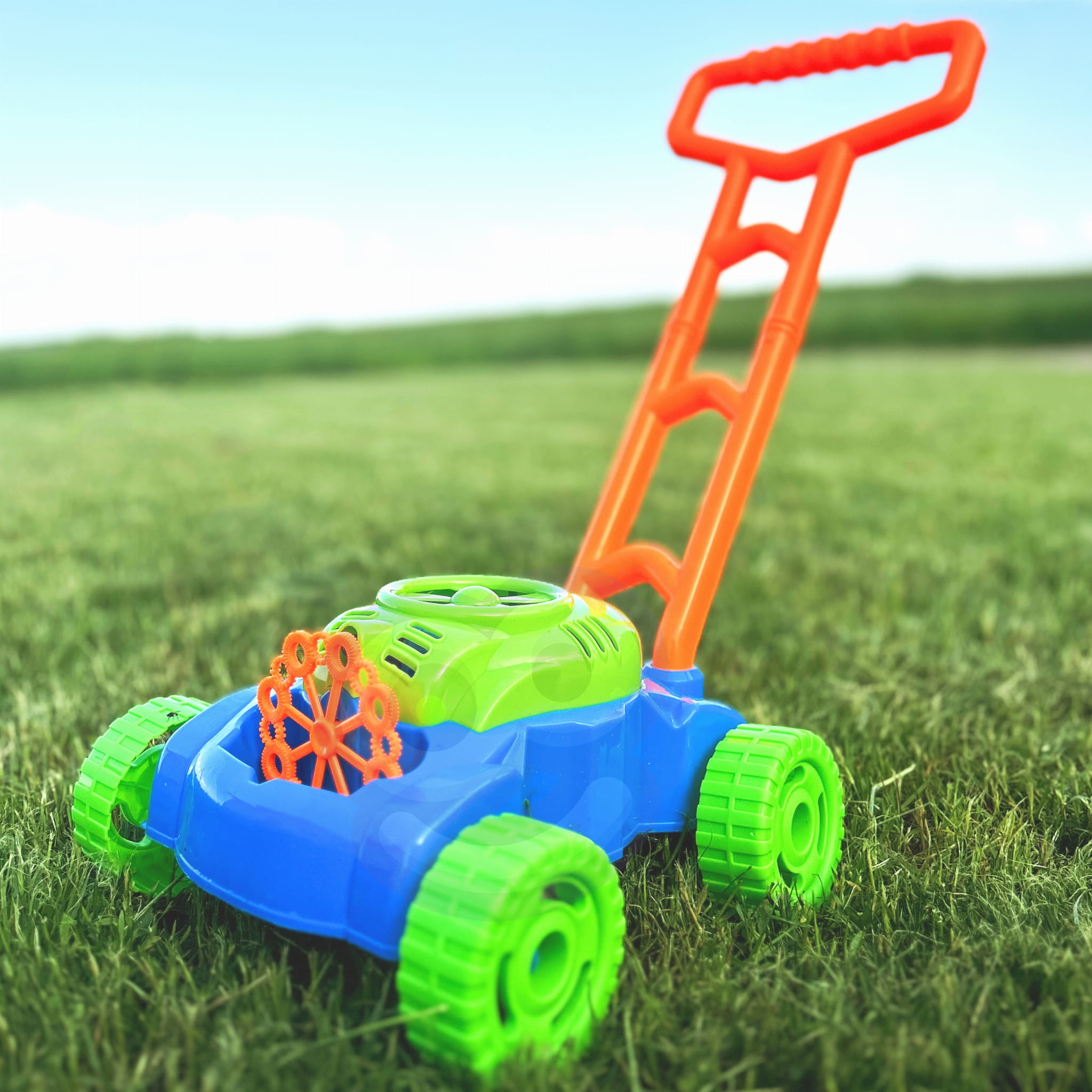 Bańki puszczane są automatycznie. Mały wiatraczek znajdujący się w górnej części obudowy silnika kosiarki, wytwarza strumień powietrza, który kierowany jest na 8 kręcących się pierścieni. Zanurzają się one w pojemniku na płyn do wytwarzania baniek i po kolei podsuwają pod małą dyszę. W ten sposób bańki puszczane są nieustannie. Dzięki 8 pierścieniom, zabawka wytwarza równocześnie dużą liczbę baniek. Dodatkową zaletą kosiarki są wydawane przez nią dźwięki. Dźwięki jakie możemy usłyszeć to dźwięk baniek mydlanych oraz melodia z bajki. Przy tylnych kółkach umieszczone zostały plastikowe zakładki, które podczas jazdy terkoczą imitując tym samym odgłos wydawany przez prawdziwe urządzenie. Bajecznie kolorowa kosiarka to propozycja niekończącej się zabawy, pobudzającej kreatywność i rozwijającej zdolności manualne. Możesz mieć pewność, że maluch nie będzie miał czasu na nudę.