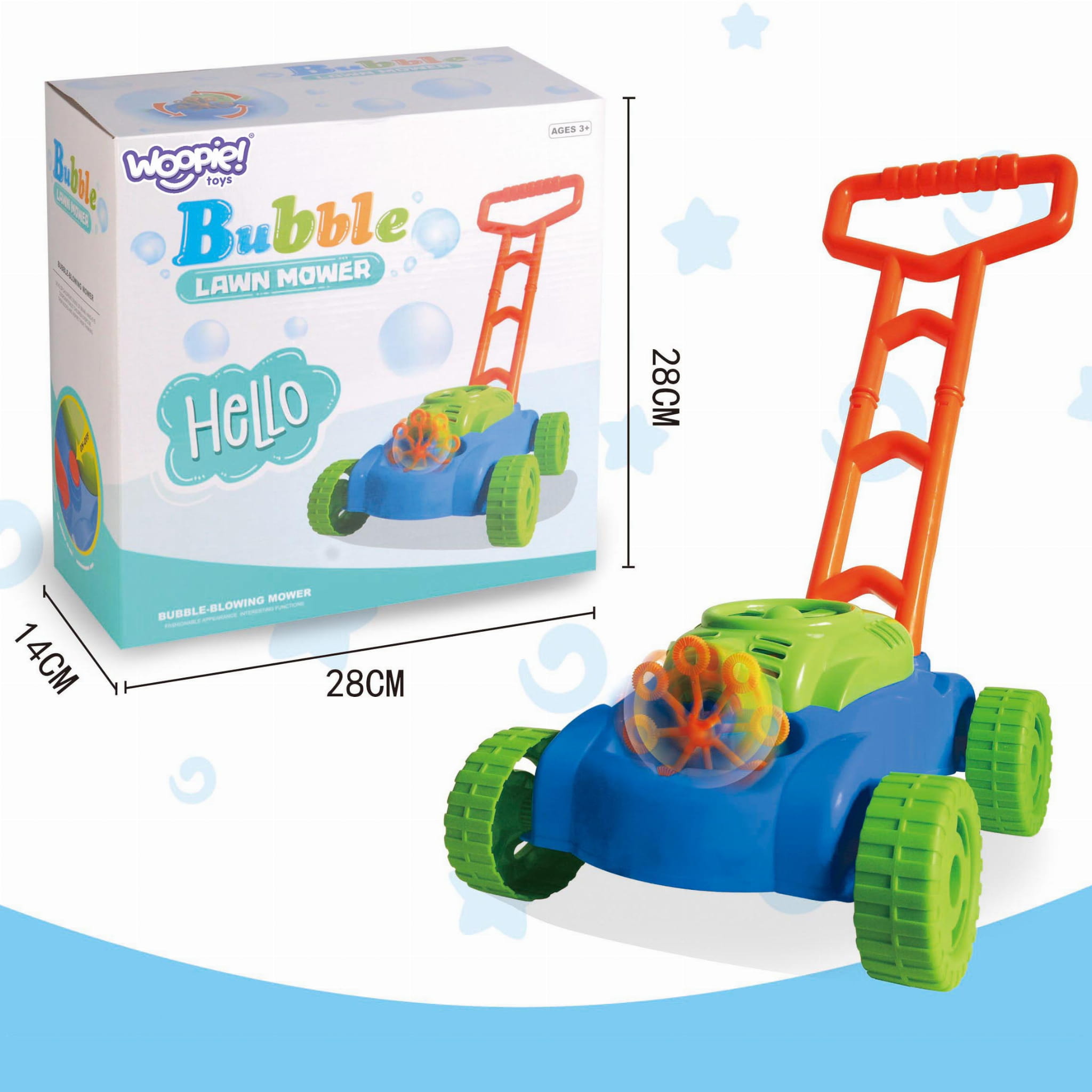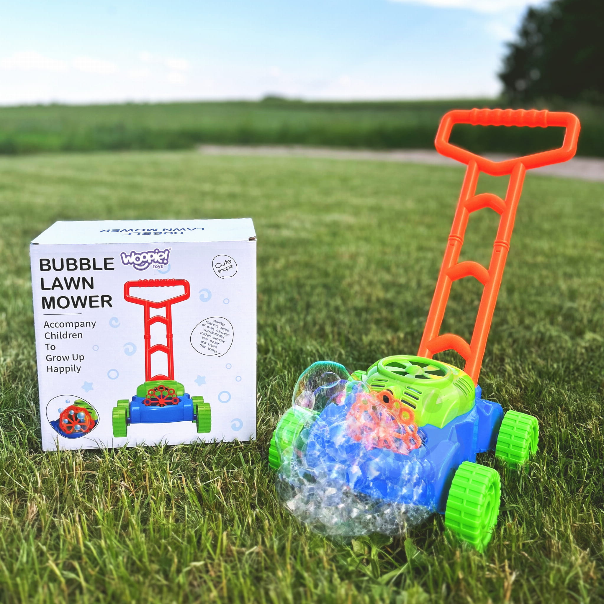 Rewelacyjna kosiarka puszczająca bańki mydlane od marki WOOPIE Skradnie serce każdego malucha. Imituje odgłosy wydawane przez prawdziwą kosiarkę. Dodatkowo słychać odgłosy puszczanych baniek mydlanych, a w tle leci melodia z bajki. Udana zabawa na świeżym powietrzu może być jeszcze bardziej ciekawa i atrakcyjna. Kosiarka zabawkowa nie tylko nauczy dziecko, jak dbać o trawnik, ale rozweseli najmłodszych i wywoła szczery uśmiech dzięki funkcji puszczania niezliczonej ilości kolorowych baniek mydlanych.