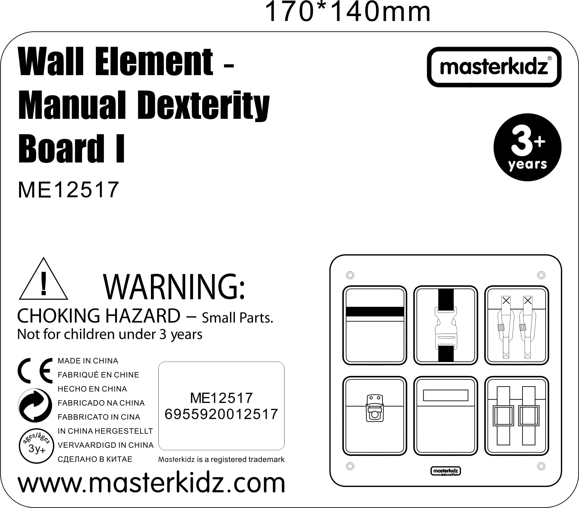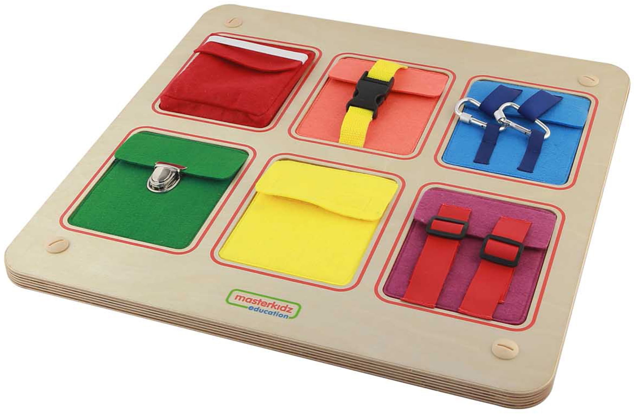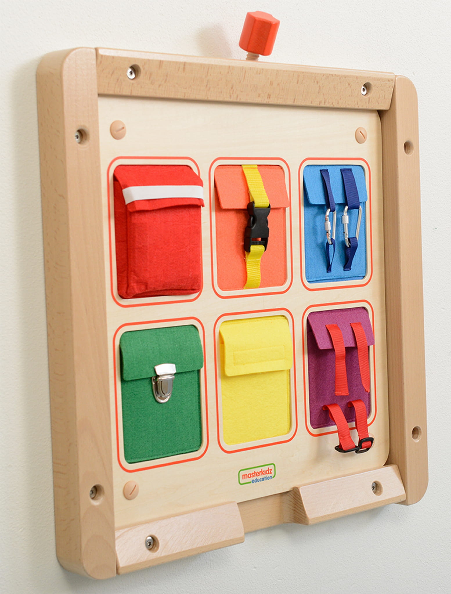 Tablica ścienna marki Masterkidz, którą można zamontować na ścianie, lub w systemie Masterkidz Flex. Tablica przedstawia 6 kolorowych kieszonek z materiału, które zamknięte są za pomocą różnych zapięć i zamków. Dziecko za ich pomocą może nauczyć się otwierać i zamykać poszczególne typy zamknięć.