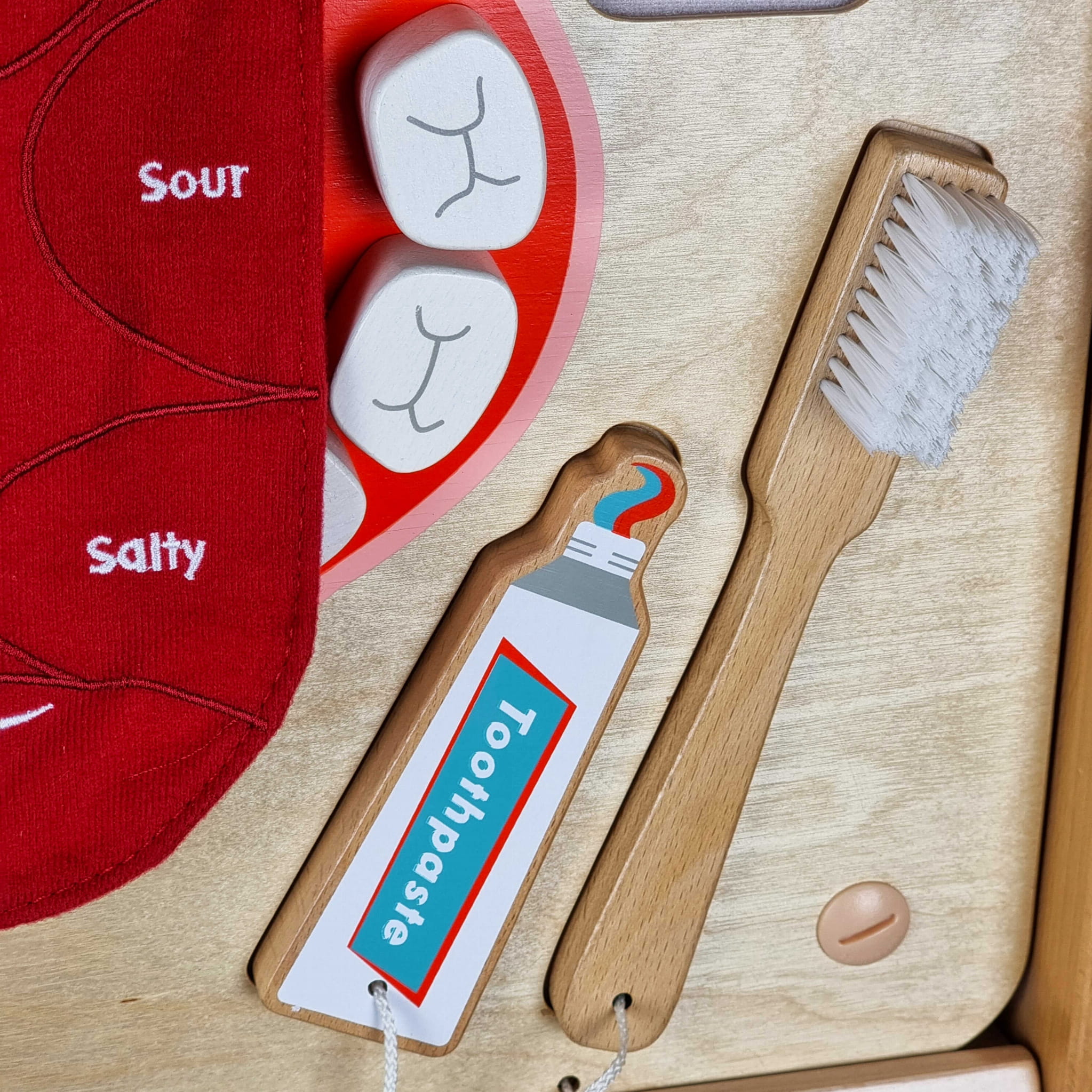 - - Drewniana tablica edukacyjna, która pomoże dziecku ćwiczyć szczotkowanie zębów i używanie nitki dentystycznej.