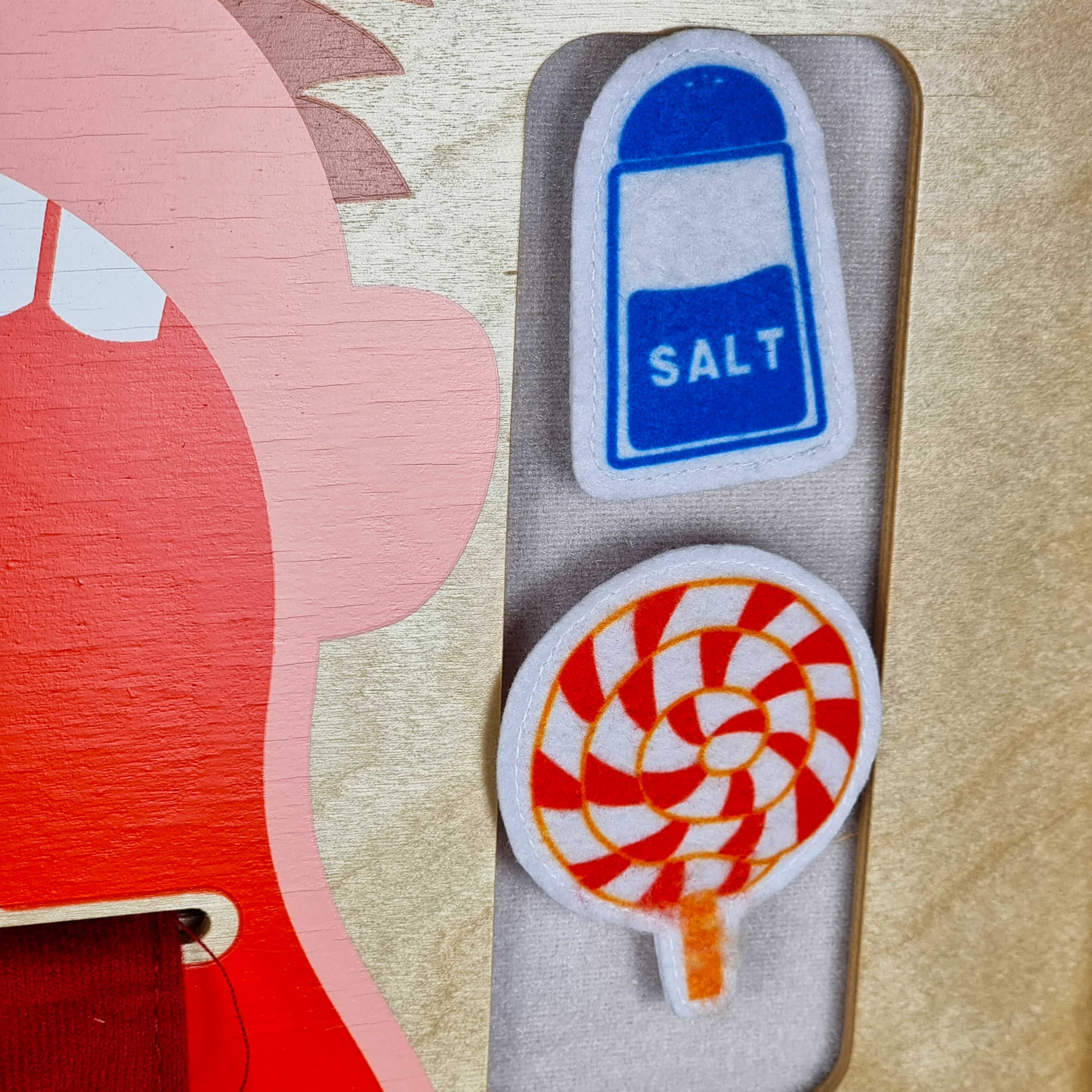 - - Zestaw zawiera produkty spożywcze, które za pomocą rzepów trzeba dopasować do odpowiedniego smaku na języku.