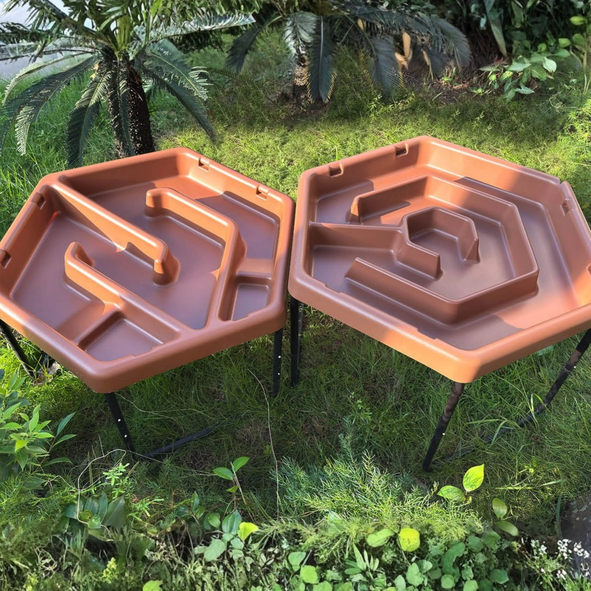 Sześciokątny stolik do zabawy to doskonałe narzędzie do rozwijania wyobraźni i kreatywności u dzieci. Specjalnie wyprofilowane koryta i wyspy tworzą wodny labirynt, który zachęca malucha do poznawania zasad fizyki, obserwowania przepływu wody i organizowania wyścigów łódek. Dzięki stonowanej, naturalnej kolorystyce zabawka doskonale wpisuje się w estetykę nowoczesnego ogrodu, a stabilna konstrukcja pozwala na bezpieczną zabawę na stojąco, co angażuje całe ciało dziecka.