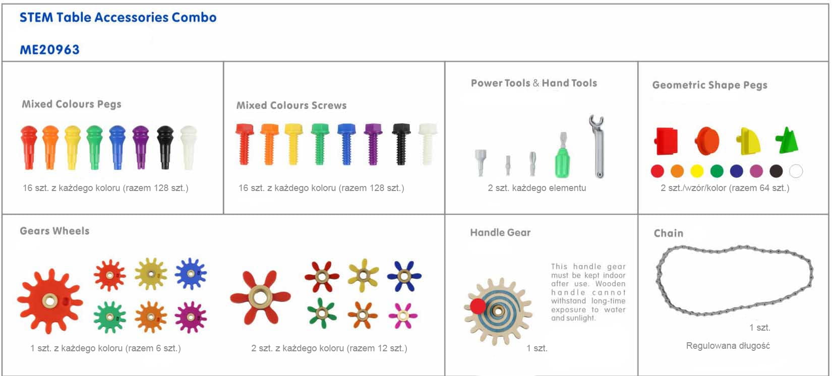 Zestaw Akcesoriów STEM od marki Masterkidz zawiera w sobie podstawowe akcesoria do zabawy z systemem STEM Masterkidz. Znajdziemy w nim 128 szt. kołeczków, 128 szt. śrubek, 64 szt. kołeczków geometrycznych, 2 zestawy narzędzi, 18 szt. kół zębatych, koło z uchwytem oraz łańcuch. Zestaw ten jest zaprojektowany do kreatywnej zabawy i poznawania świata nauki poprzez eksperymentowanie i konstruowanie. Dzieci mogą używać tych akcesoriów do tworzenia różnorodnych wzorów i konstrukcji, co rozwija ich zdolności manualne, logiczne myślenie oraz zrozumienie podstawowych zasad mechaniki i inżynierii. Ten zestaw to doskonały start dla zabawy z systemem STEM od Masterkidz. Jest kompatybilny zarówno z tablicami ściennymi, jak i wolnostojącymi, przy czym do rozpoczęcia zabawy wymagana jest jedna z nich.