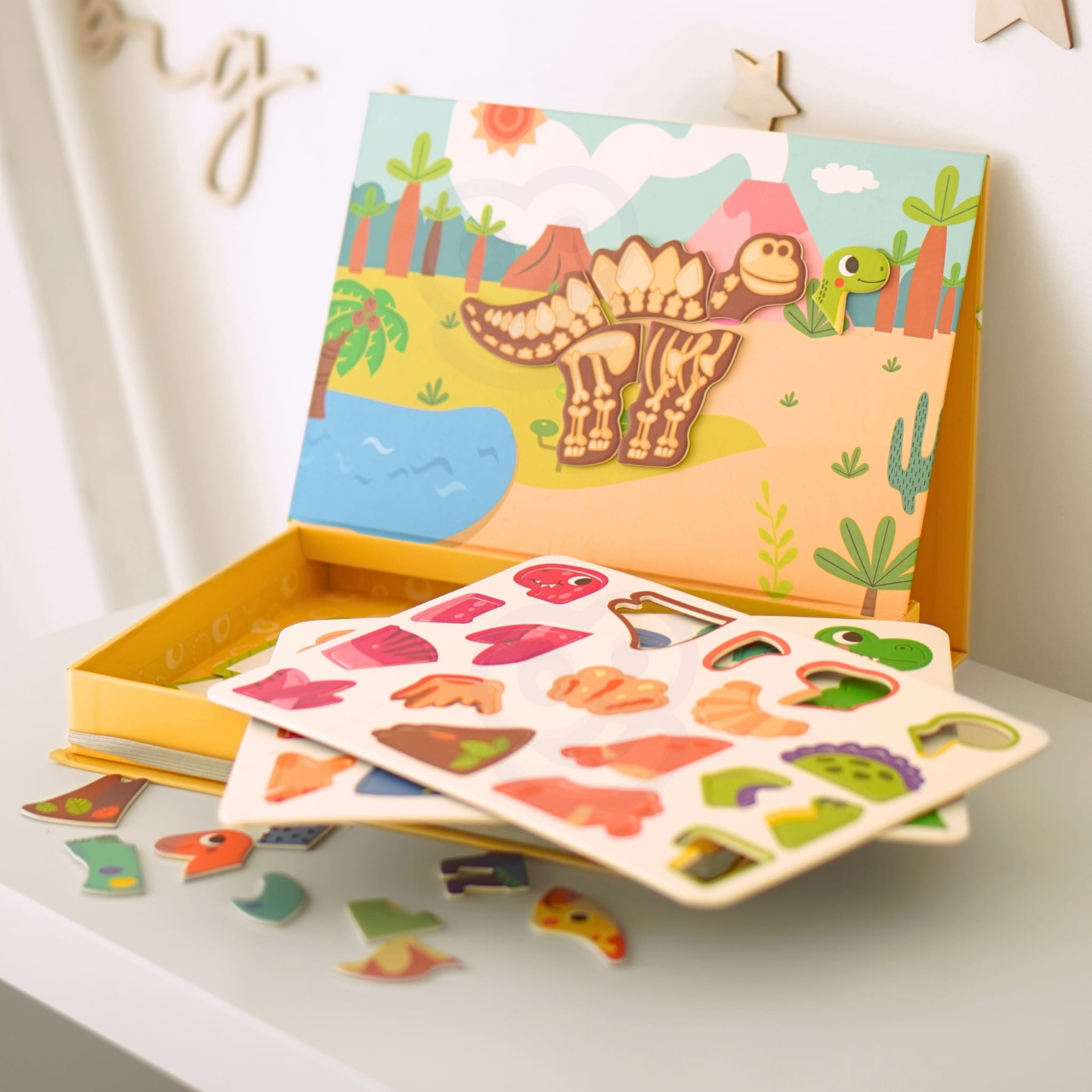 Twórcza zabawka dla małych miłośników dinozaurów. Układanie magnetycznych puzzli rozwija wyobraźnię, kreatywność i małą motorykę.