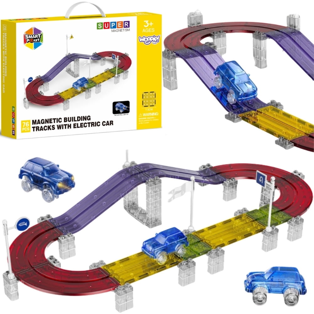 Magnetyczny tor wyścigowy marki Woopie to zabawka, która zamienia budowanie konstrukcji w fascynującą przygodę. Dzięki magnetycznym elementom dziecko może samodzielnie tworzyć różnorodne, wielopoziomowe tory – mosty, rampy i zakręty, po których jeździ świecące autko LED. Przezroczyste, kolorowe części toru przyciągają uwagę i zachęcają do zabawy zarówno w dzień, jak i wieczorem.