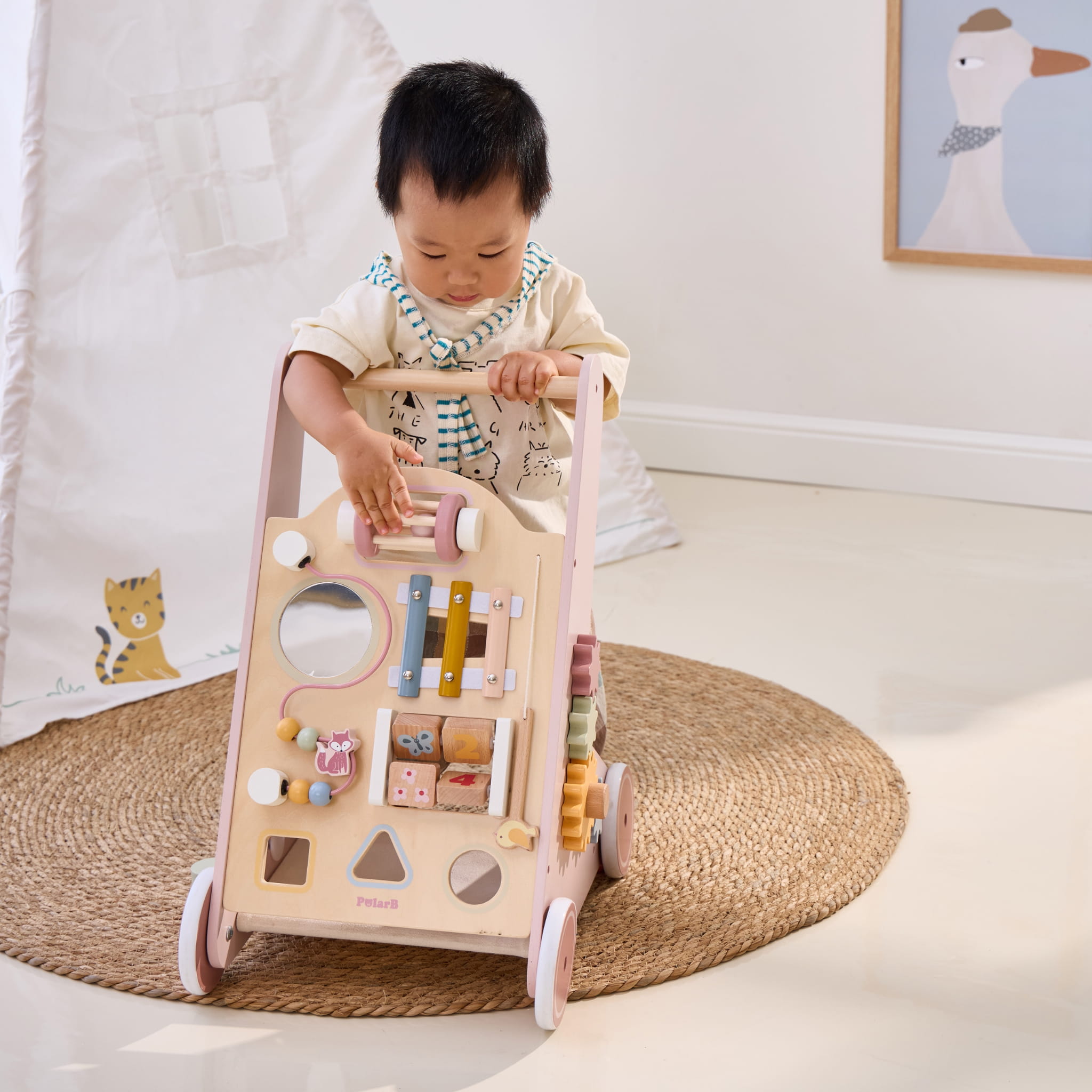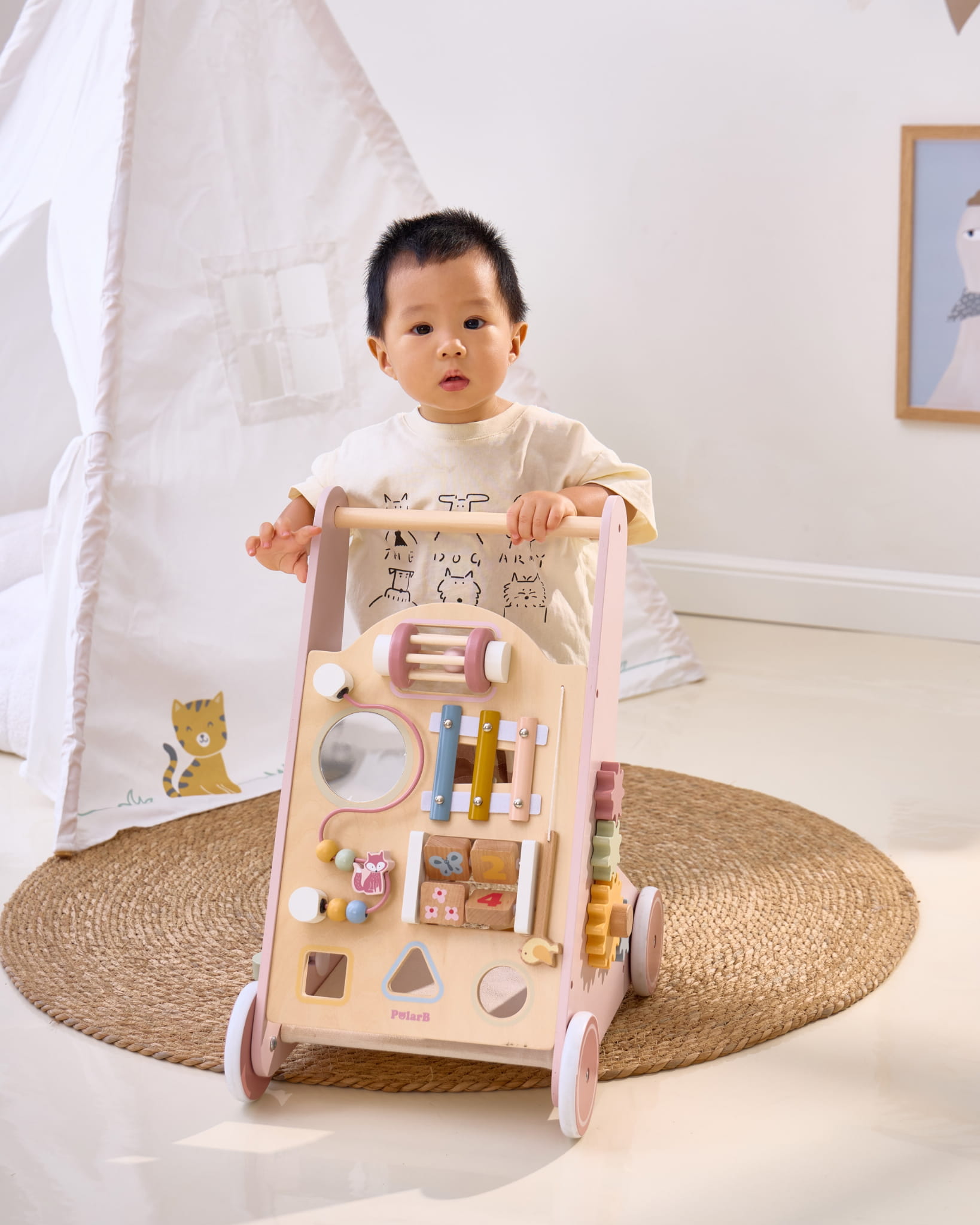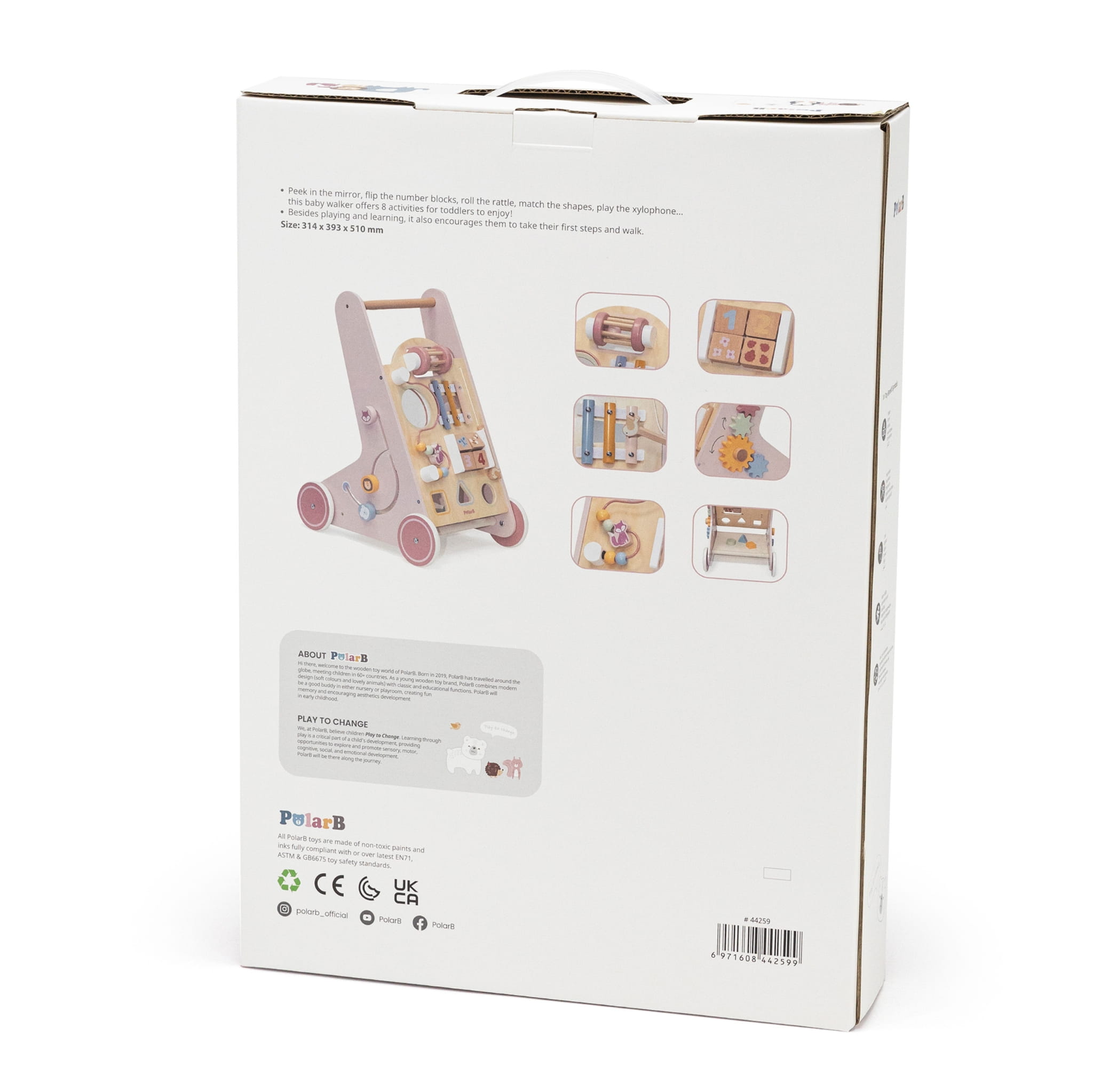 Różowy Chodzik dla Maluszków od marki PolarB to świetna zabawa i nauka w jednym! Oferuje interaktywne aktywności, takie jak podglądanie się w lusterku, obracanie klocków, turlanie grzechotki, dopasowywanie kształtów oraz granie na cymbałkach. Dzięki temu chodzik zachęca dzieci do stawiania pierwszych kroków, co jest kluczowym etapem w ich rozwoju. Dodatkowo, z tyłu znajduje się praktyczny schowek, idealny na ulubione zabawki.