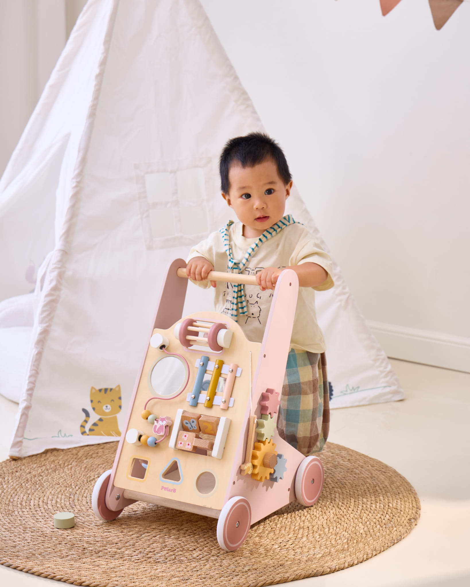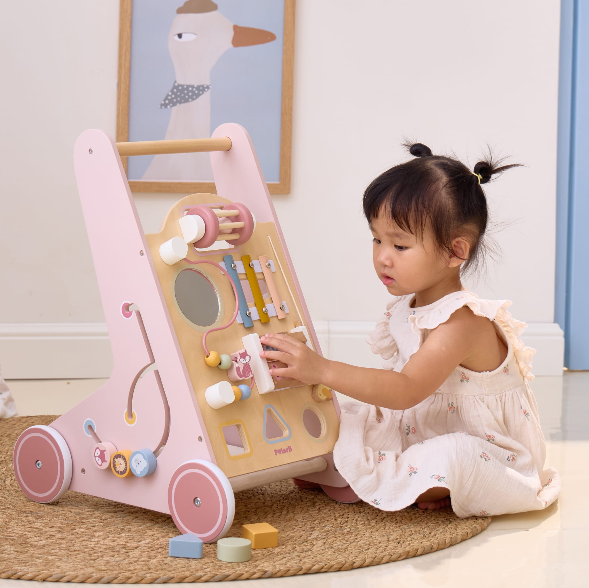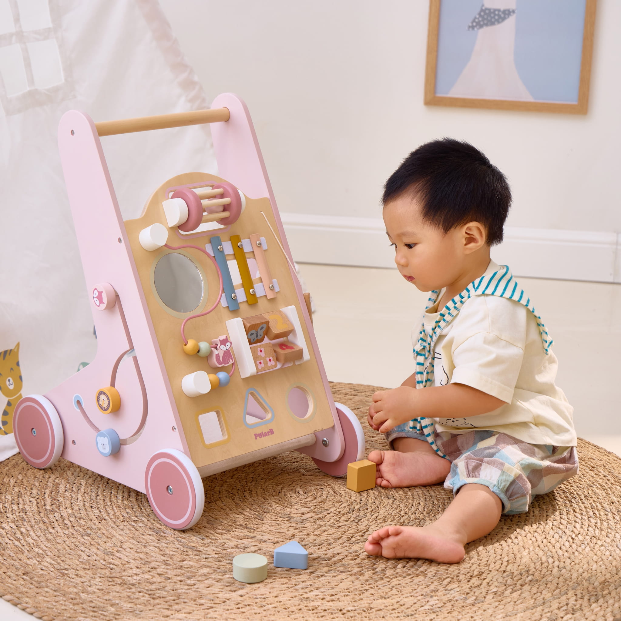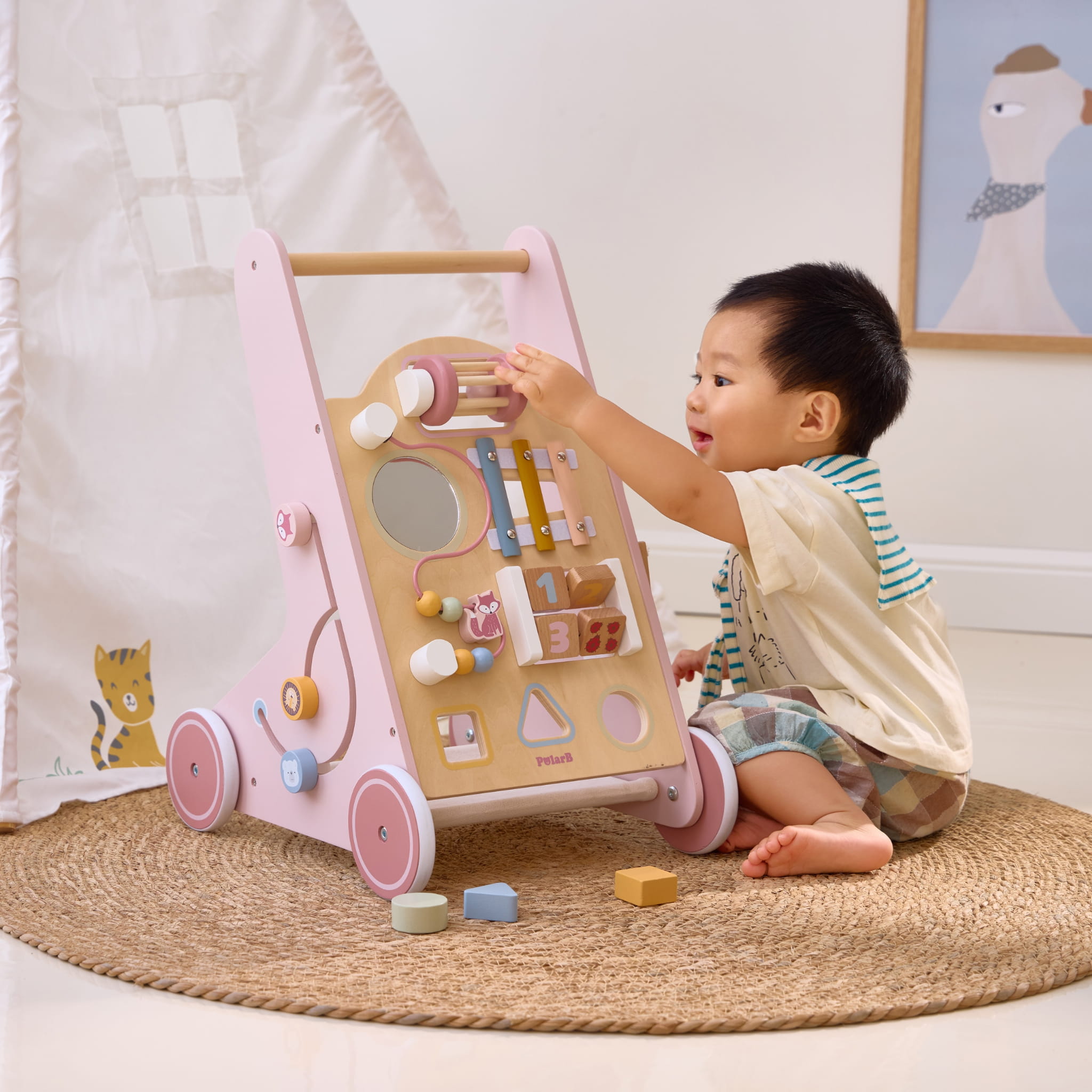 Różowy Chodzik dla Maluszków od marki PolarB to świetna zabawa i nauka w jednym! Oferuje interaktywne aktywności, takie jak podglądanie się w lusterku, obracanie klocków, turlanie grzechotki, dopasowywanie kształtów oraz granie na cymbałkach. Dzięki temu chodzik zachęca dzieci do stawiania pierwszych kroków, co jest kluczowym etapem w ich rozwoju. Dodatkowo, z tyłu znajduje się praktyczny schowek, idealny na ulubione zabawki.