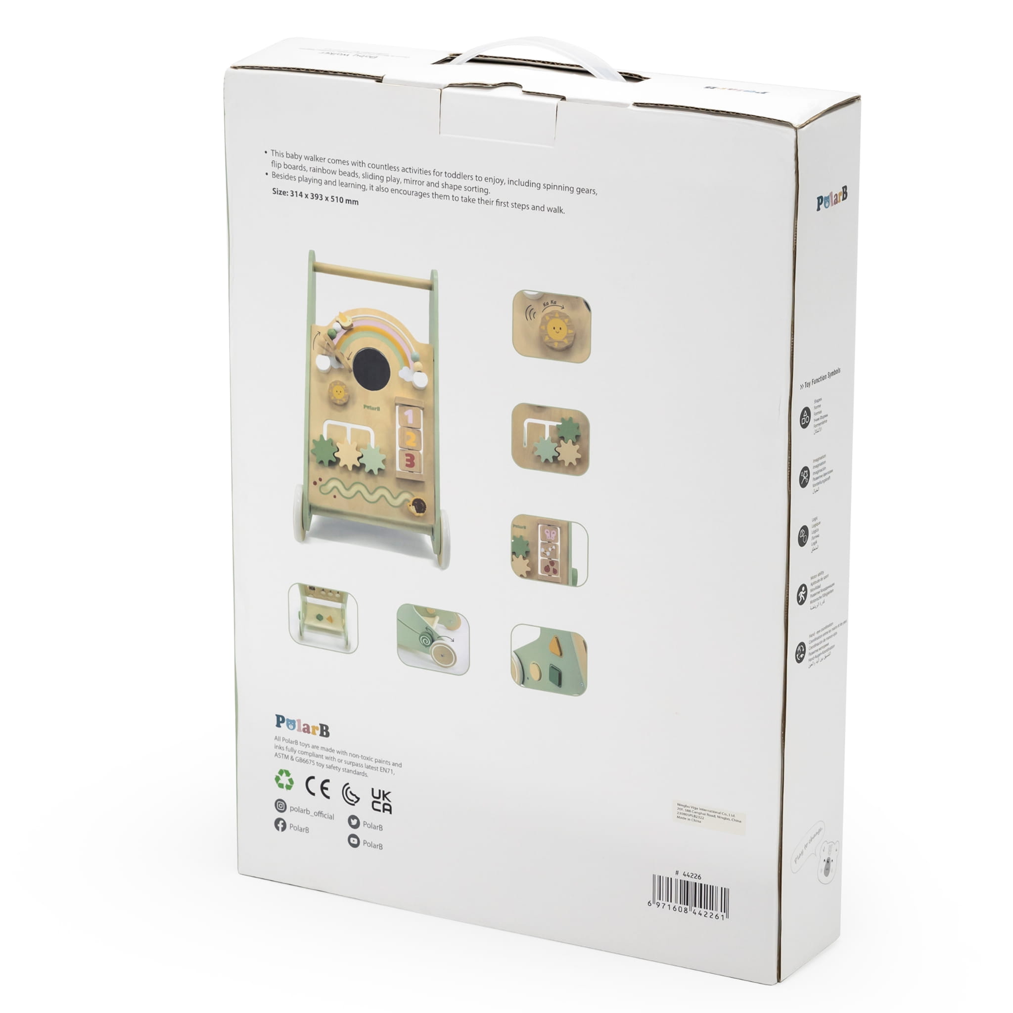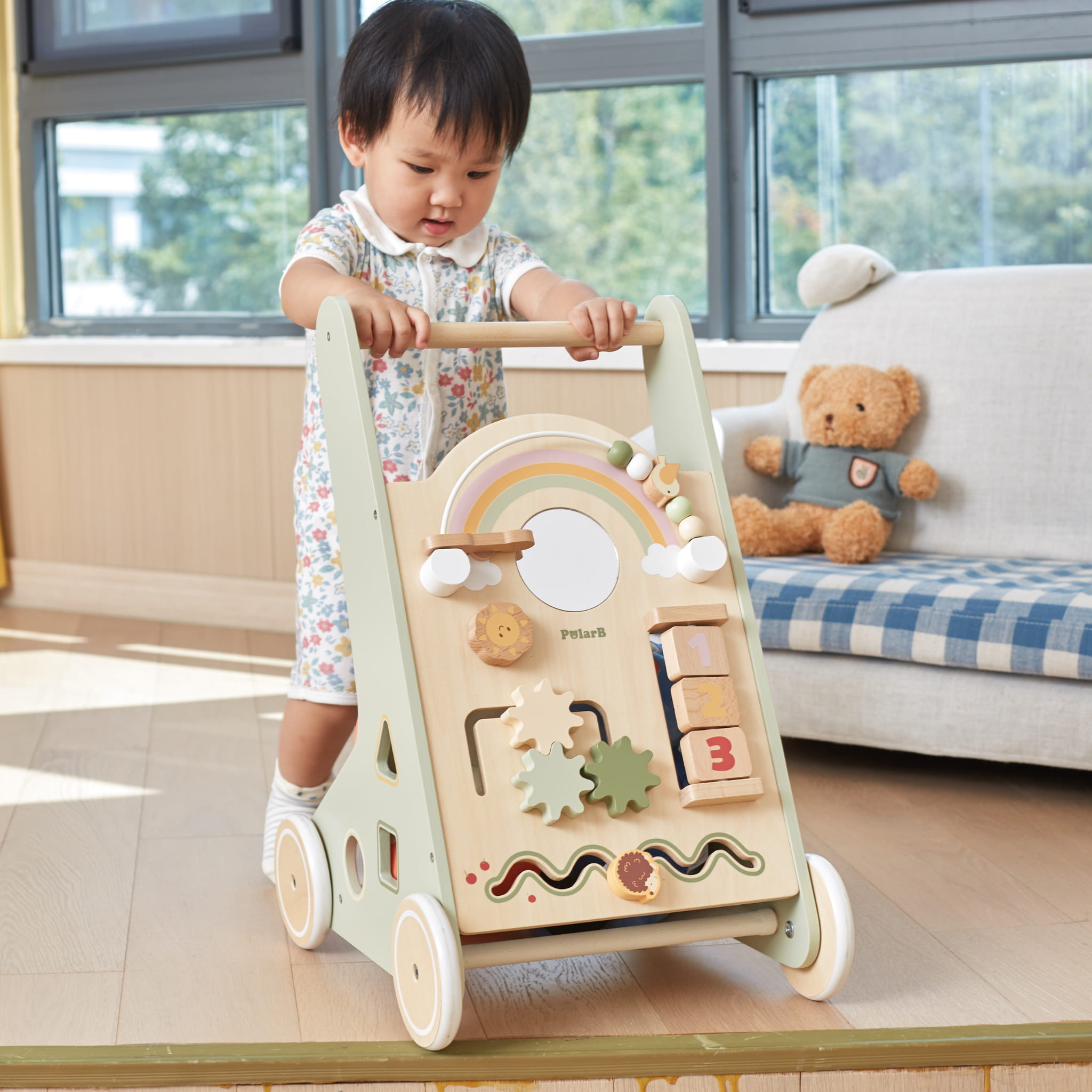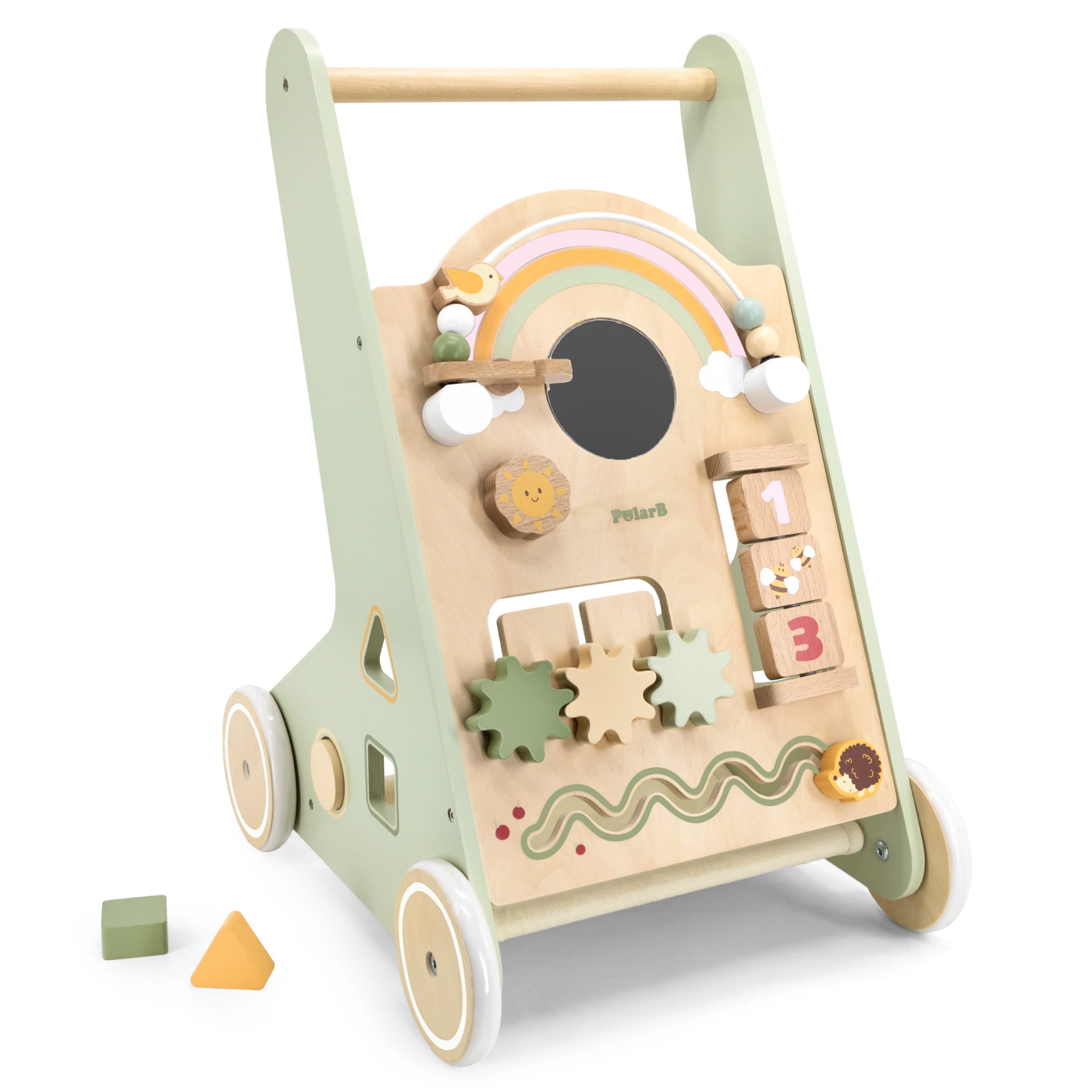 Pchacz edukacyjny dla dzieci z serii PolarB zaprojektowany przez cenionego producenta zabawek firmę Viga wyposażony jest w wiele atrakcji, które zainteresują i zajmą na długi czas maluchy. Znajdują się w nim kołowrotki, tablice do flipboardu, tęczowe koraliki oraz przesuwana plansza. Dzięki temu dziecko może rozwijać swoje zmysły i eksplorować świat wokół siebie. W chodziku znajduje się również lusterko i sekcja do sortowania kształtów, co pozytywnie wpływa na rozwój poznawczy.