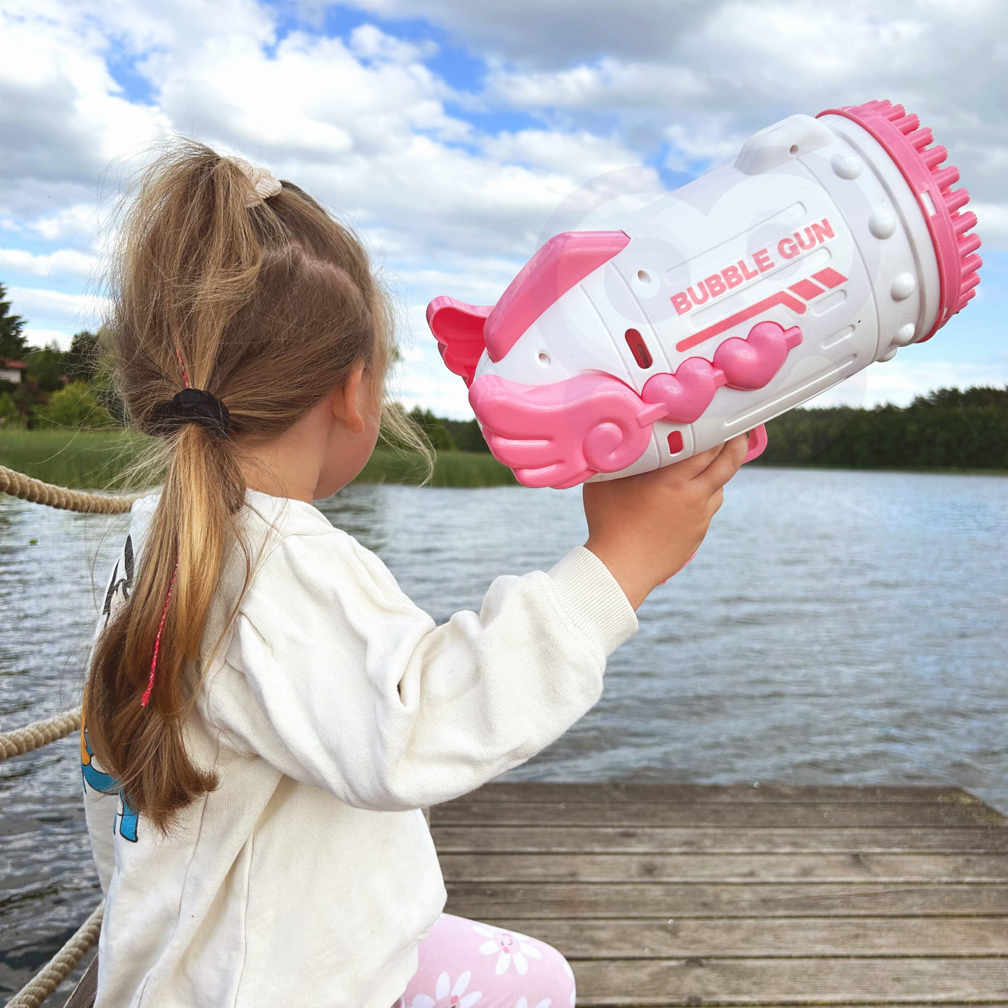 - Łatwy w użyciu i ładowaniu- ergonomiczny uchwyt pistoletu zapewnia wygodne trzymanie i precyzyjne celowanie. Wystarczy napełnić pojemnik płynem i nacisnąć spust, aby rozpocząć pokaz baniek.