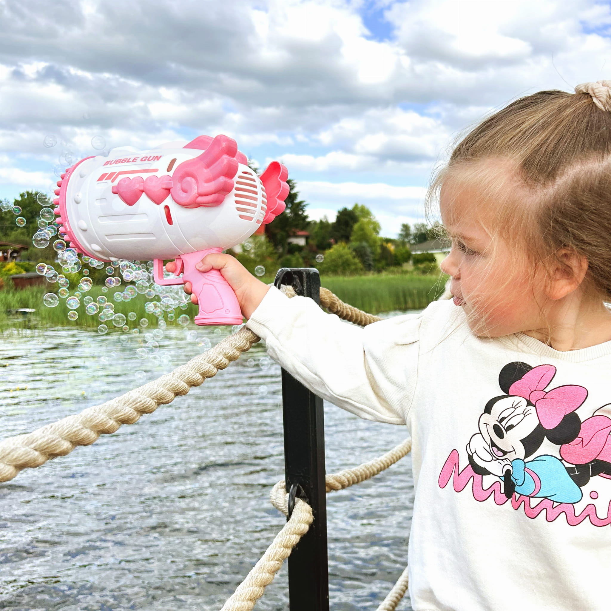 - Wydajny mechanizm- dzięki sprawnej konstrukcji, pistolet równomiernie uwalnia płyn do baniek przez wszystkie otwory, co zapewnia spektakularny efekt baniek w powietrzu.