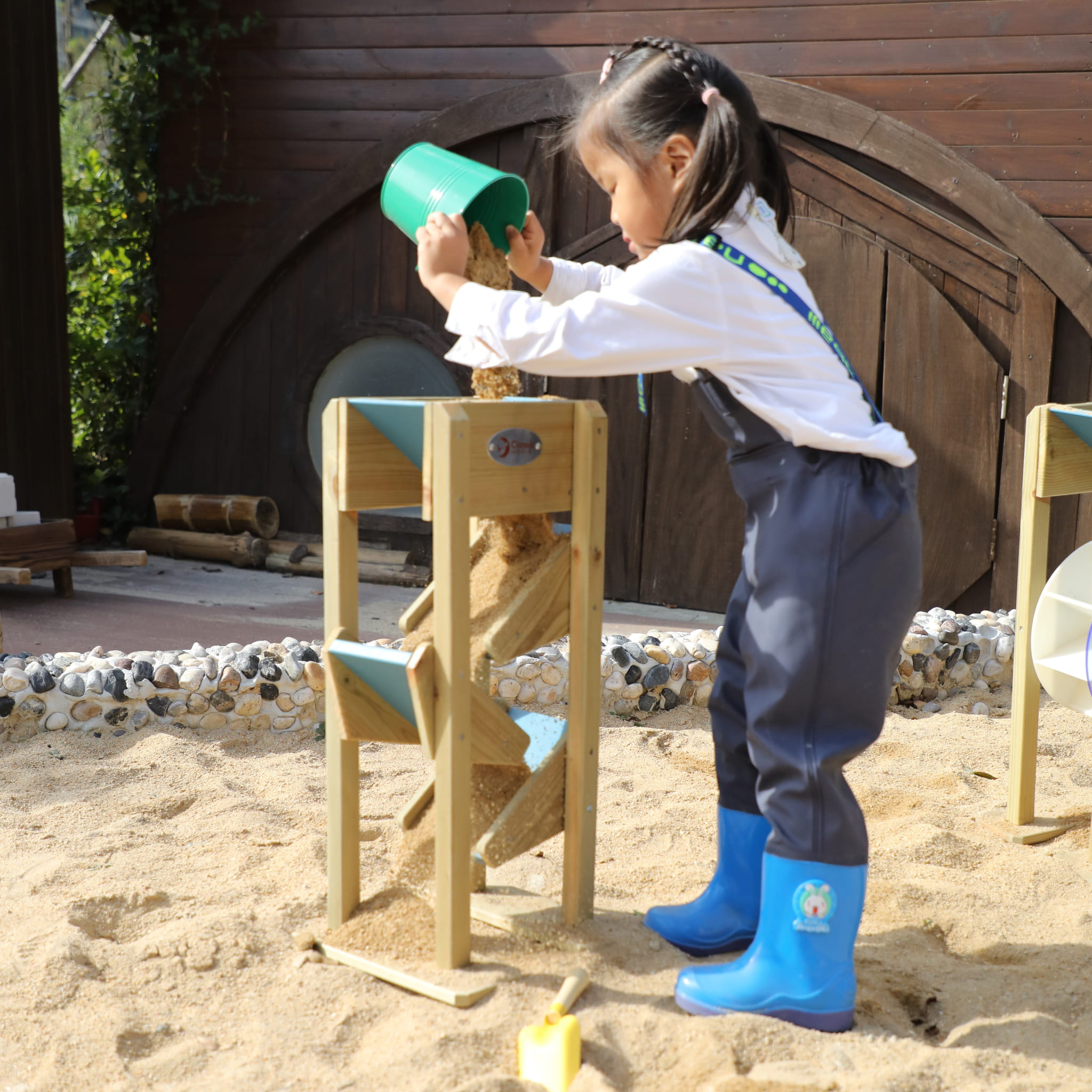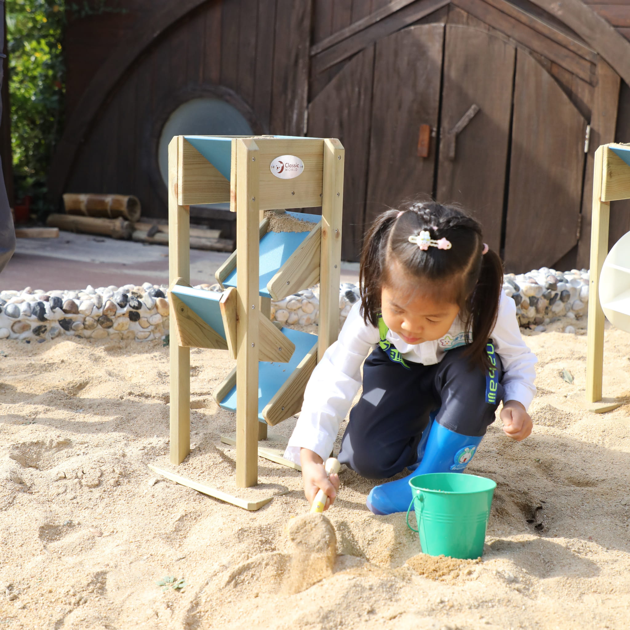 Drewniana Zjeżdżalnia Na Piasek od marki CLASSIC WORLD to drewniana, dobrej jakości zabawka, która idealnie dopełni piaskownicę twojego dziecka, ale także place zabaw w placówkach edukacyjnych. Składa się ona z lejka umieszczonego na samej górze, do którego dziecko wsypuje piasek, który następnie po 3 małych zjeżdżalniach zlatuje na dół. Używanie tej drewnianej zjeżdżalni to świetna zabawa sensoryczna dla dziecka, która dobrze wpływa na małą motorykę.
