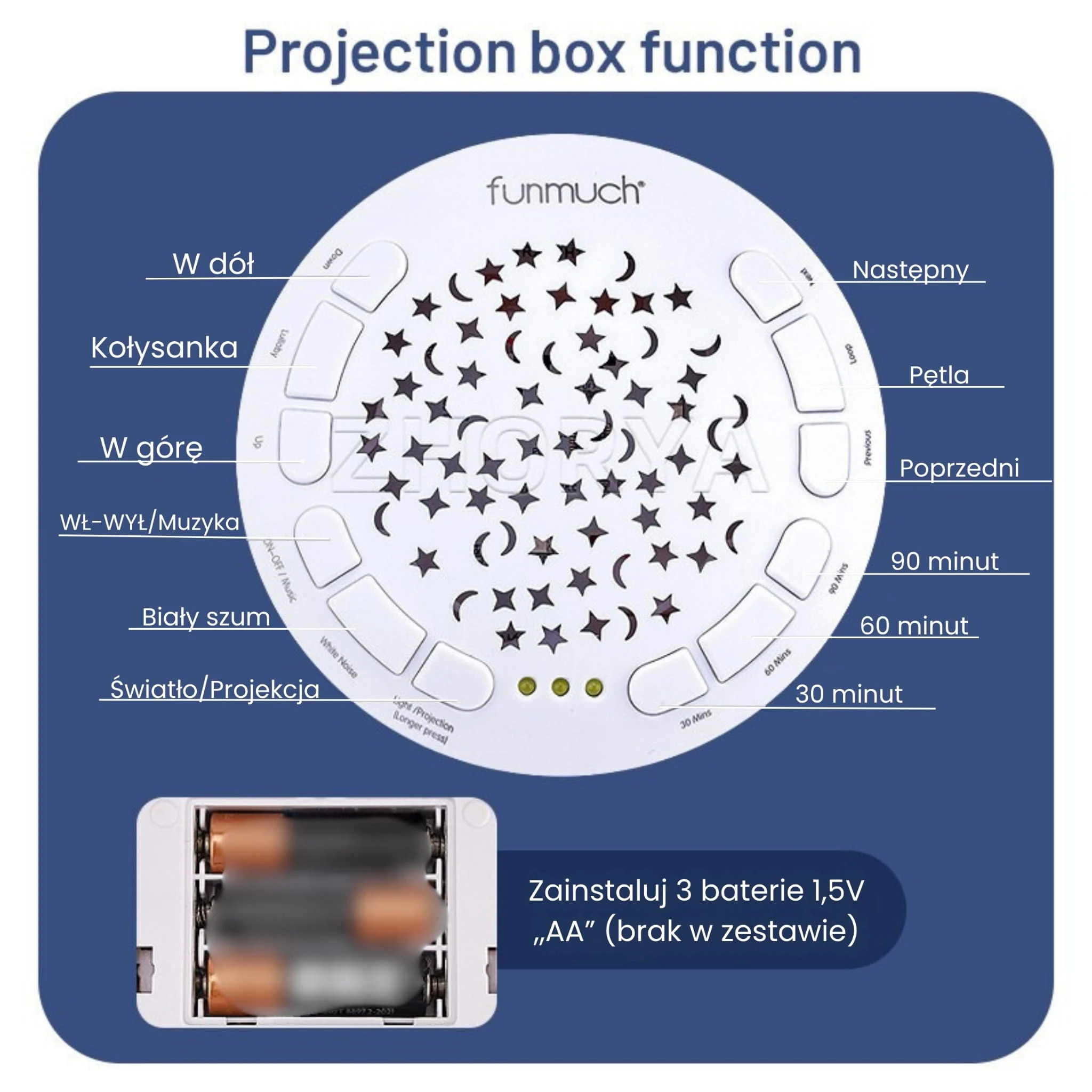 Słonik wyświetla delikatne gwiazdy i księżyce, tworząc w pokoju relaksującą atmosferę. Wbudowane melodie i biały szum pomagają wyciszyć dziecko przed snem.