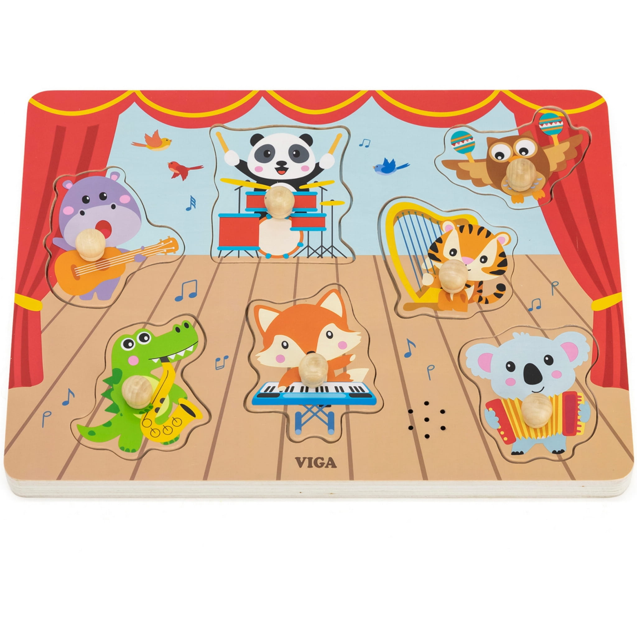 Drewniane puzzle dźwiękowe dla dzieci 18m+. Po dopasowaniu elementu dziecko usłyszy realistyczny dźwięk instrumentu – nauka przez zabawę i doświadczenie.