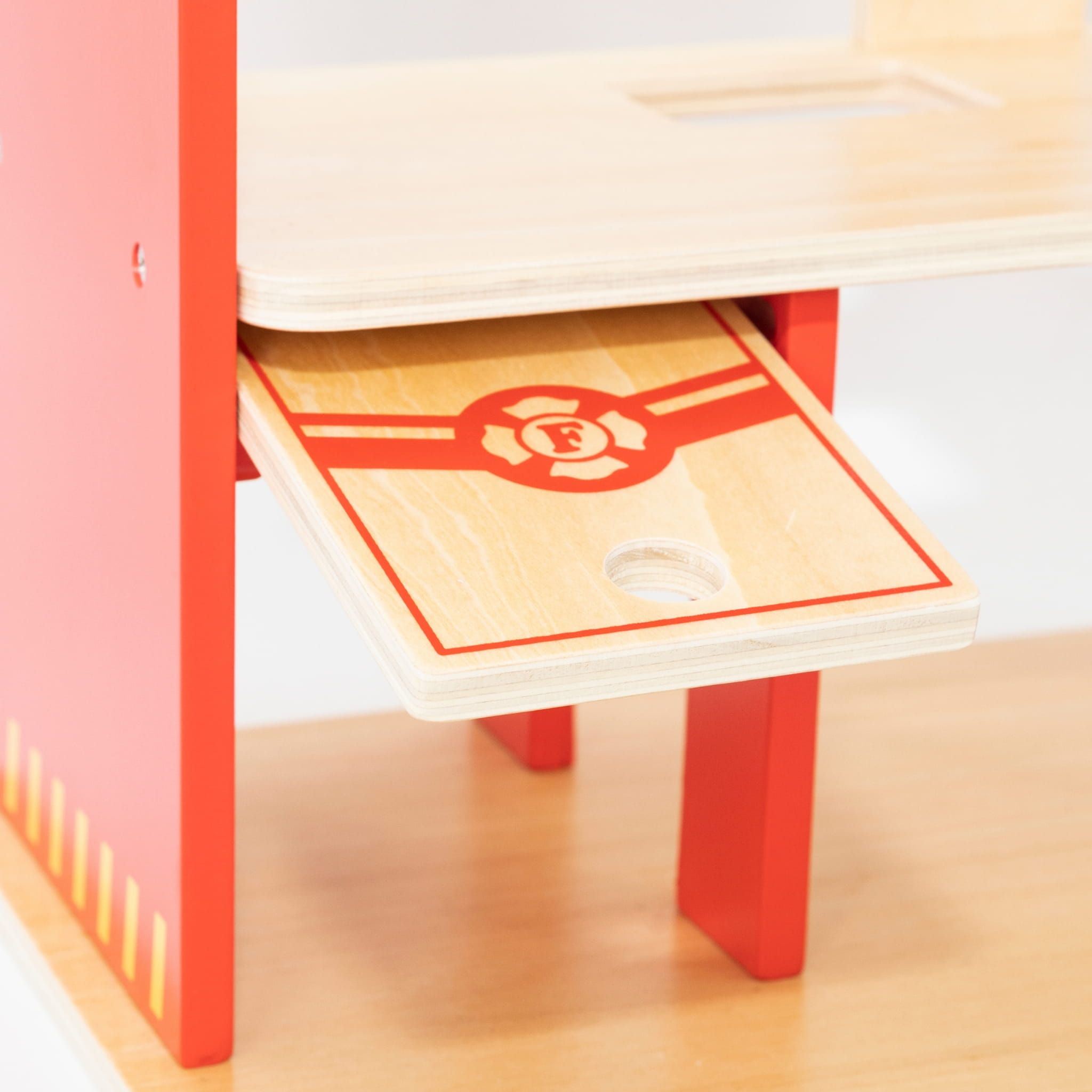 Drugie piętro z przytulną strefą odpoczynku dla strażaków, działającym dzwonkiem i zjeżdżalnią umożliwiającą szybką reakcję na alarmy