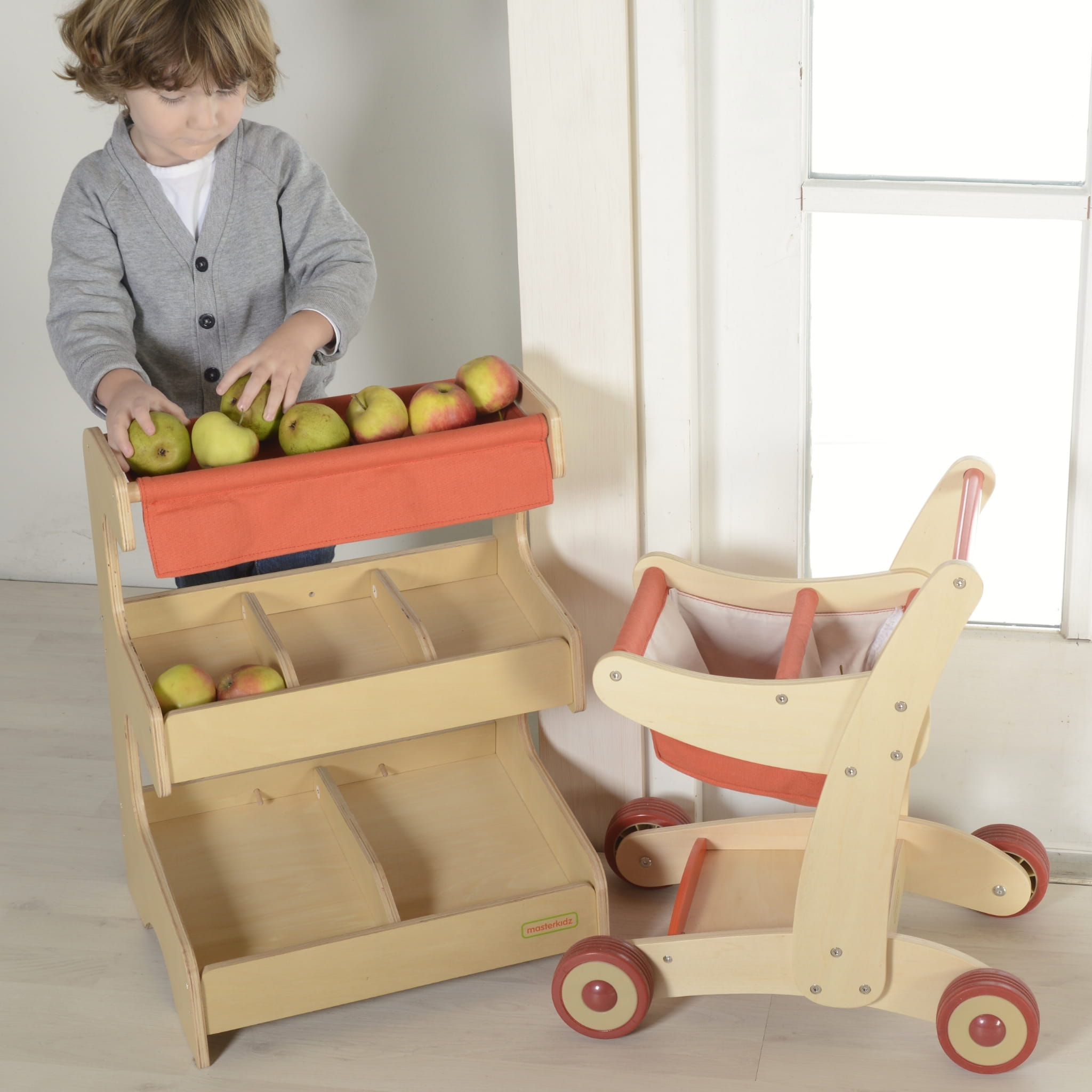 Stoisko targowe marki Masterkidz to drewniana zabawka edukacyjna, która umożliwia dzieciom odgrywanie ról i tworzenie realistycznych scenariuszy zabawy w sklep. Dzięki przemyślanej konstrukcji dzieci mogą samodzielnie organizować przestrzeń sprzedażową, układać produkty oraz prowadzić „handel” w formie zabawy.