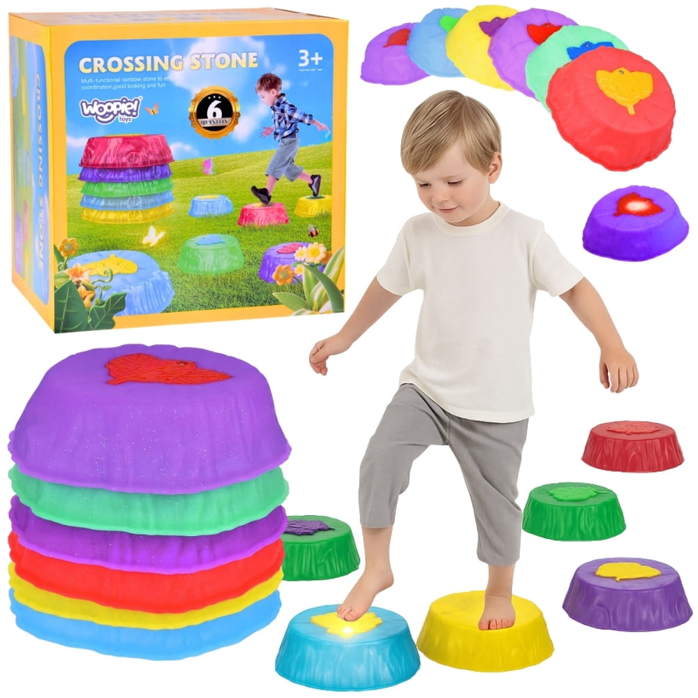 Zestaw 6 świecących kamieni balansujących WOOPIE to zabawka sensoryczna rozwijająca równowagę, koordynację i motorykę dużą przez aktywną zabawę.