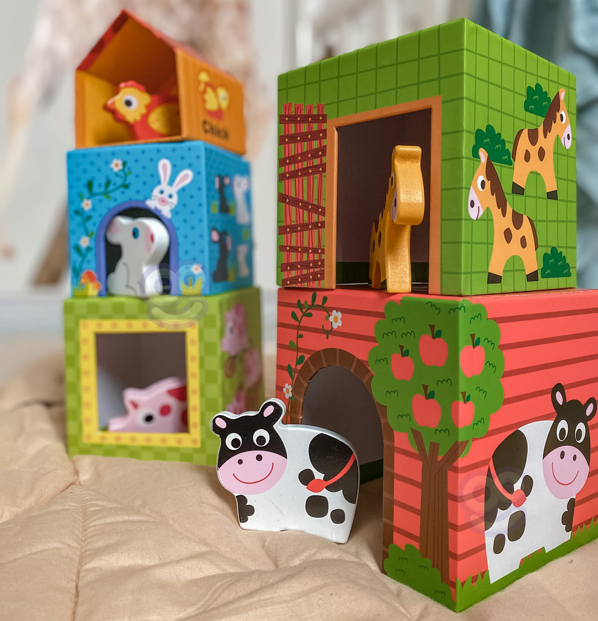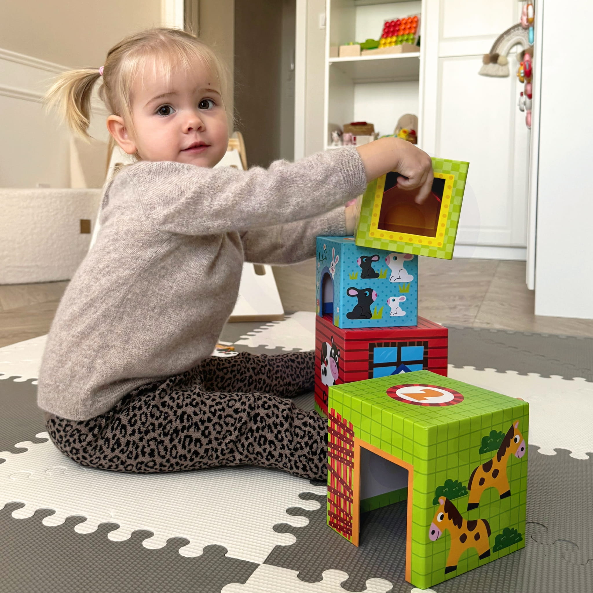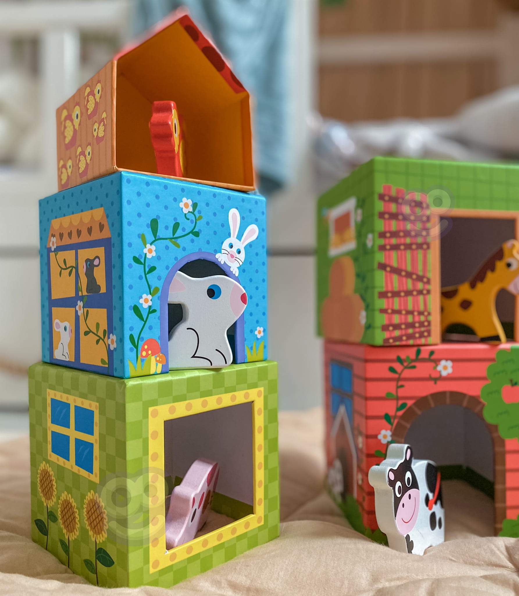 Każda kostka posiada otwór, w którym można schować odpowiednie zwierzątko, co dodatkowo rozwija zdolności poznawcze i uczy rozumienia przestrzeni. Napisy w języku angielskim wspierają pierwszy kontakt z językiem obcym. Kostki mogą również pełnić funkcję praktycznych pudełek do przechowywania drobnych przedmiotów.