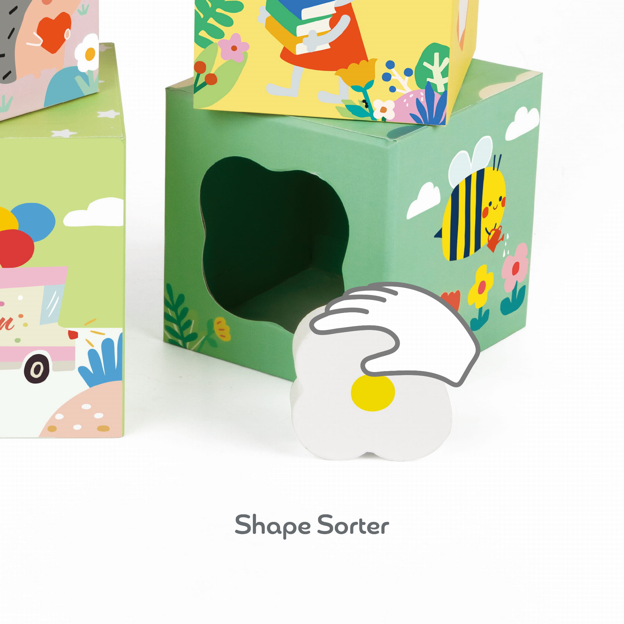 Zestaw składa się z 5 kostek o różnych rozmiarach oraz 5 elementów do sortowania o różnych kształtach. Każda kostka ozdobiona jest ilustracjami przedstawiającymi motywy leśne – zwierzęta, rośliny i owady – co dodatkowo zachęca dziecko do poznawania przyrody i rozwijania ciekawości świata.
