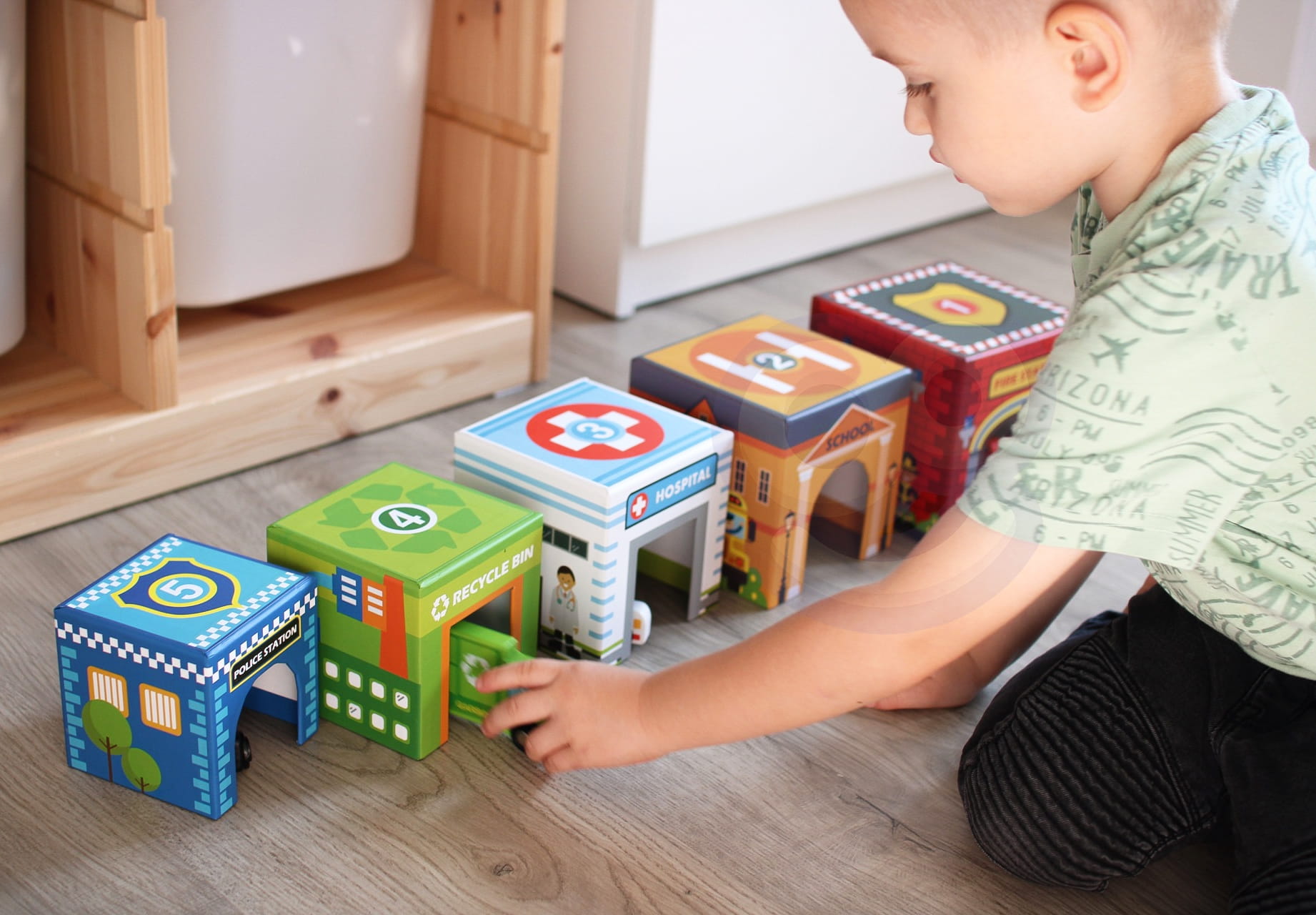 Zestaw składa się z 5 kolorowych kostek o różnych rozmiarach oraz 5 drewnianych pojazdów z gumowymi kółkami. Dziecko może układać wieżę, dopasowywać elementy, uczyć się liczb od 1 do 5 oraz poznawać świat miasta – szkołę, szpital czy straż pożarną. Kostki posiadają otwory, dzięki którym maluch może chować pojazdy i ćwiczyć logiczne myślenie oraz organizację przestrzeni.