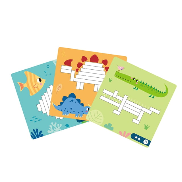 Dziecko może układać klocki magnetyczne na dołączonych planszach, dopasowując elementy do ilustracji z książeczki lub eksperymentując z własnymi pomysłami. Magnesy utrzymują elementy w odpowiednim miejscu, dzięki czemu zabawa jest wygodna także w podróży.