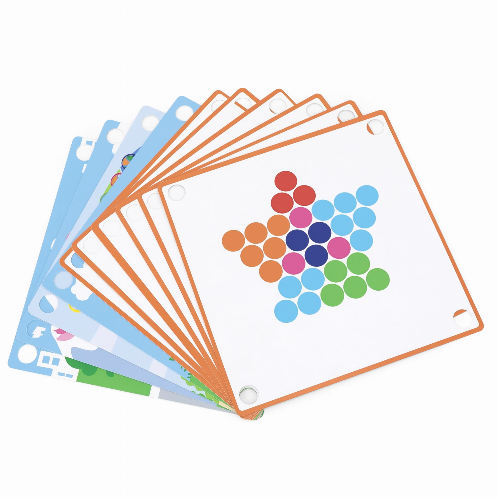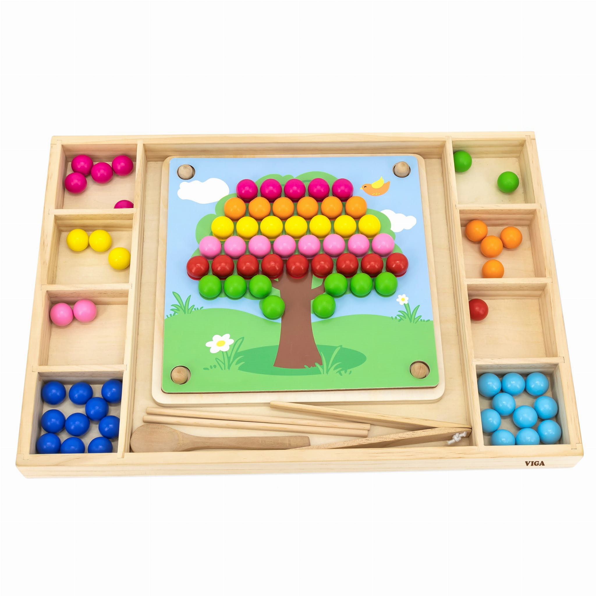 Drewniana gra "Złap i dopasuj" marki Viga. Zadanie dzieci jest nie tylko dopasowywać kolory według wzoru na papierze, ale także tworzyć więcej wzorów dzięki swojej wyobraźni. Ta gra może ćwiczyć koordynację ręka-oko i koncentrację dziecka. Dzieci mogą przymocować ulubiony papier do drewnianej tacy. Za pomocą pałeczek, łyżki lub spinacza przyczepić kulki do otworów na desce według wzorów i kolorów, a na koniec ułożyć je w piękny obrazek.