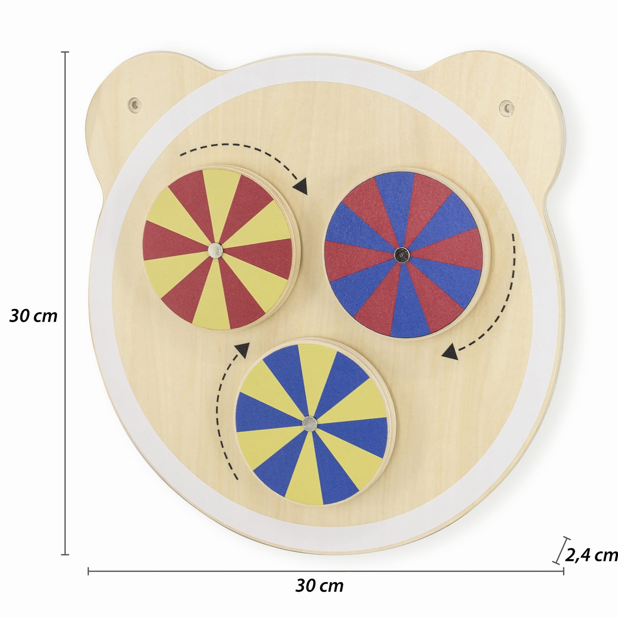 Jedna z serii drewnianych tablic z uroczą głową misia. Tablica z trzema kółkami, które zostały odpowiednio pomalowane, aby poprzez kręcenie wywoływać złudzenia optyczne. Zabawka pomaga w rozwijaniu logicznego myślenia u dzieci, pomaga również w nauce kolorów. Produkt idealnie sprawdzi się zarówno w domowym zaciszu, jak i w placówkach oświatowych, wczesnoszkolnych. Ciekawe przygotowanie formy tablicy z pewnością przykuje uwagę każdego malucha. Całość wykonana została z drewna lakierowanego i pomalowana nietoksycznymi farbami w żywe barwy, które zadowolą każdego użytkownika i dadzą mnóstwo radości z zabawy. Produkt przeznaczony dla dzieci od 18 miesiąca życia. W naszej ofercie dostępna jest cała seria tablic z głową misia.