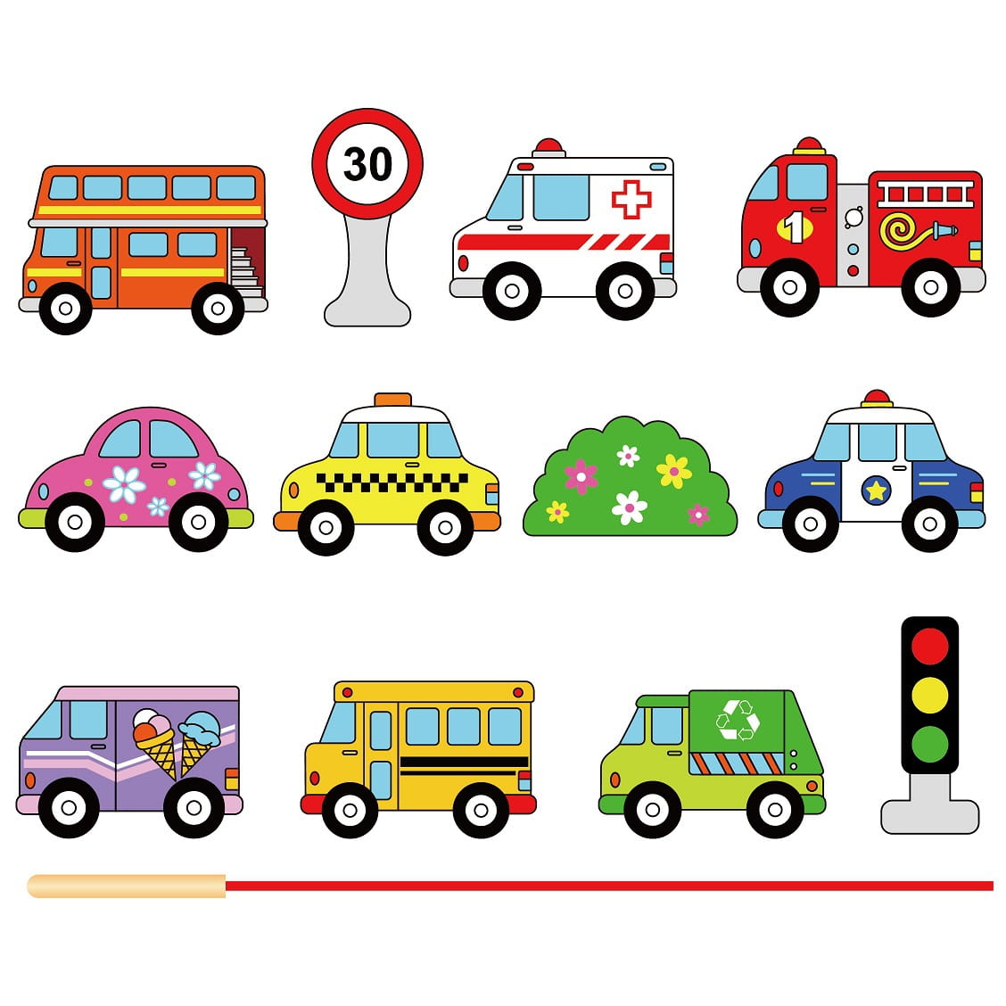 W zestawie 12 elementów, m.in.: autobusy, kolorowe samochodziki, radiowóz, znak drogowy, sygnalizacja świetlna i inne. Zabawka stymuluje wyobraźnię, ćwiczy zdolności manualne i wzrokowe.
