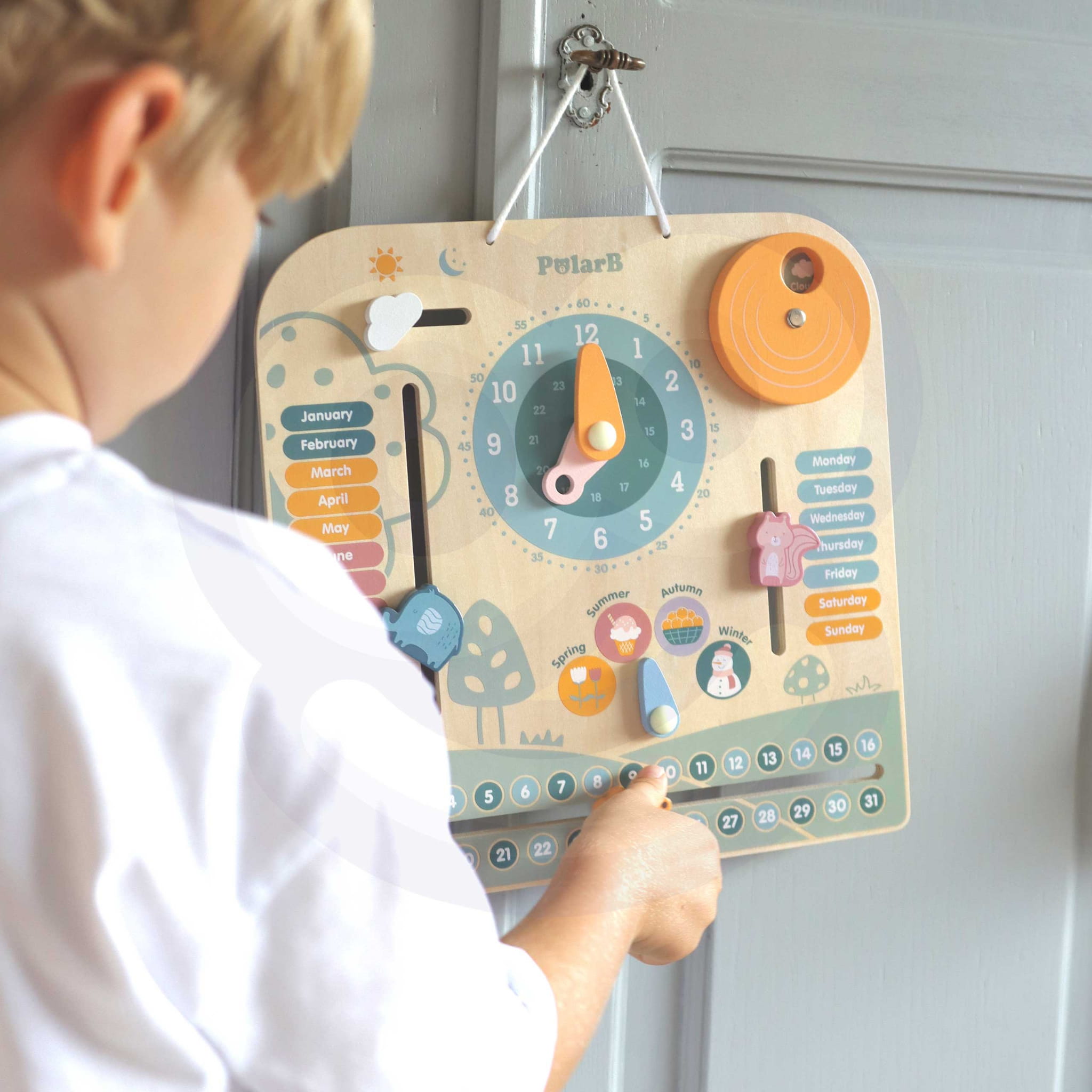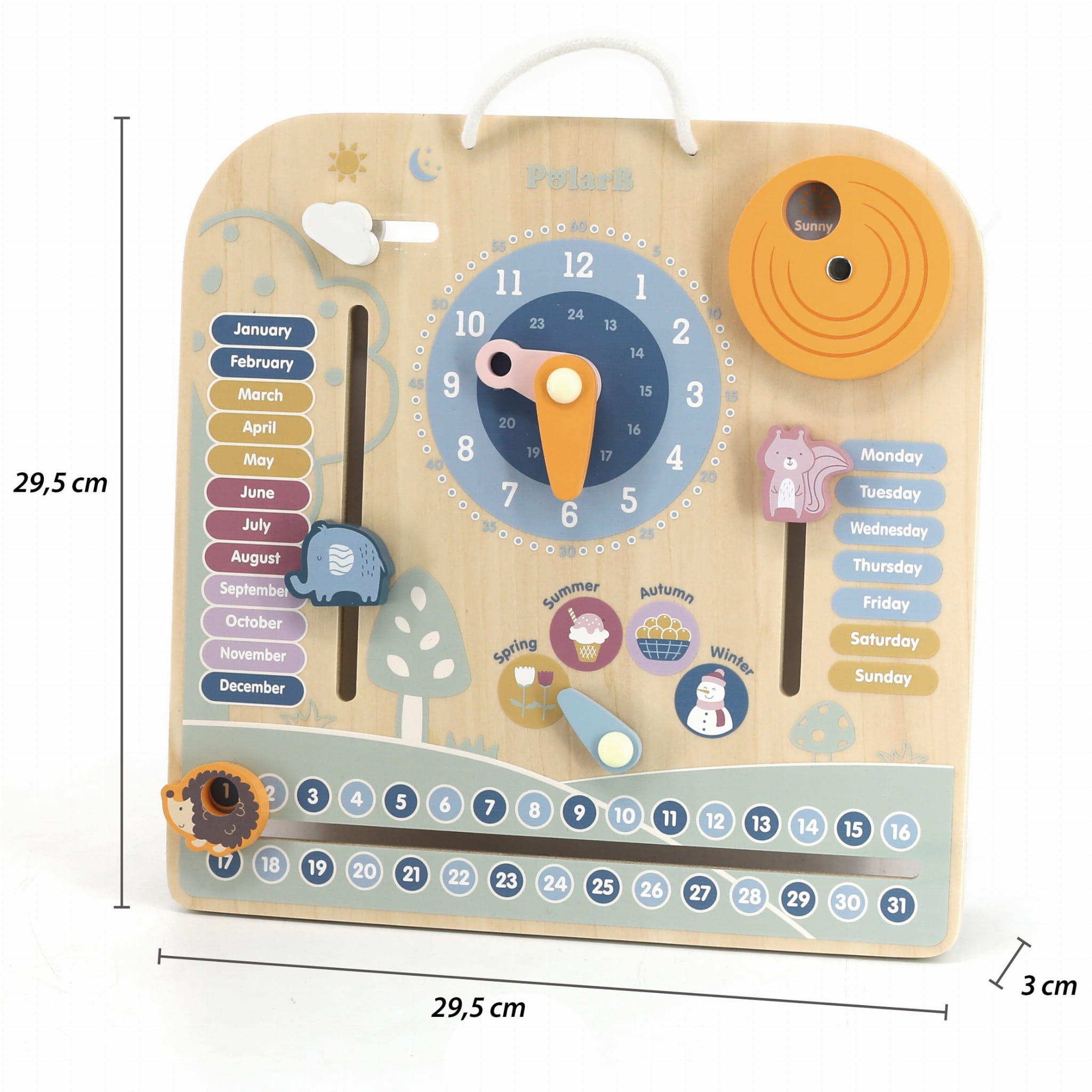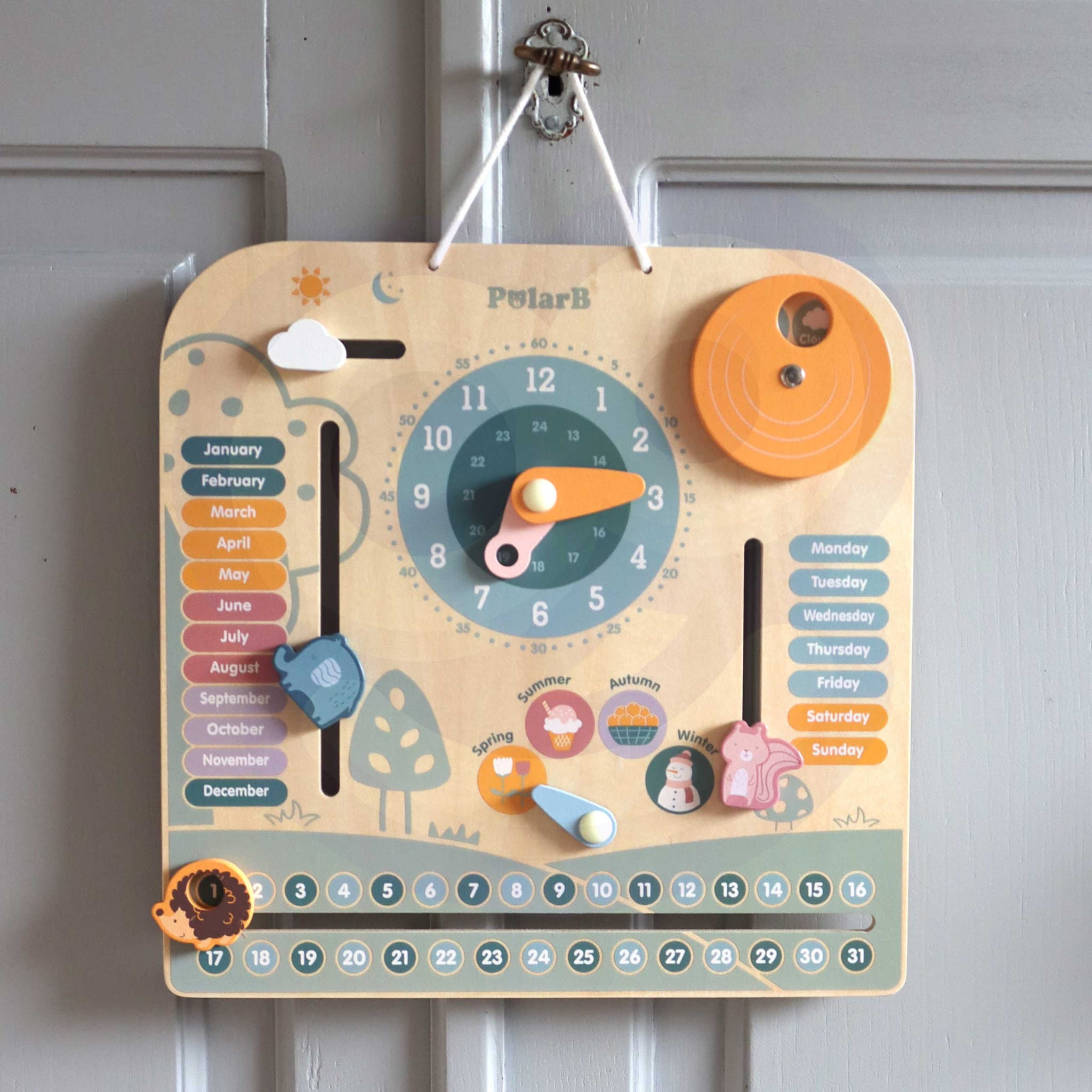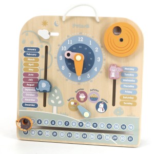 - - drewniana zabawka z zegarem i oznaczeniami: dni tygodnia, miesięcy, pór roku oraz pogody,