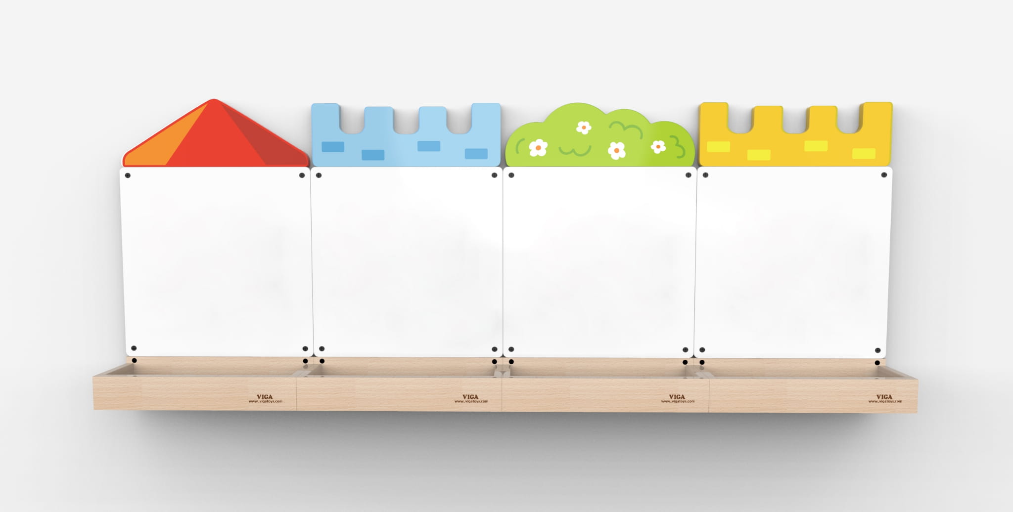 W skład zestawu Tablic Magnetycznych Ściennych VIGA Zamek wchodzą drewniane plansze z wieżami i koroną drzewa, oraz cztery tablice magnetyczne. Ten magiczny zestaw pobudzi wyobraźnię każdego dziecka, zapewniając radość oraz wyjątkowy rozwój umiejętności. Dzięki niemu maluchy będą miały niezliczone możliwości twórczego wyrażania siebie, rozwijania wyobraźni i zdobywania nowej wiedzy.