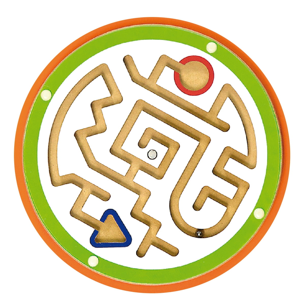 - Labirynt- przeprowadź kuleczkę od trójkąta do koła. Dziecko obracając kołem labiryntu kieruje kulką – prowadzi ją przez labirynt, jednocześnie ćwicząc zdolności manualne rękę oraz koordynację wzrokowo-ruchową.