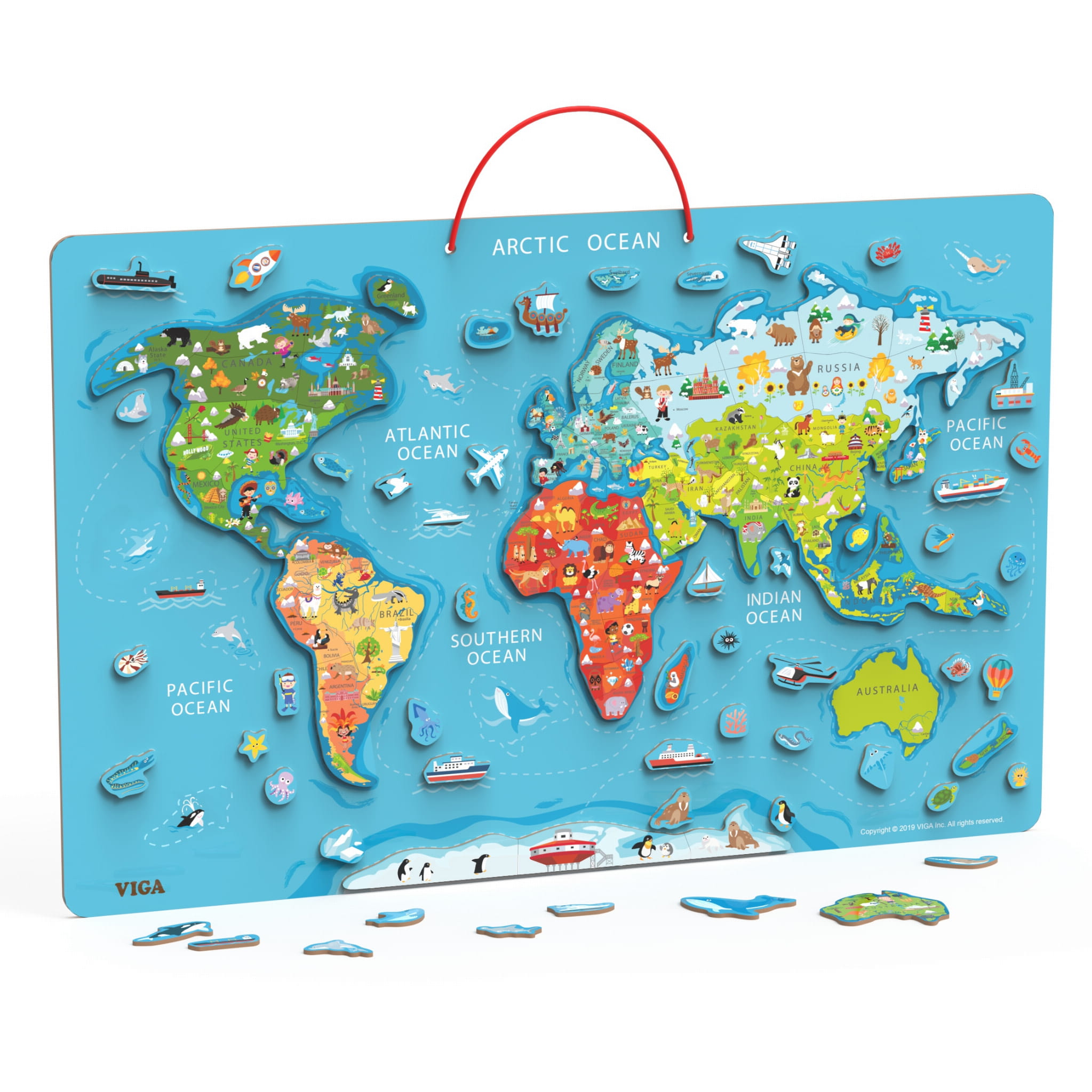 Tablica Edukacyjna 2w1 z magnetyczną Mapą Świata marki Viga, która jest jednocześnie tablicą do rysowania, to idealna zabawka dla ciekawych świata młodych odkrywców! Pięknie wykonana tablica z magnetycznymi elementami łączy walory edukacyjne z dobrą zabawą. Umieść drewniane elementy – kontynenty, statki, samoloty, rakiety oraz zwierzęta zamieszkujące dno oceanów. Mapa opisana językiem angielskim, doskonale wspomoże naukę języka angielskiego.